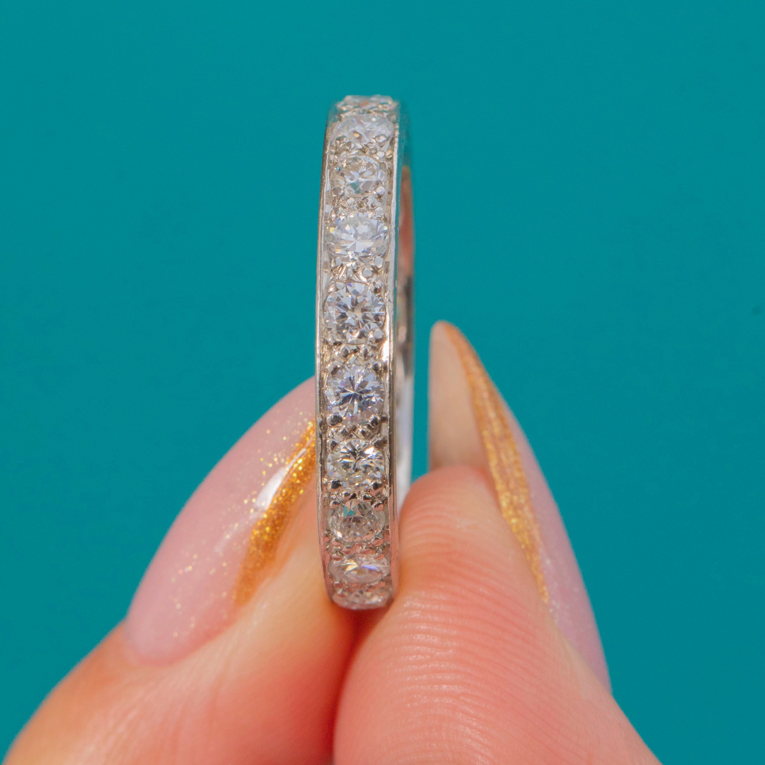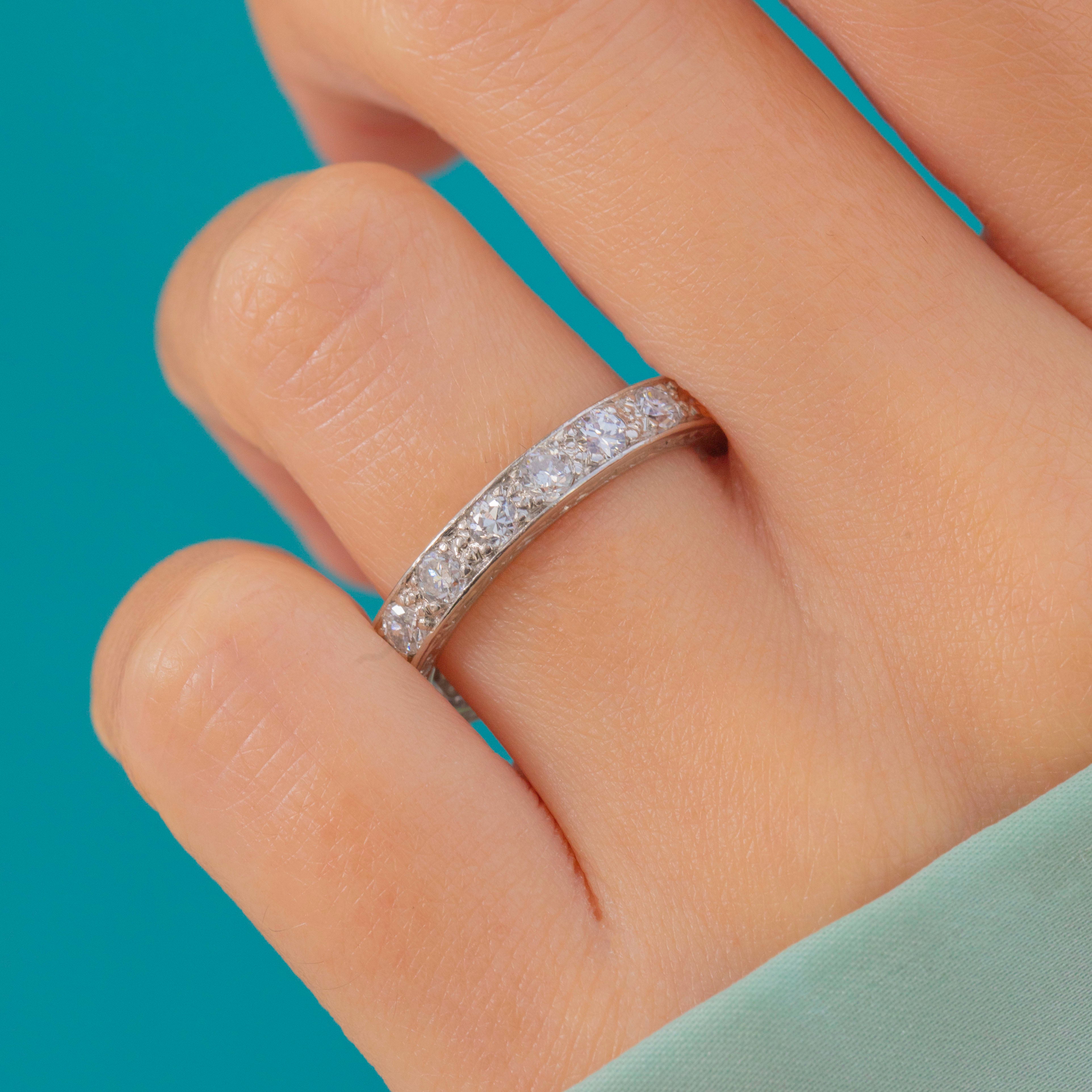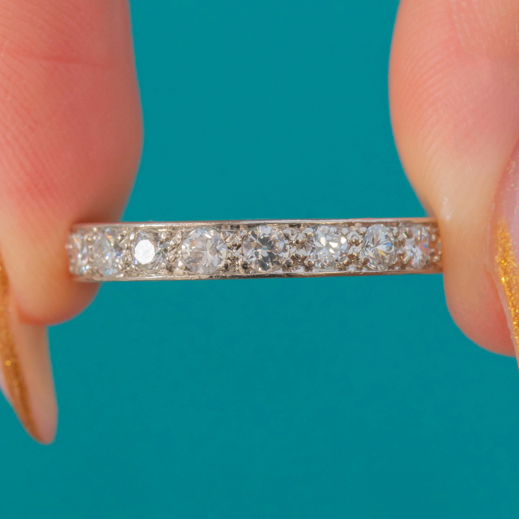 This spectacular Art Deco Platinum eternity ring shimmers with 1.60 carats of bright, white old European-cut Diamonds set all the way around. Each hand-cut stone radiates with vintage brilliance, creating a seamless band of light and luxury. The Diamonds are well-matched in colour and clarity, highlighting the exceptional craftsmanship of the 1930s.