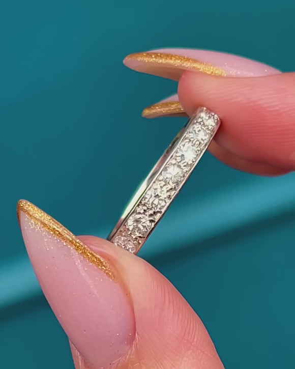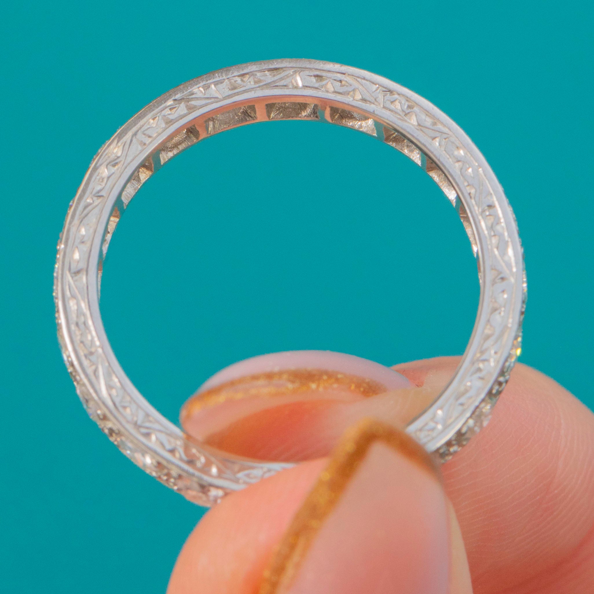 Classic, refined, and endlessly wearable, this full eternity band is the perfect symbol of enduring love or an elegant statement piece in its own right. The Platinum band is delicately engraved along the edges — a timeless detail that adds that signature Art Deco finesse.