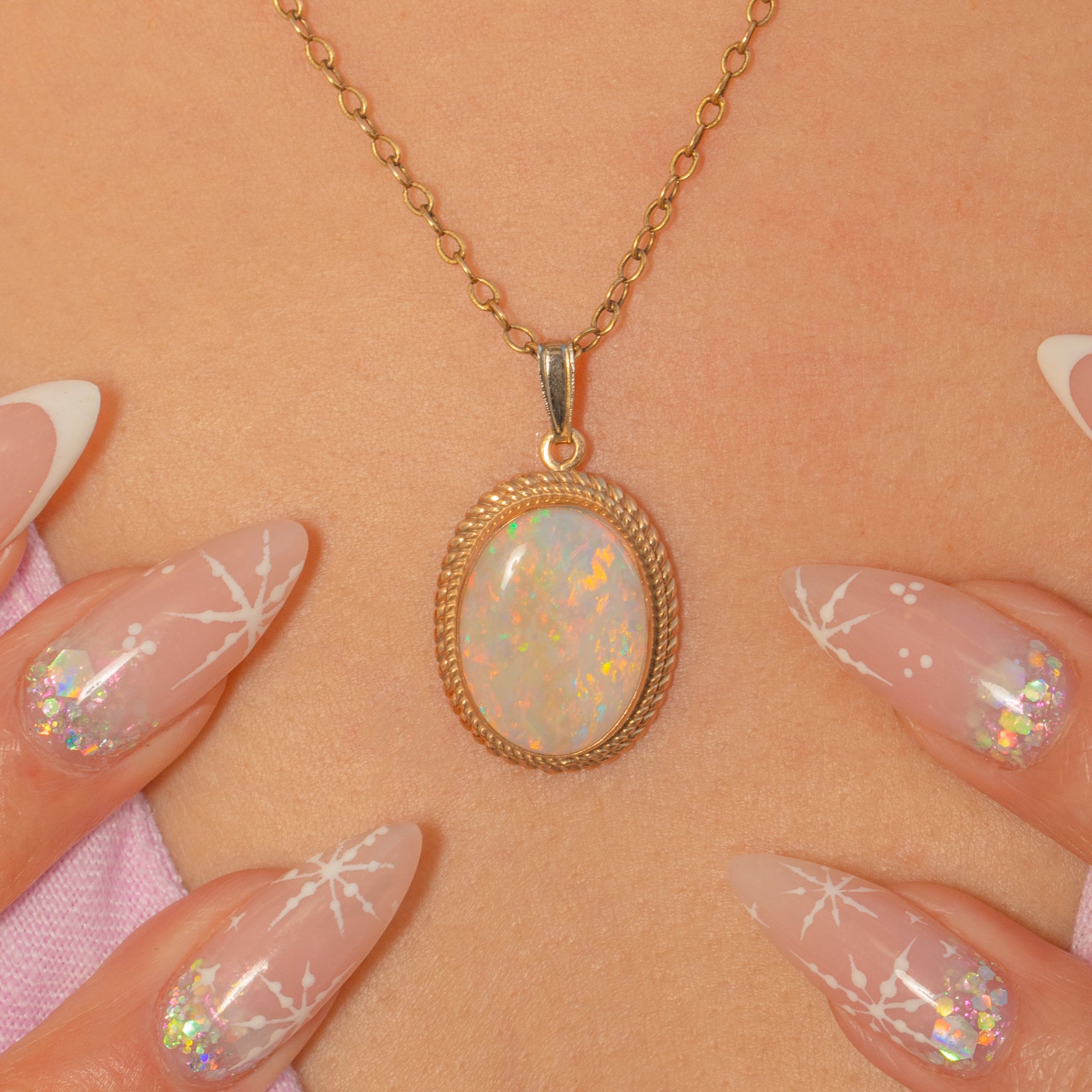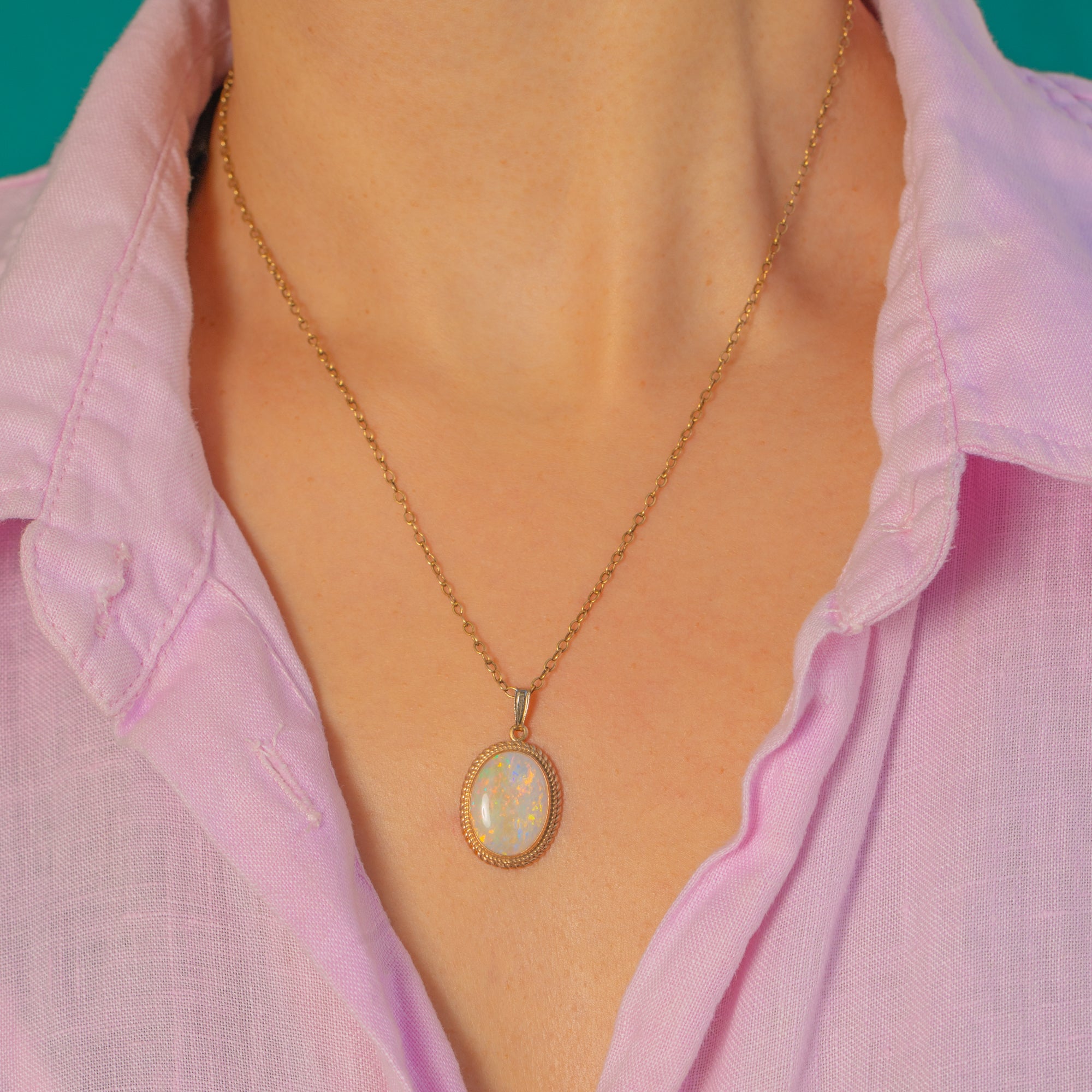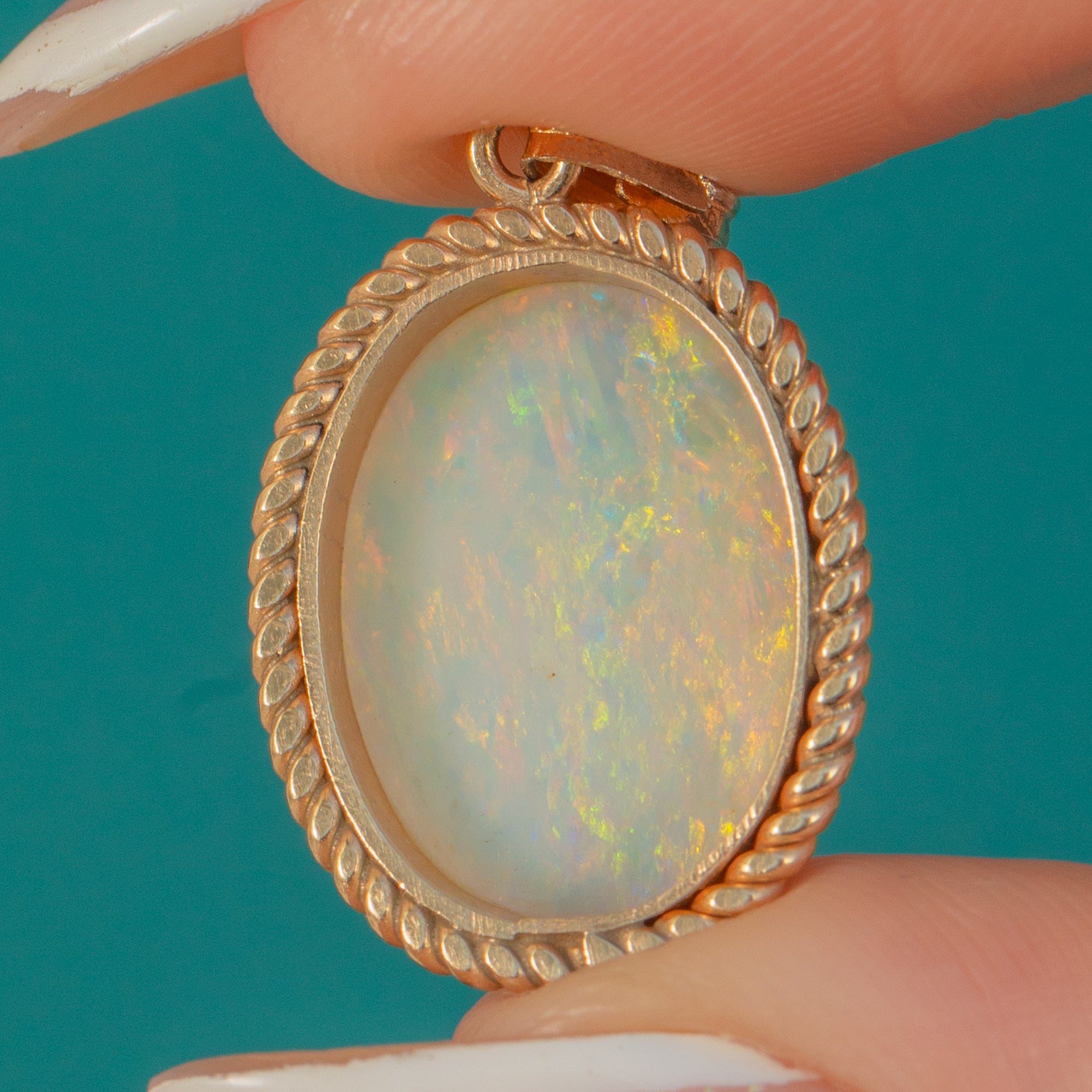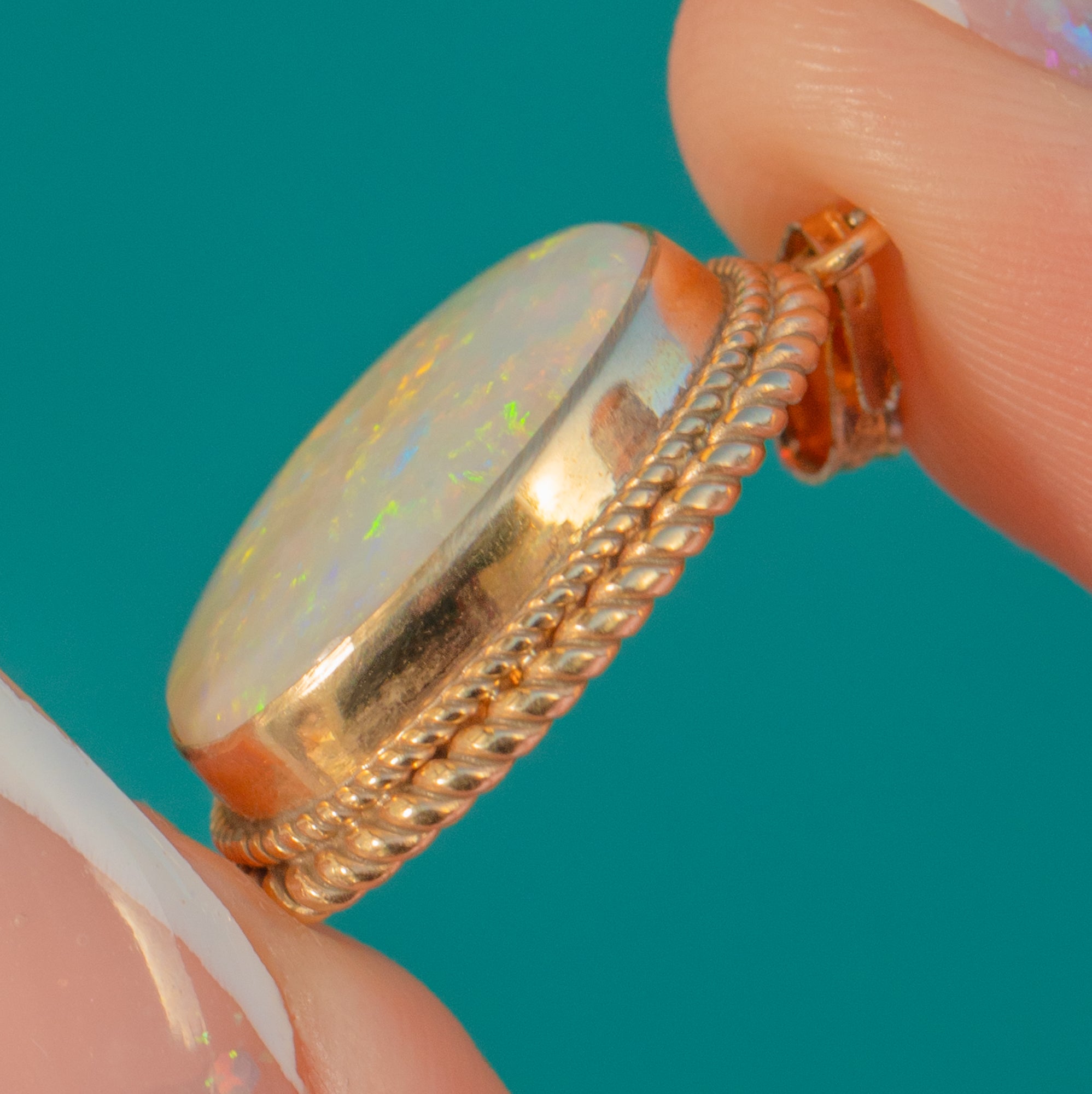This vintage Opal pendant is a gorgeous showcase of classic design, featuring a glowing natural solid Opal framed by an elegant 9ct Gold rope border. The 1.70ct Opal has beautiful play of colour, with lively flashes that dance across the surface as it moves.