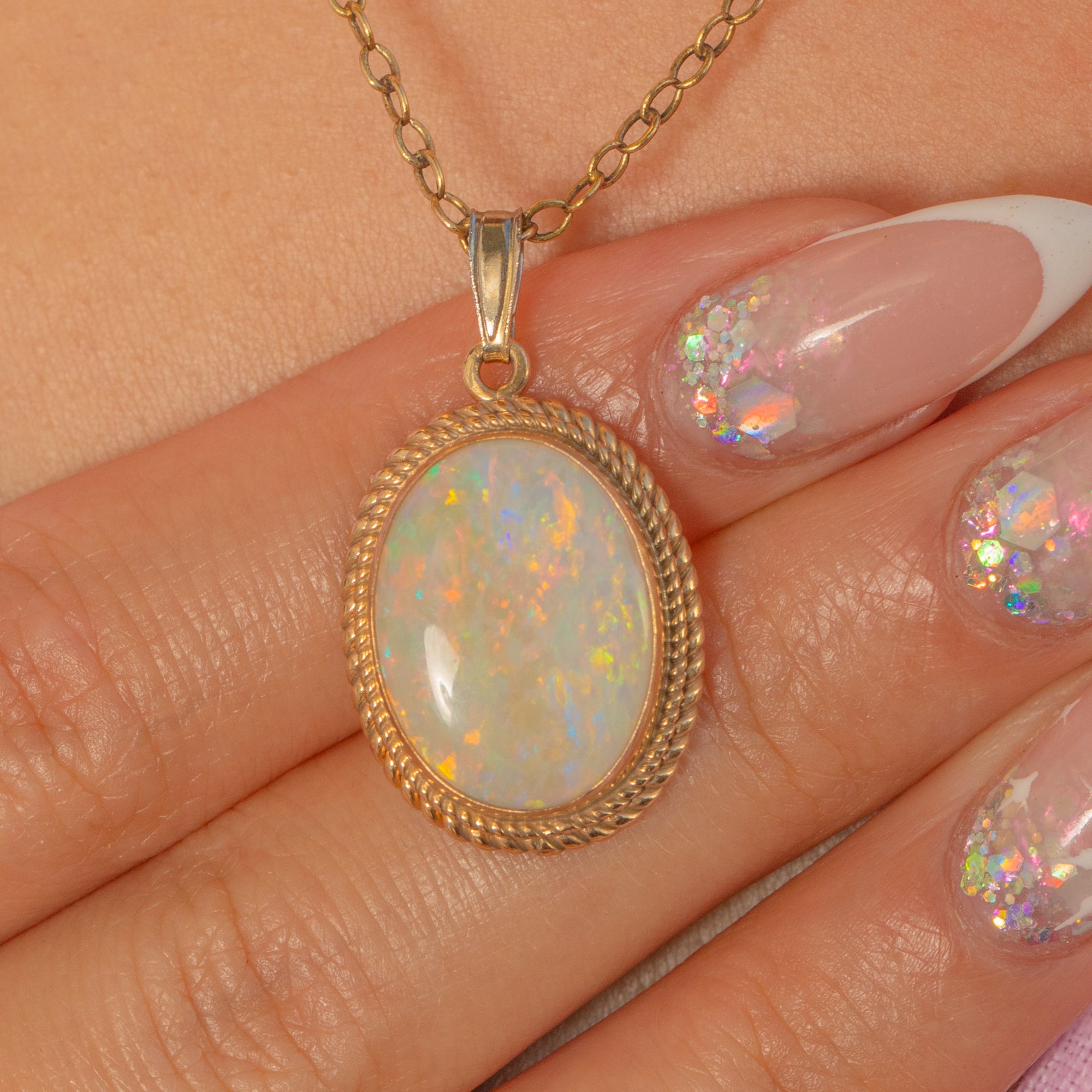 EXCELLENT: The Opal is in excellent condition with no chips, cracks or noticeable surface wear and displays vibrant flashes of colour. The Gold setting and rope border are crisp with only light surface marks from gentle wear, and the hallmarks remain clear and legible.