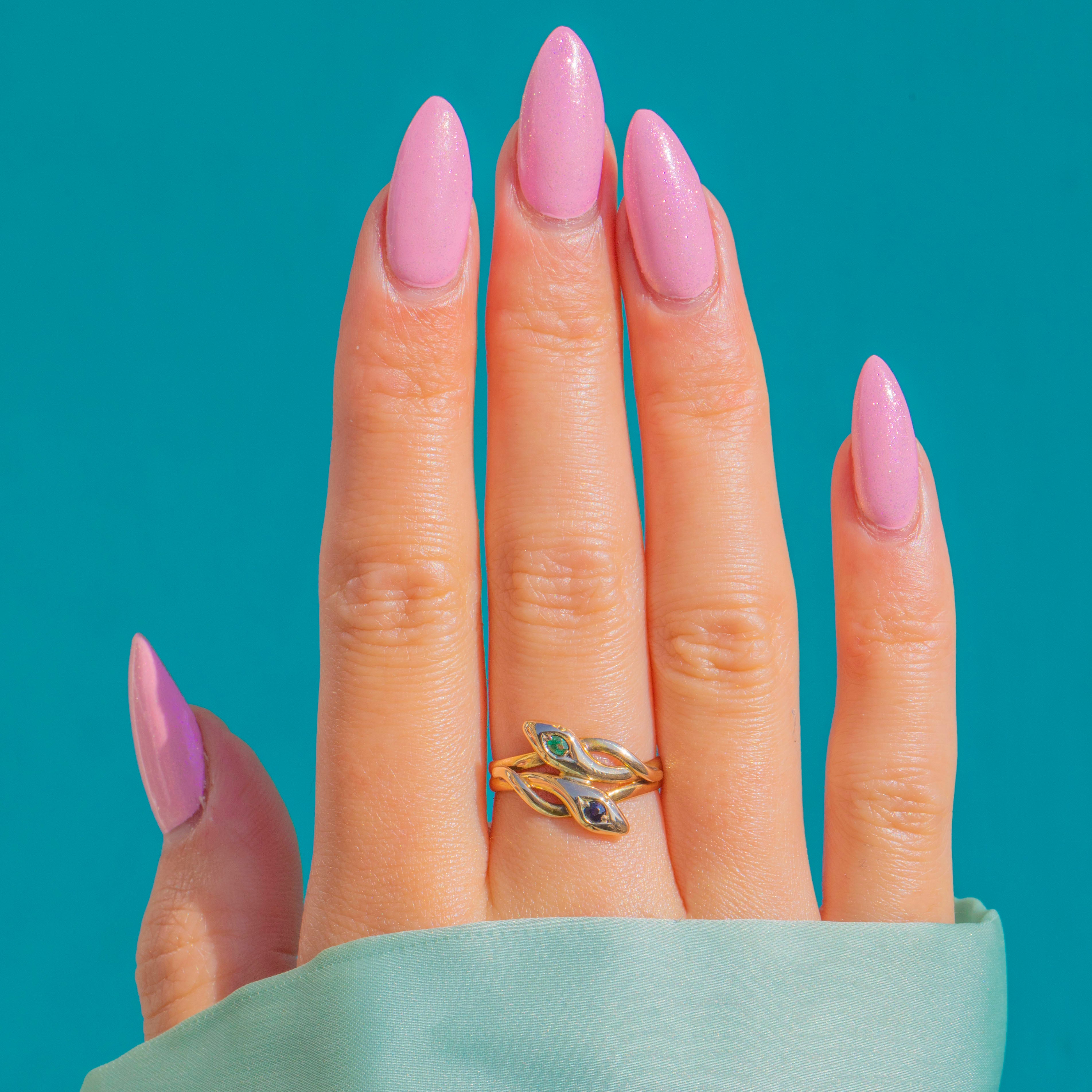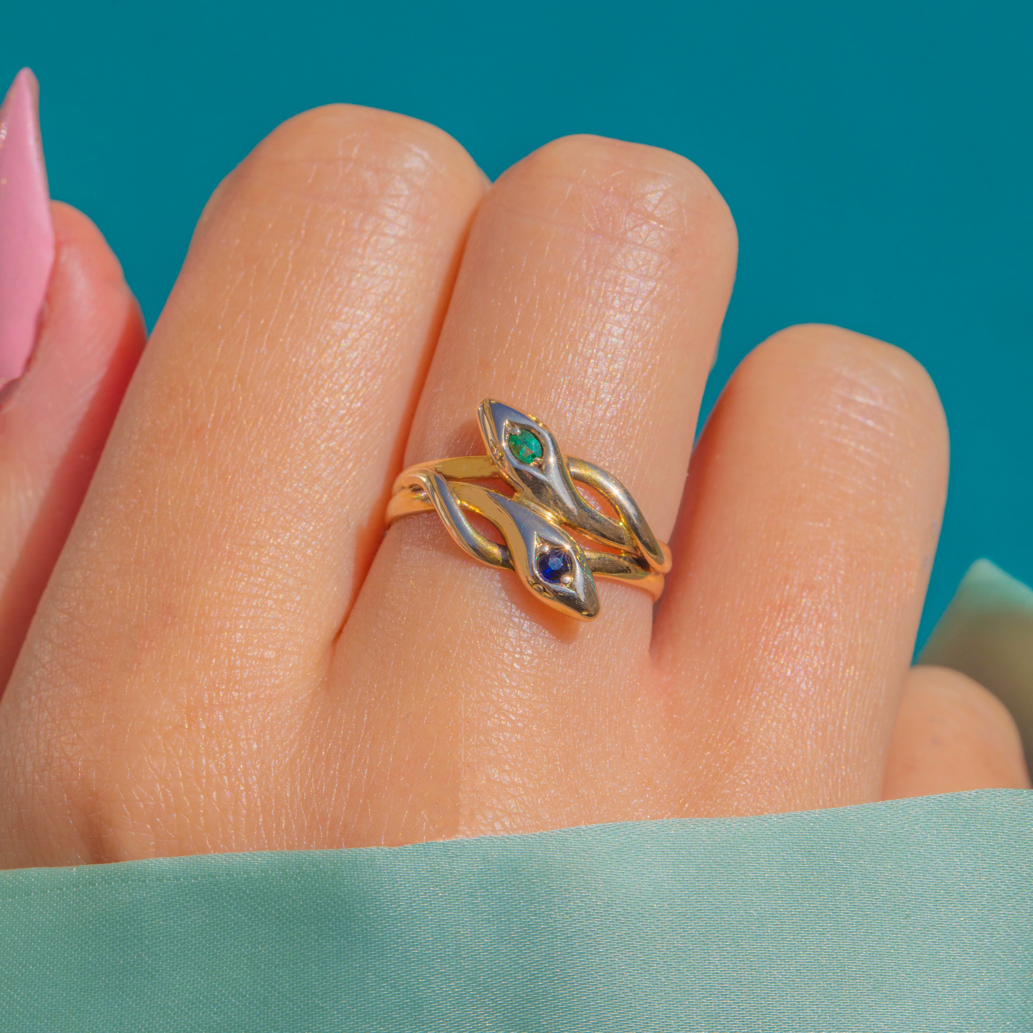 Sinuous and sculptural, this twisted Snake ring coils gracefully in 14ct Gold, its interwoven strands culminating in a duo of foliate heads. A vibrant Emerald and a deep, velvety Sapphire glint from sleek bezel settings, bringing a refined pop of colour to the organic, flowing silhouette.