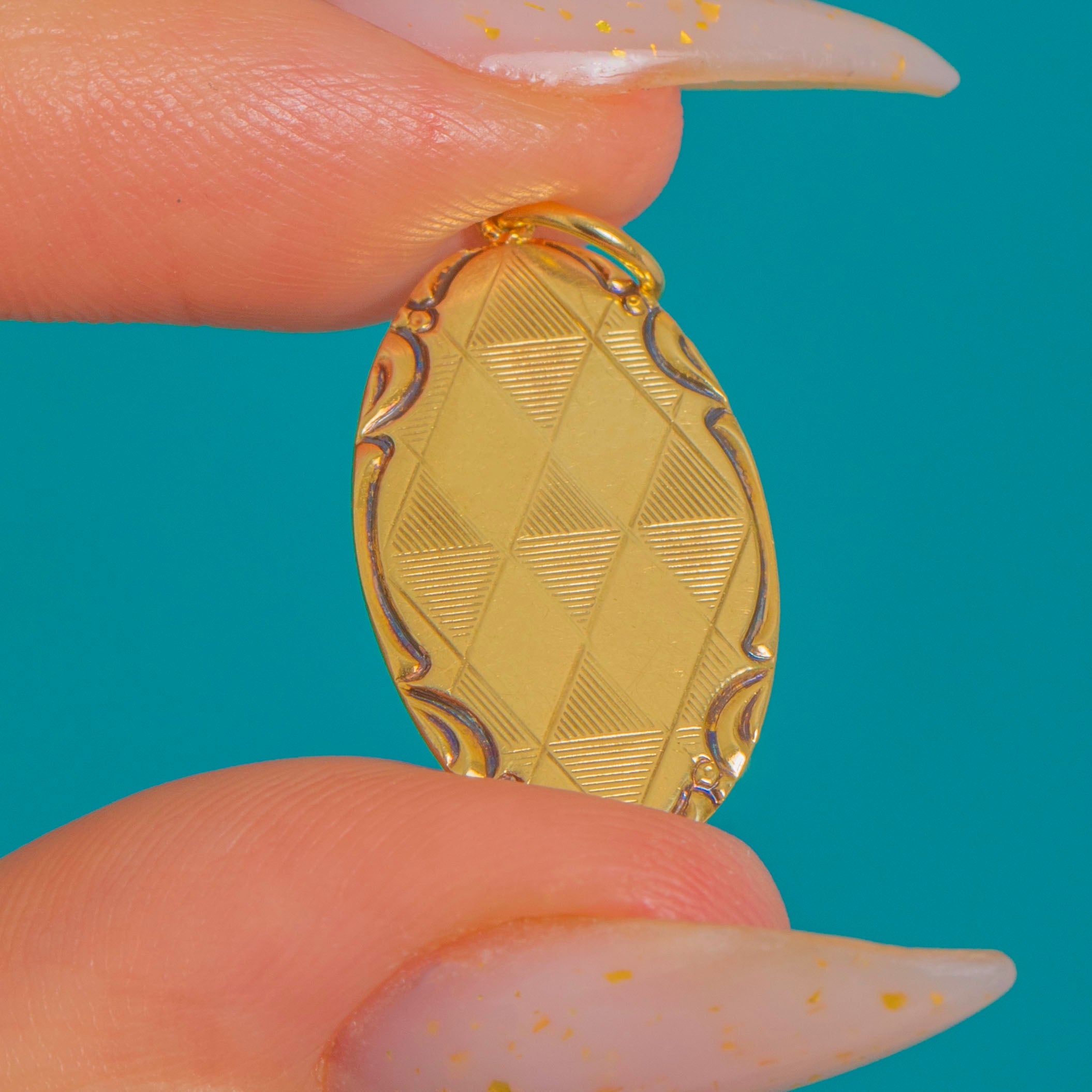 A petite Art Deco treasure in warm 14ct Gold, this engraved oval charm is refined and exquisitely detailed. The front is crisply engine-turned with a geometric lattice, framed by a raised border punctuated with subtle foliate scrolls, while the reverse is smooth and plain for a sleek finish.