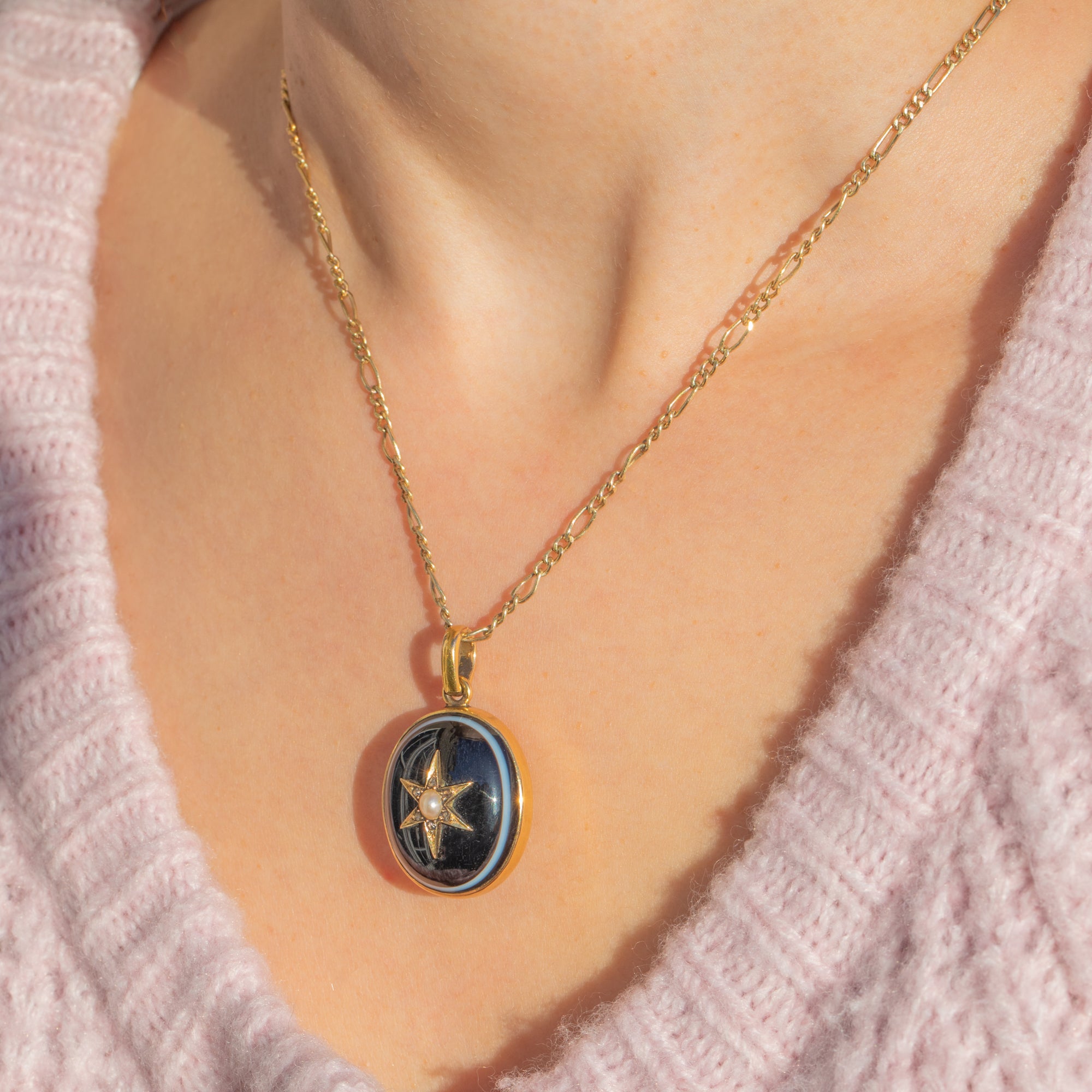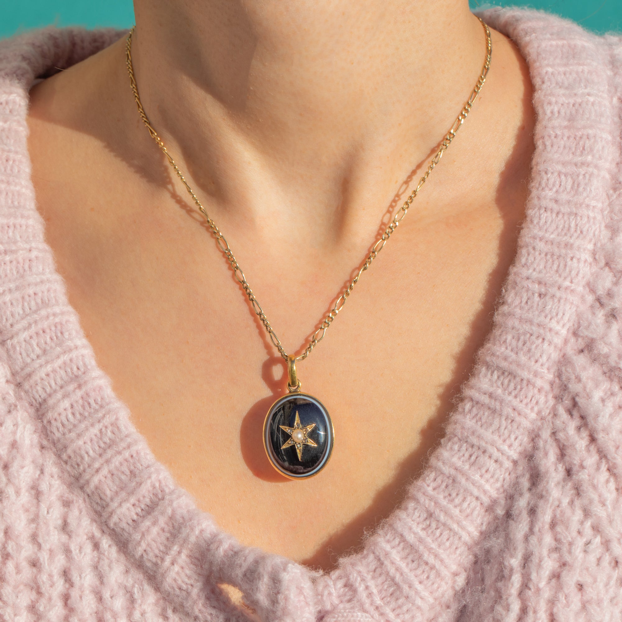 A celestial Victorian treasure in buttery 15ct Gold, this oval pendant pairs an inky black Agate with a domed glazed locket back. At its heart sits a luminous Pearl with twinkling Diamond highlights, the high-contrast palette giving that refined, keepsake allure we adore from the era.
