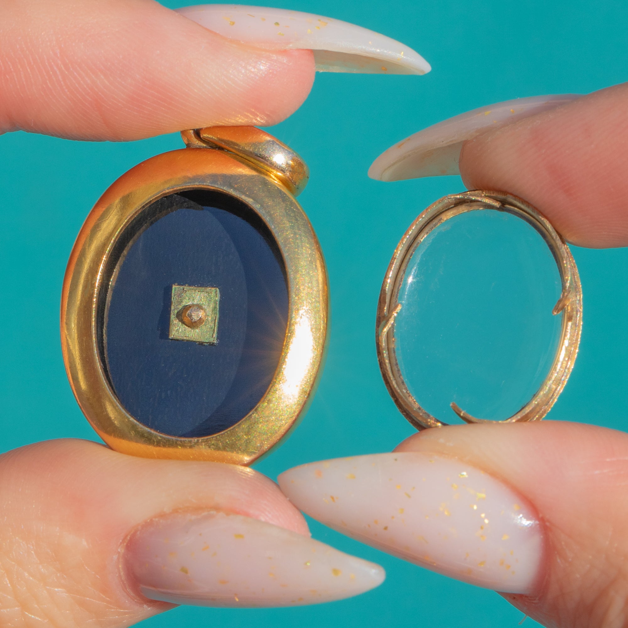 The removable glazed cover reveals a locket back, perfect for safeguarding a tiny memento while keeping the front impeccably elegant. Sleek, polished edges and a simple bail complete the look—bold yet beautifully restrained, with that unmistakable late-19th-century romance.