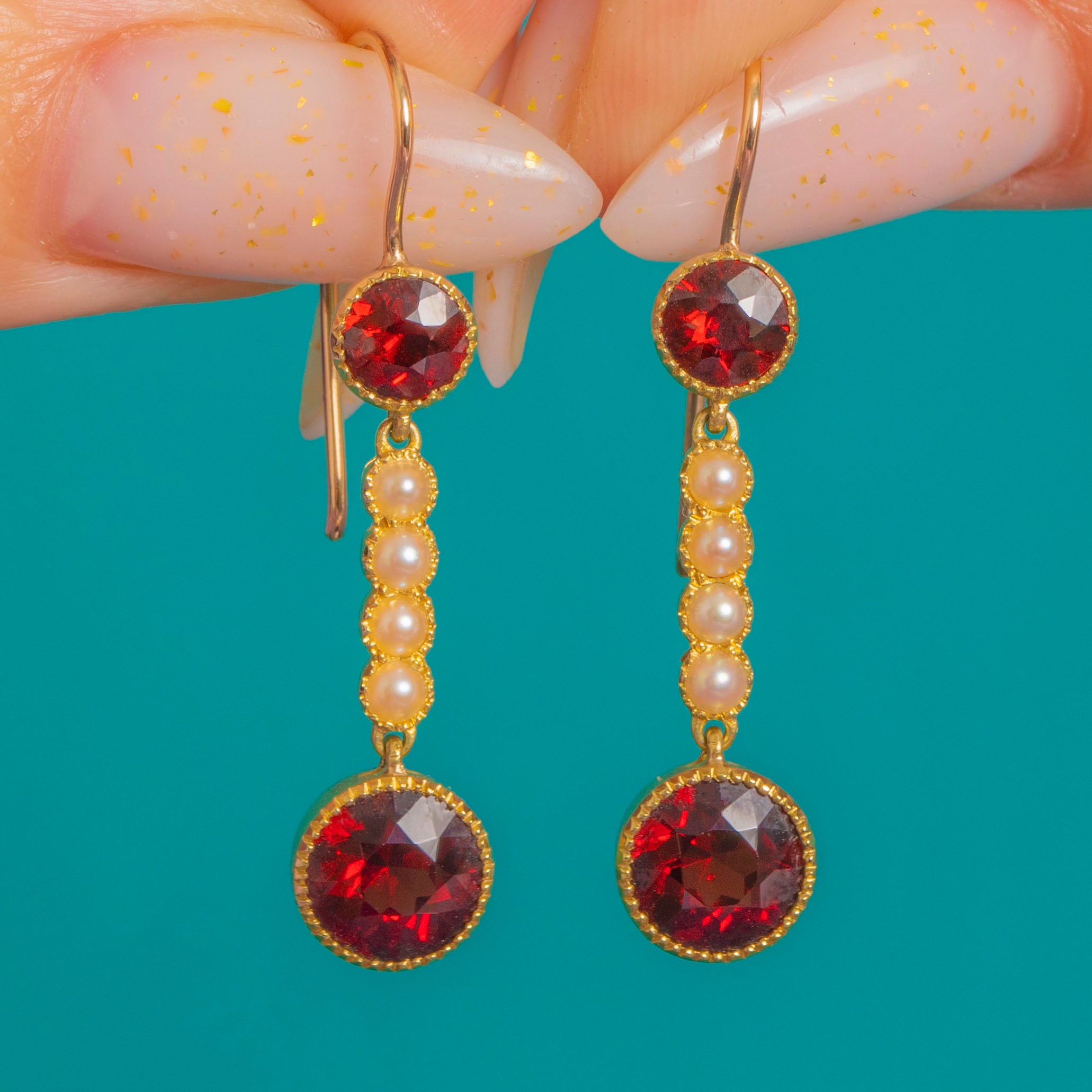 A graceful Victorian pair of articulated drop earrings, crafted in rich 15ct Gold and set with deep red round Garnets punctuated by a slender vertical line of creamy Seed Pearls. The design is beautifully balanced: a petite Garnet sits above the seed Pearl bar, leading the eye to a larger Garnet below, each stone framed by fine beaded, milgrain-edged collet settings that add delicate texture and antique charm.