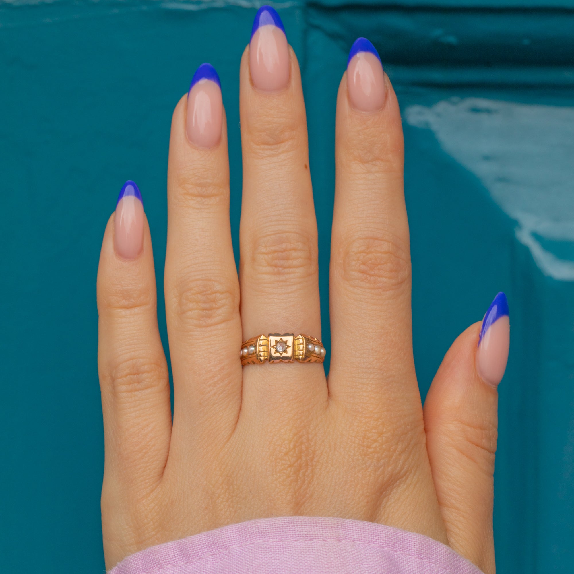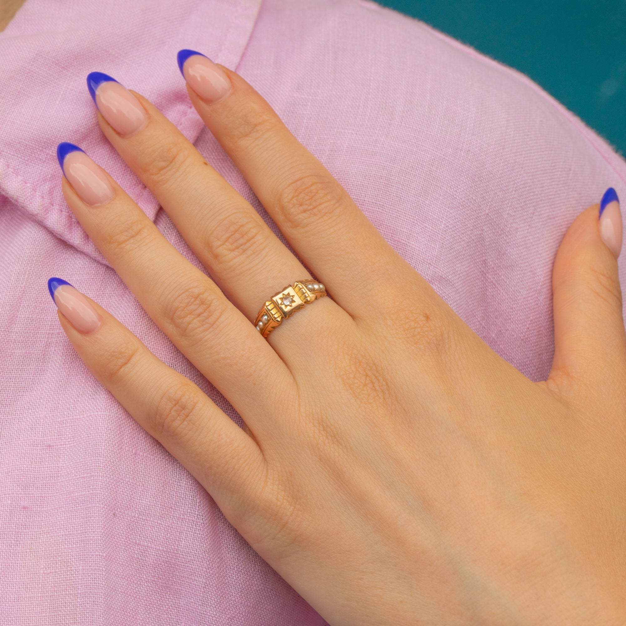 The star-set Diamond scintillates in the light, flanked by a row of creamy Pearls framed by a bold and geometric band. The unique form of this antique gypsy ring will instantly grab your attention and is sure to be admired for years to come!