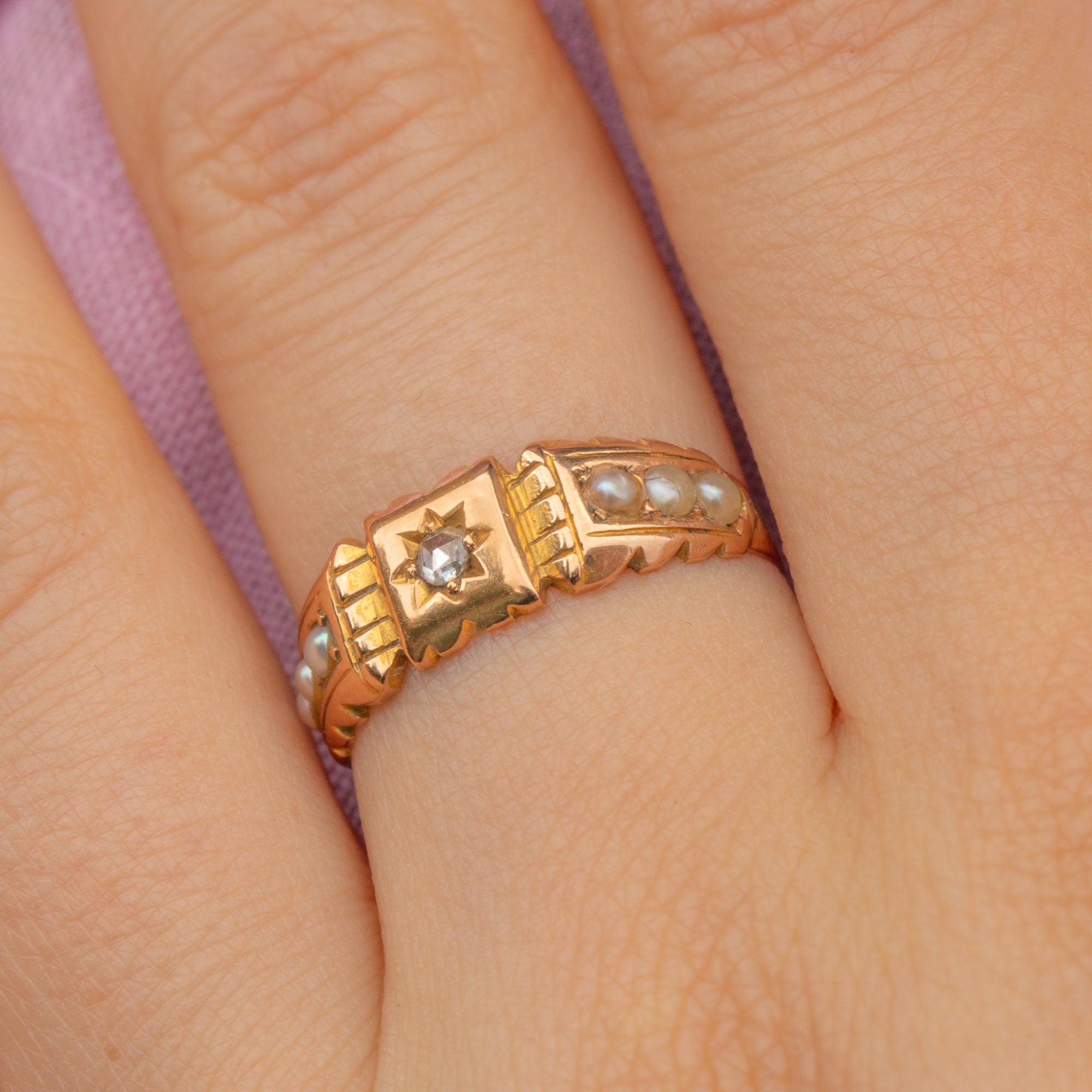 15ct Gold Rose-Cut Diamond Pearl Gypsy Ring, c.1894