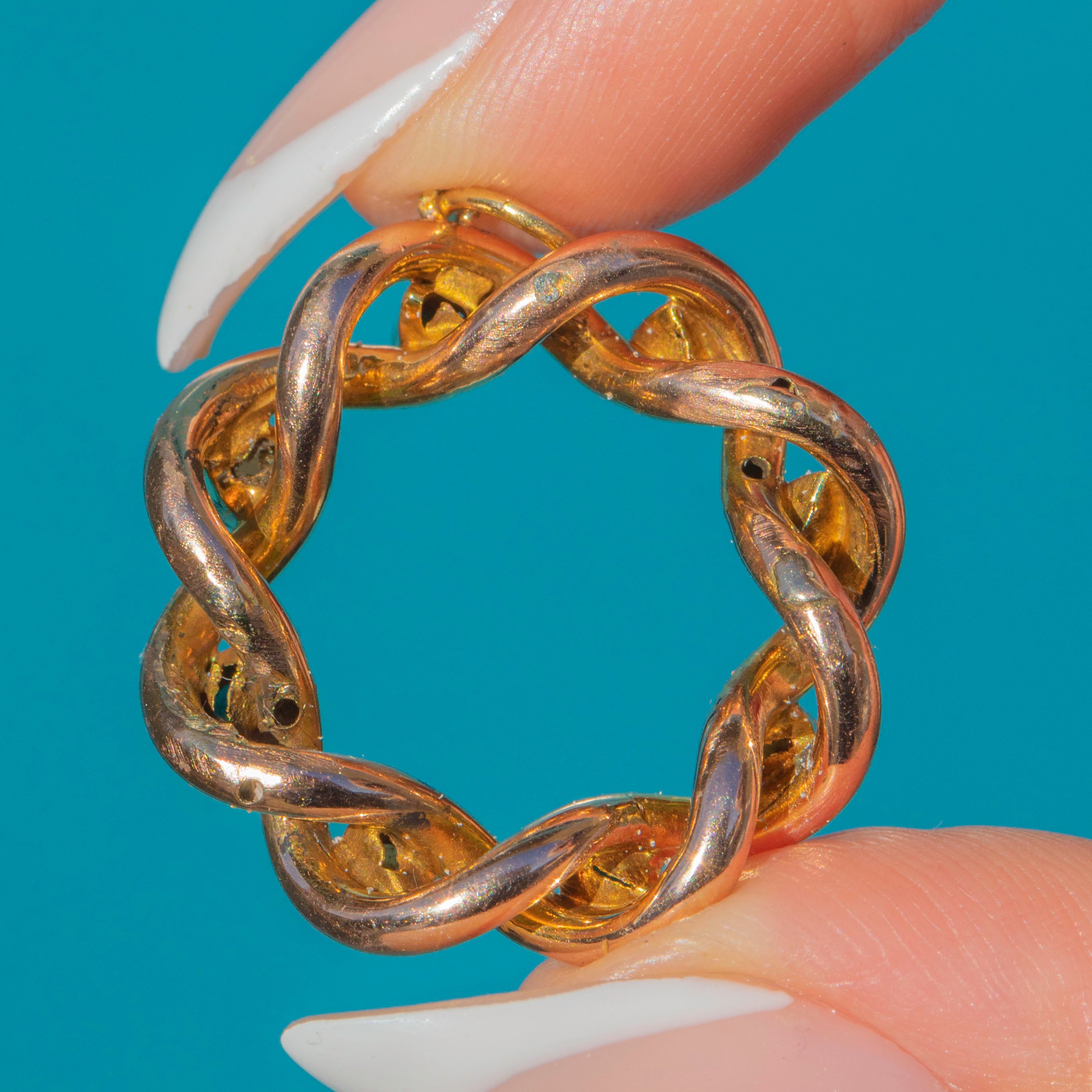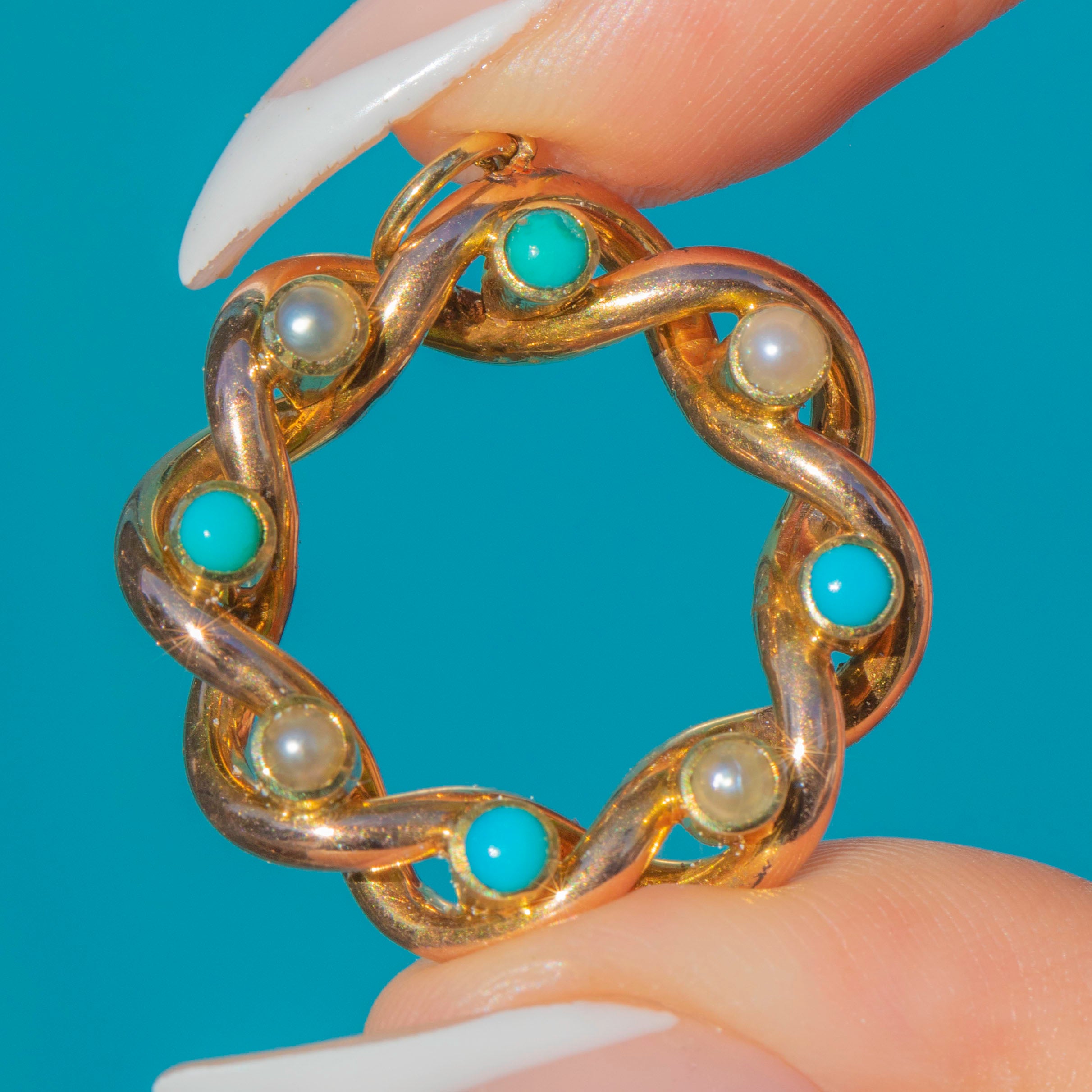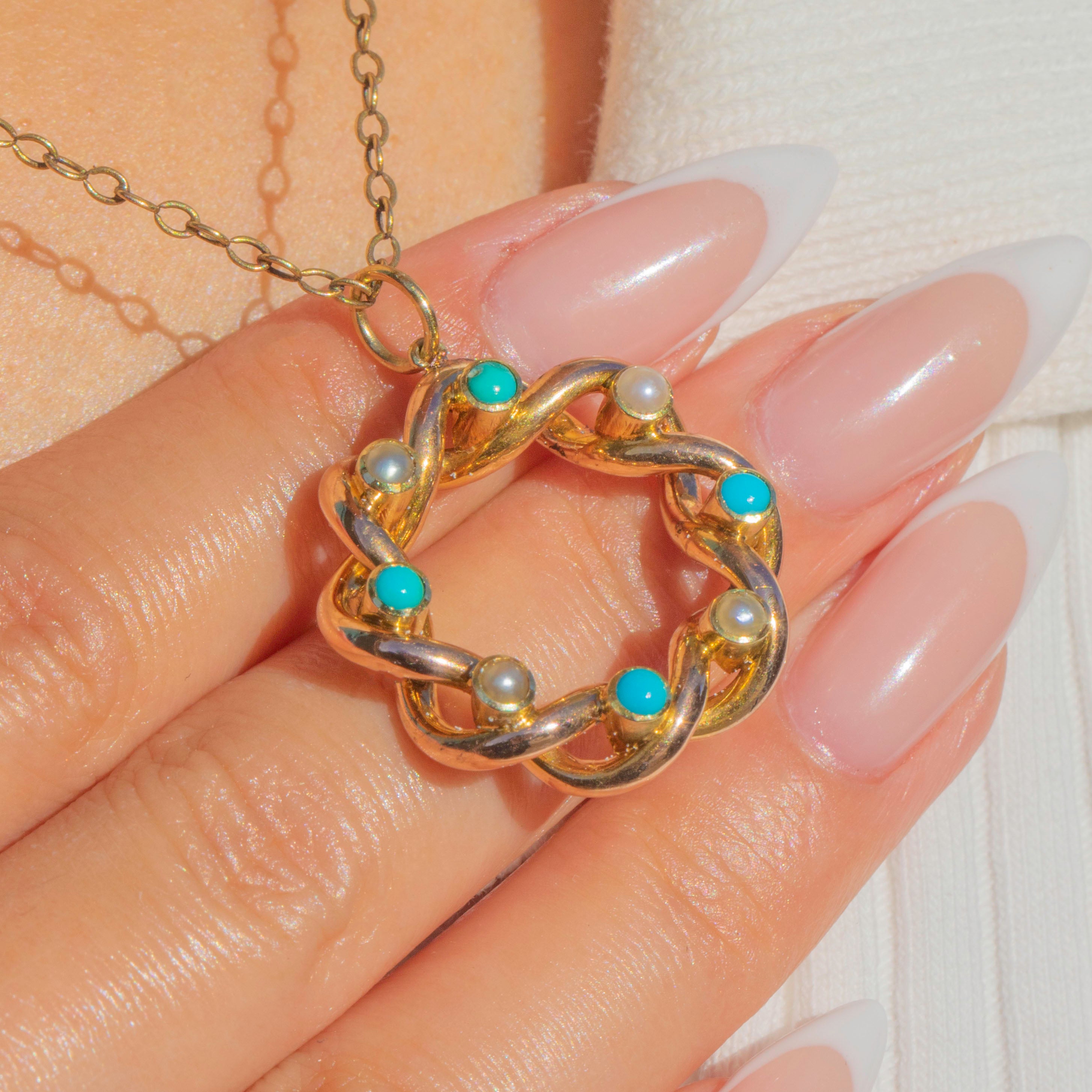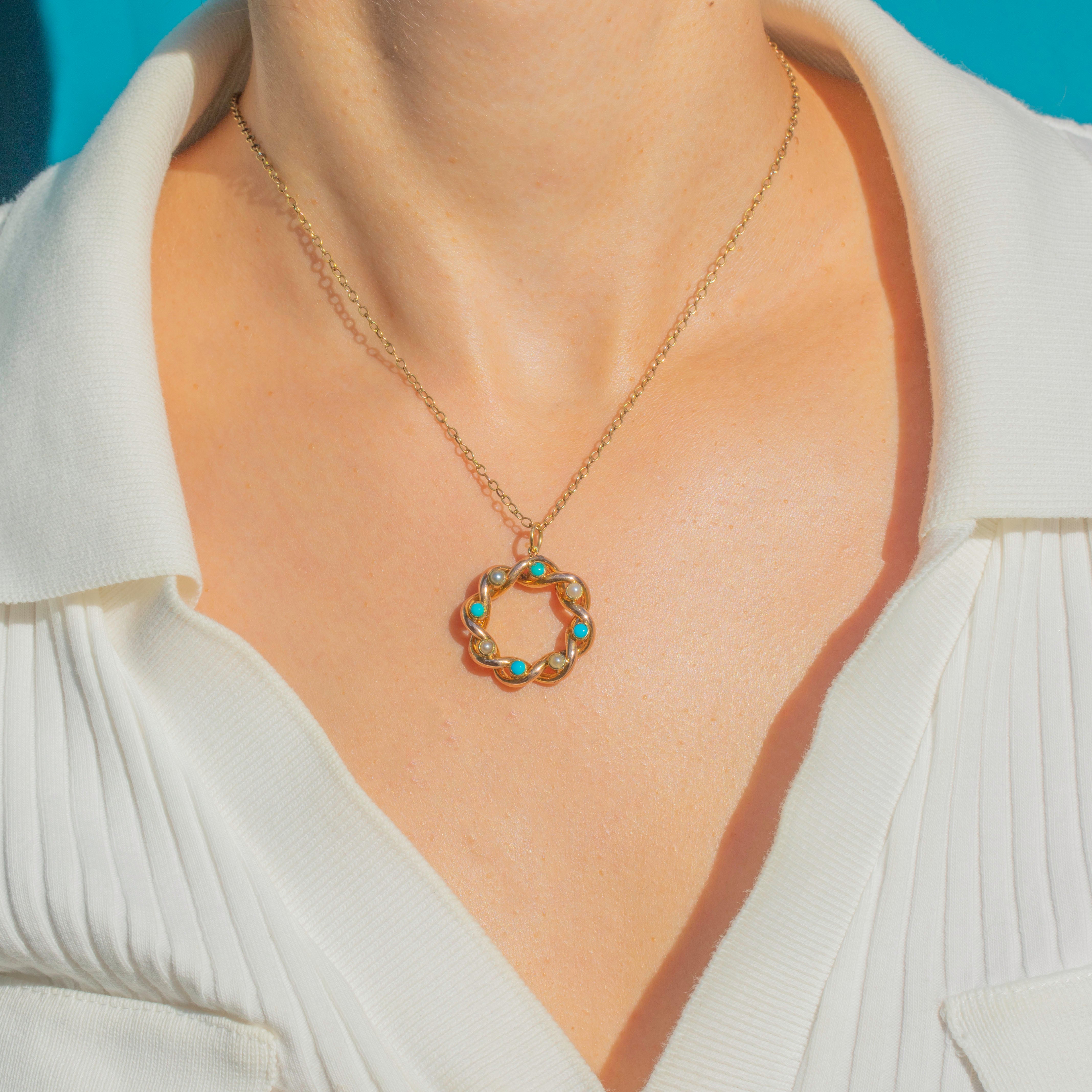 This Antique pendant is crafted in 15ct Gold and designed as a twisted roundel, delicately set with alternating natural Pearls and Turquoise cabochons. The combination of creamy Pearls and vibrant sky-blue Turquoise creates a striking contrast, while the rope-twist detail adds texture and depth.