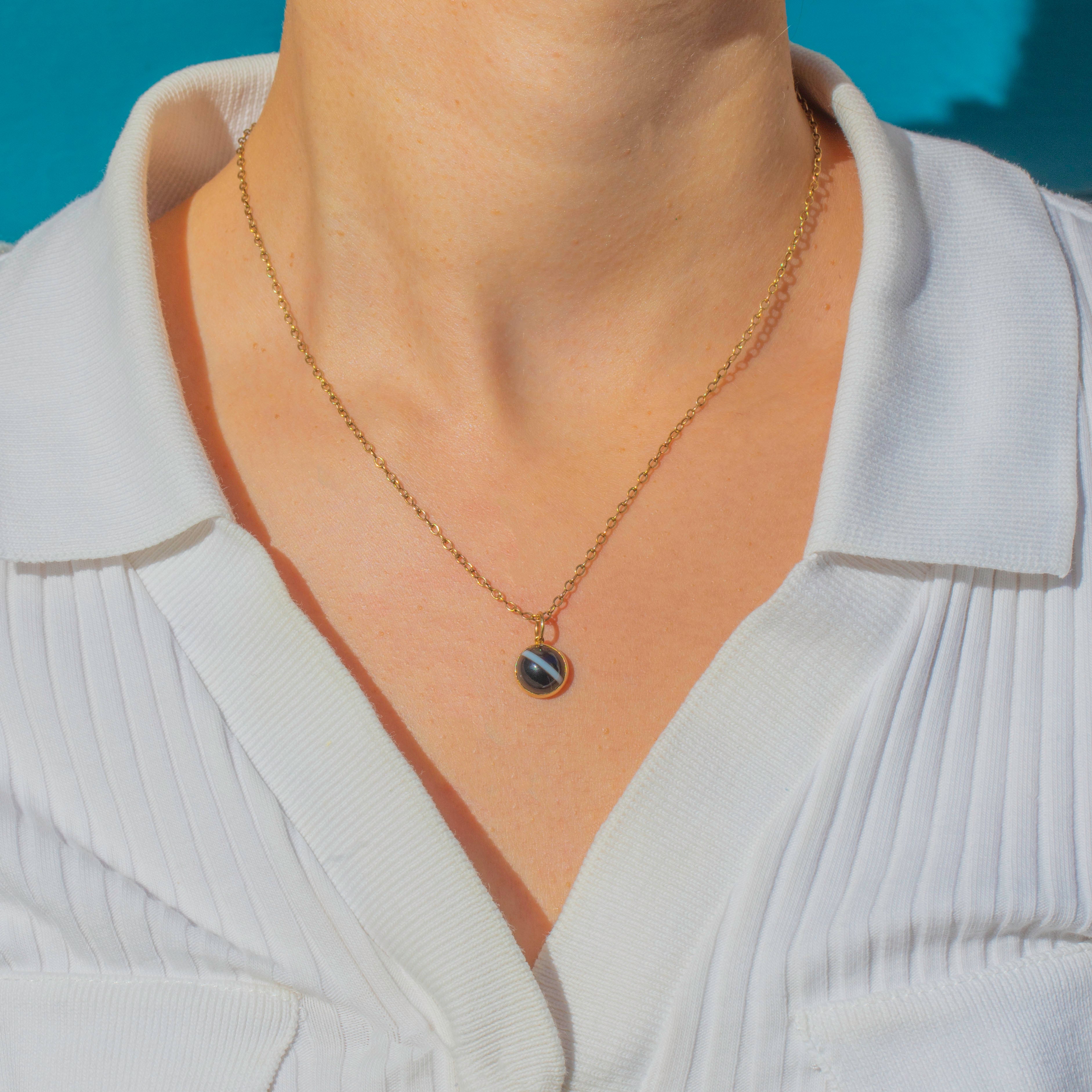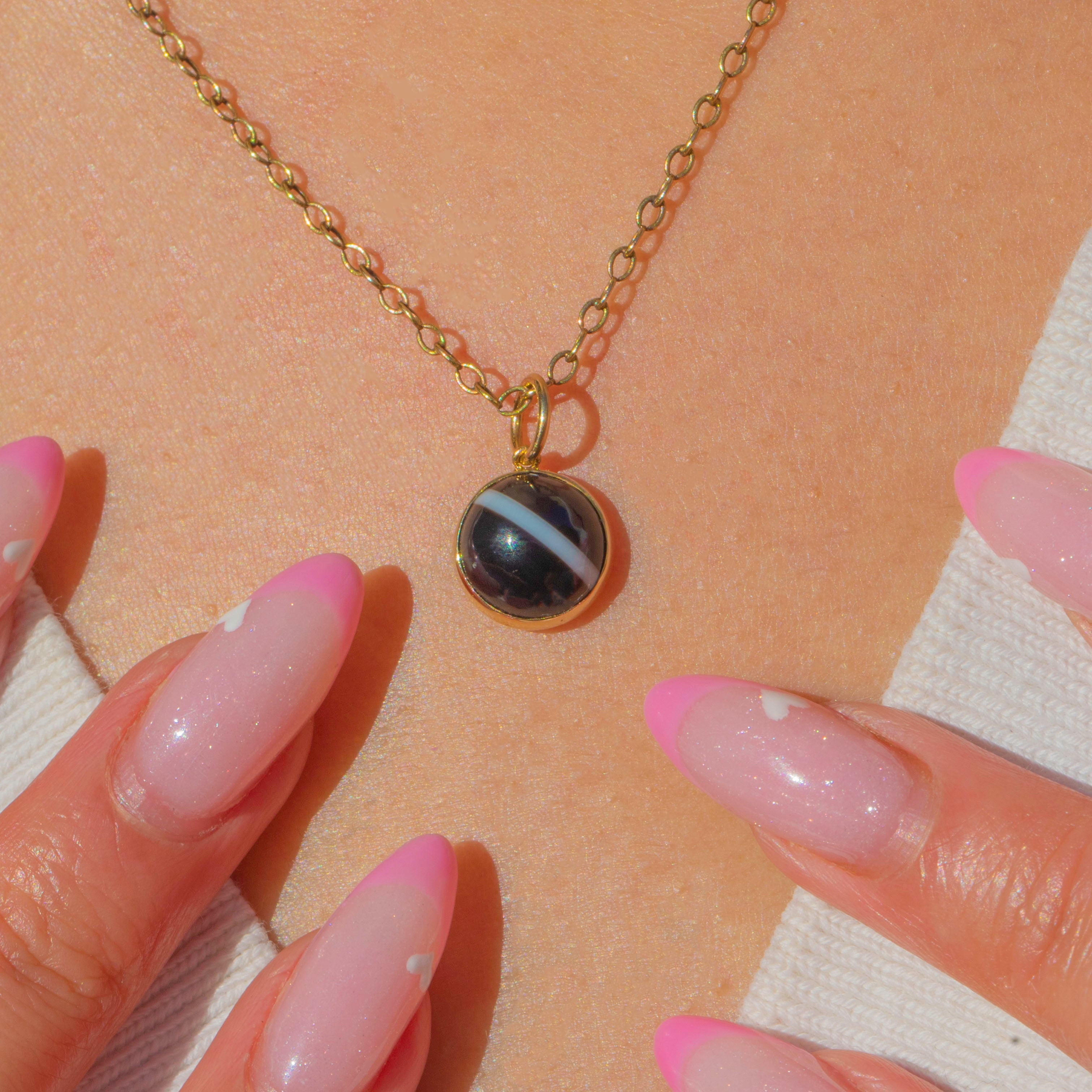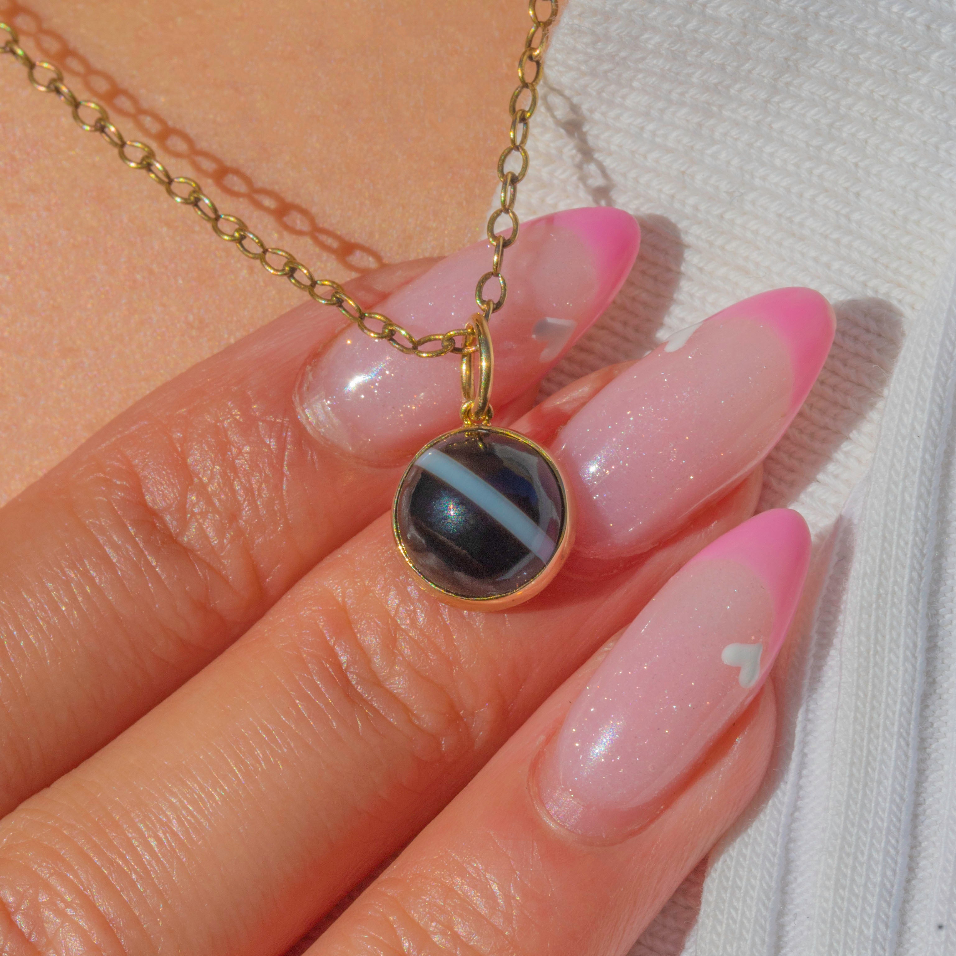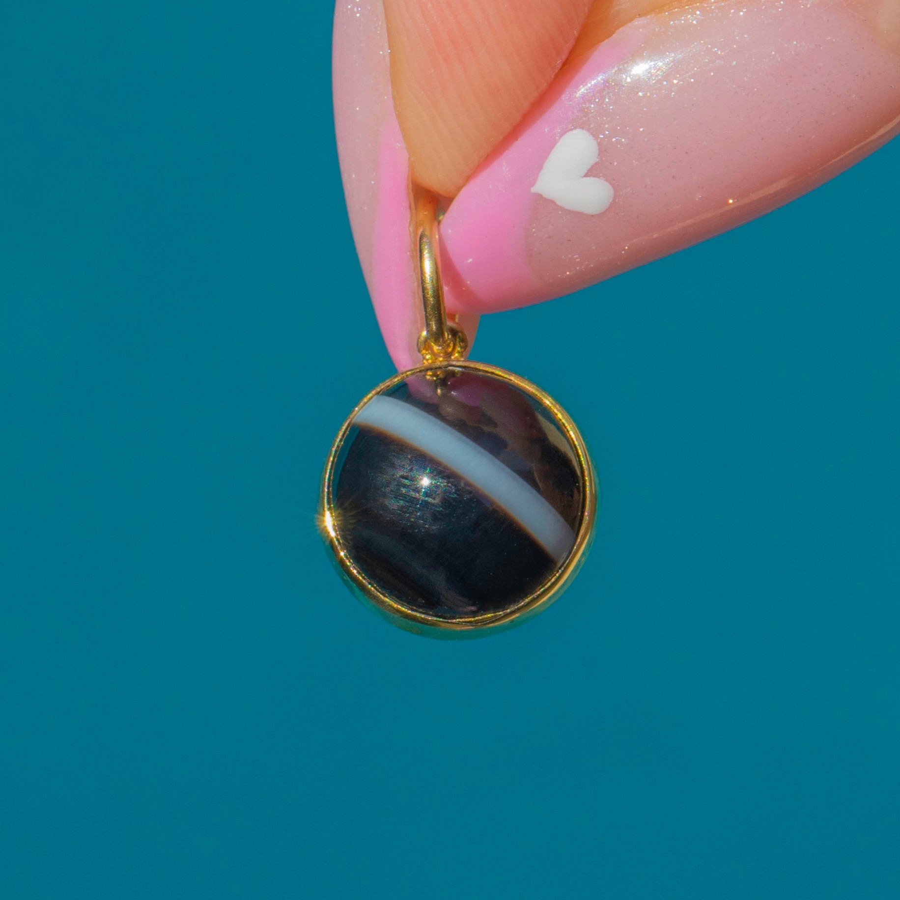 A striking Victorian charm crafted in 15ct Gold, set with a dark banded Agate of deep black tone and a single crisp white stripe running through its centre. The contrast between the black stone and the bright white band gives this piece a dramatic, timeless look.