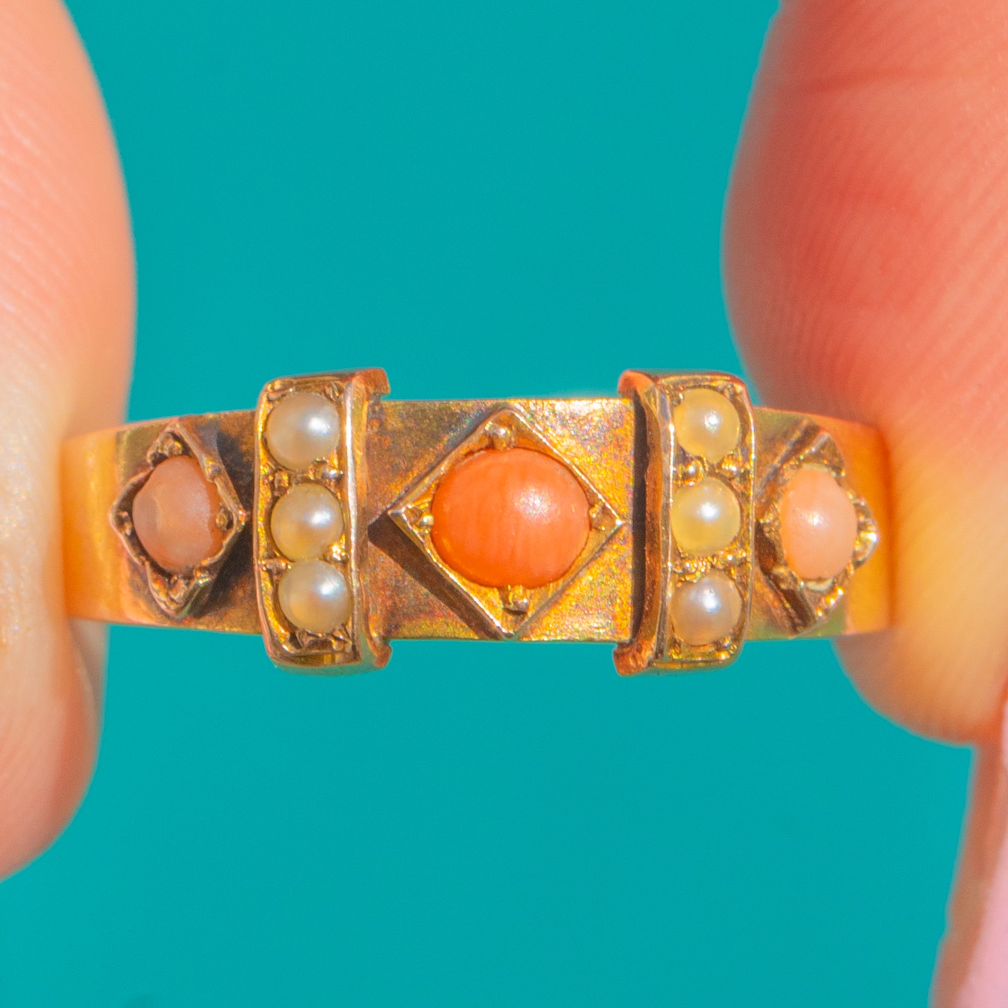 A delicate Victorian treasure, this slim 15ct Gold ring is set with glowing Coral cabochons and tiny lustrous Seed Pearls arranged in a refined lozenge-panel head. The alternating rows create a charming rhythm of warm orange-pink and soft cream, elevated by a hand-finished, multi-part construction that makes this ring completely unique.