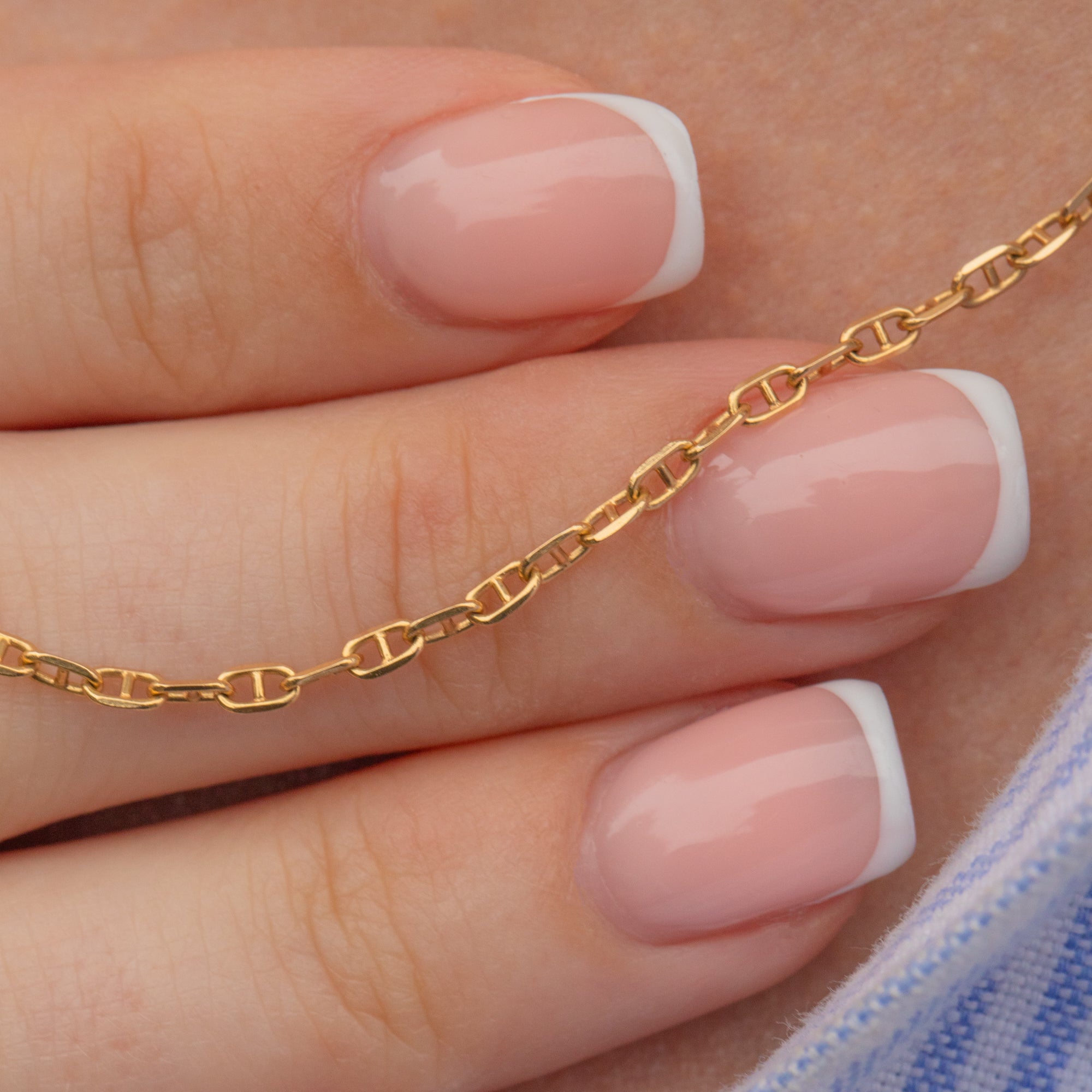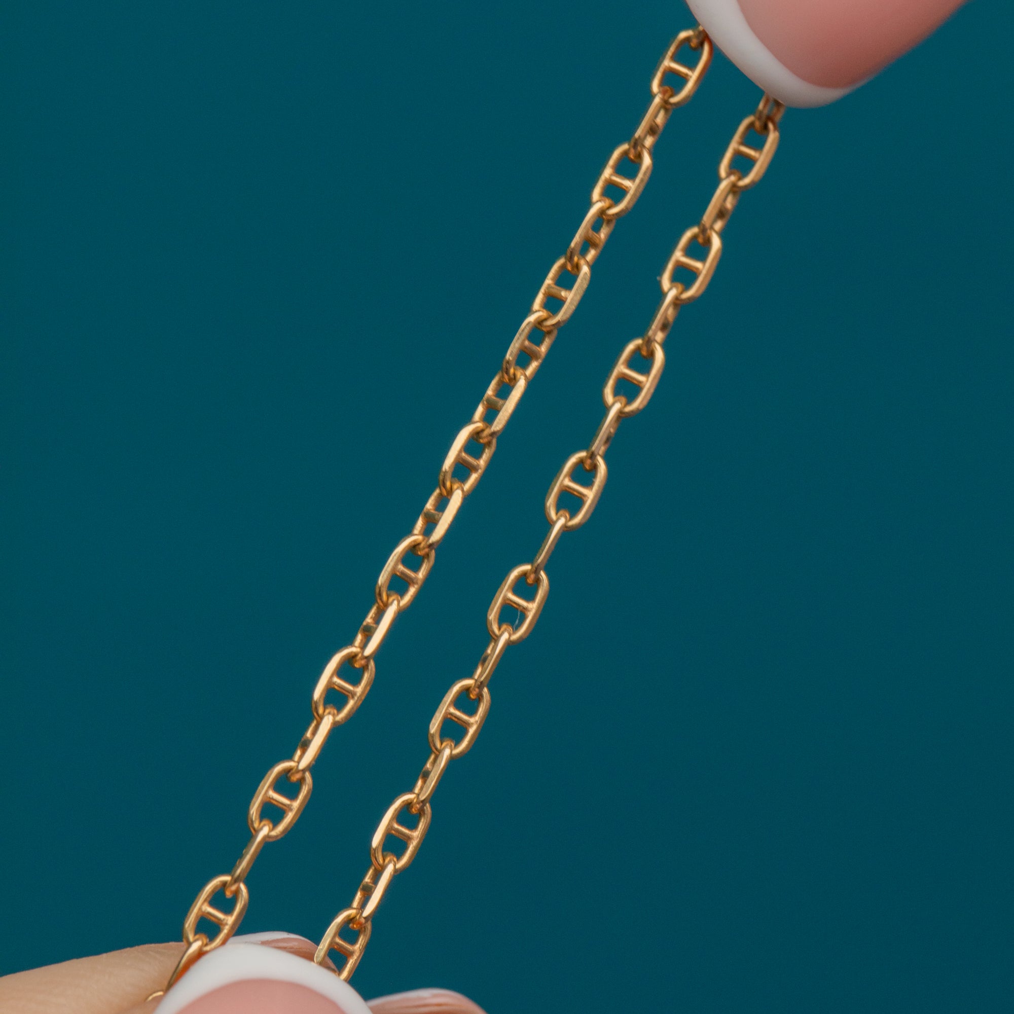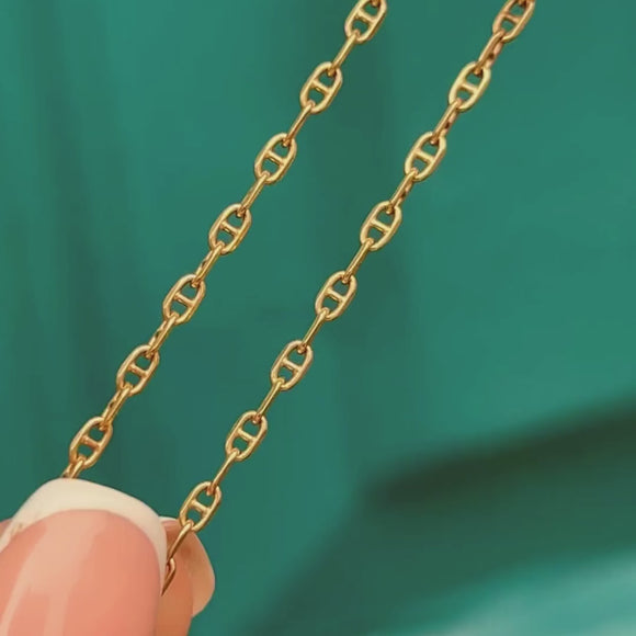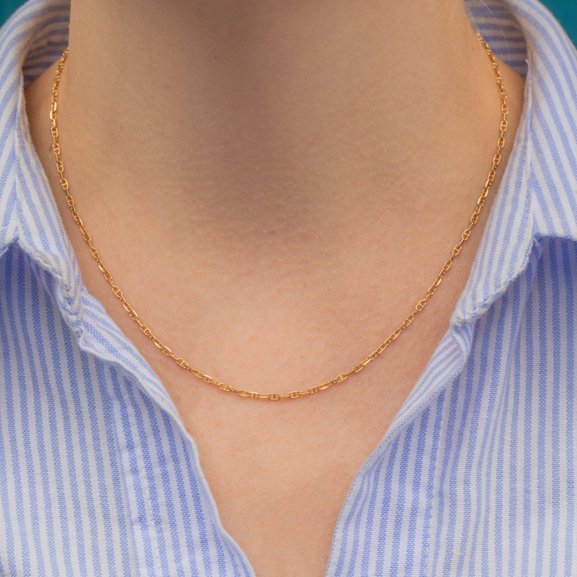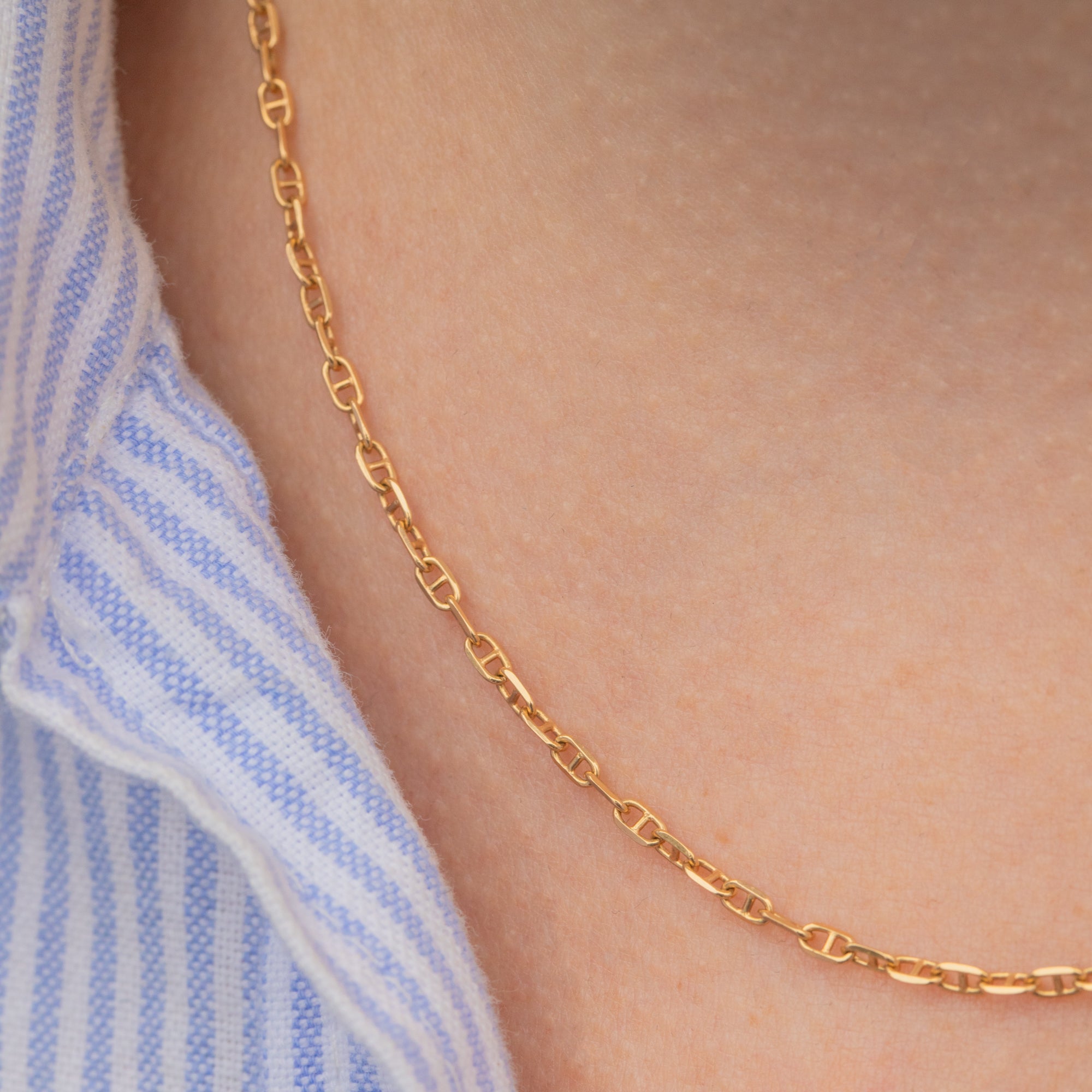 A richly saturated 16" 18ct Gold mini mariner link chain to elevate your chain game! The warm hue of the 18ct Gold adds a touch of sophistication to any ensemble, while the classic mariner link design ensures versatility for both formal occasions and everyday wear.