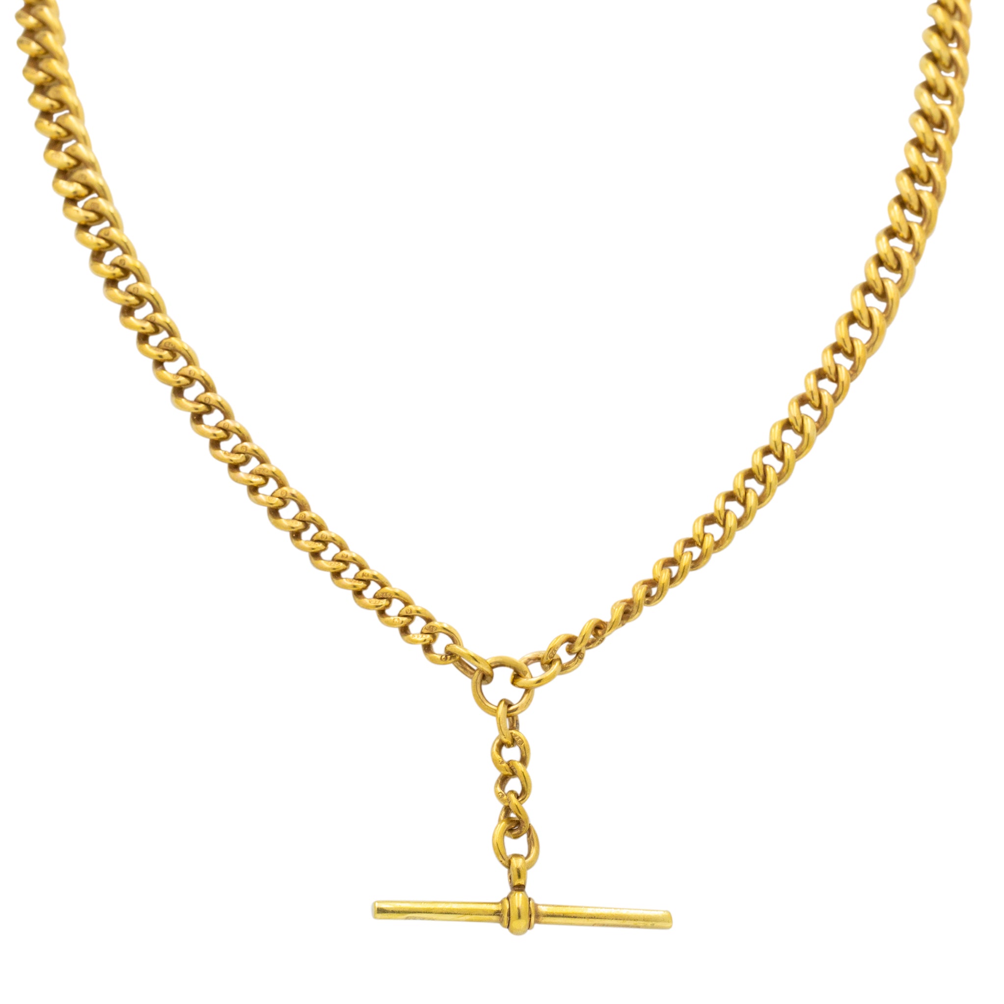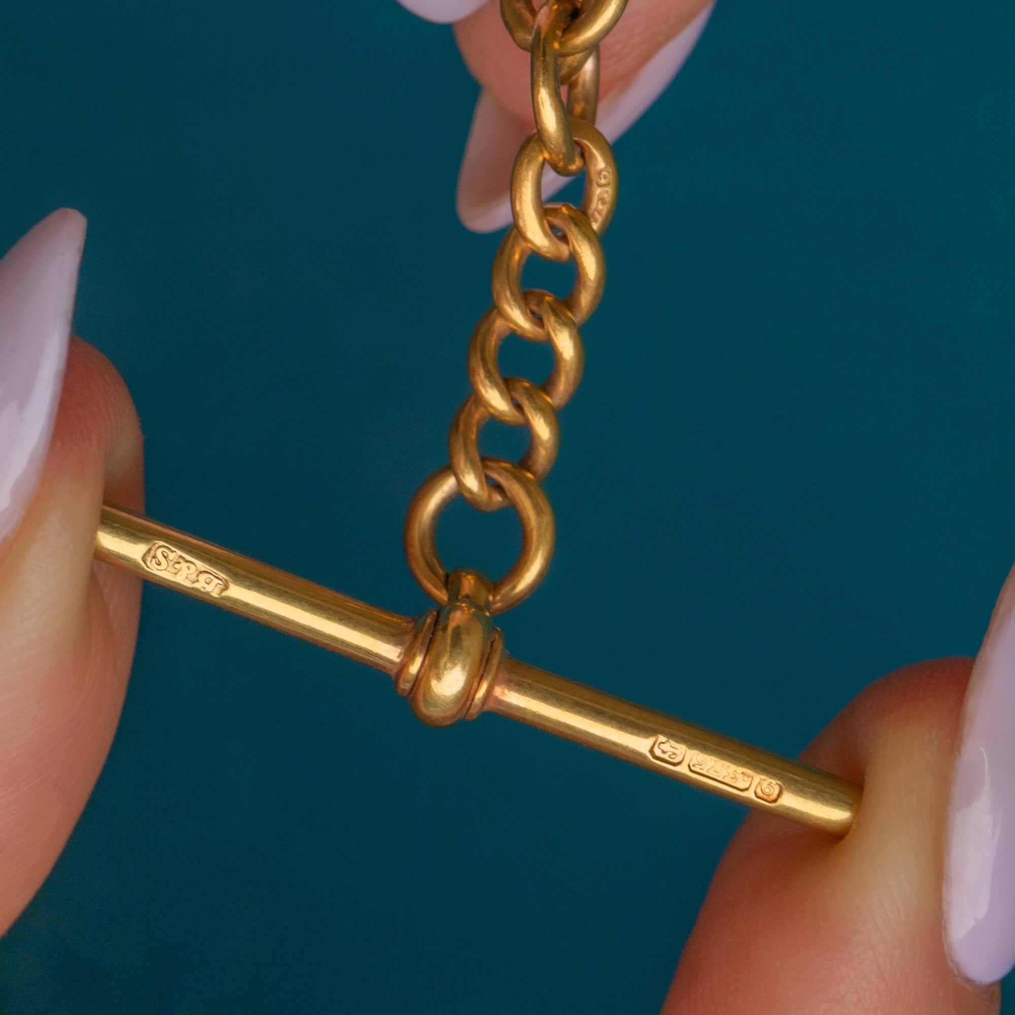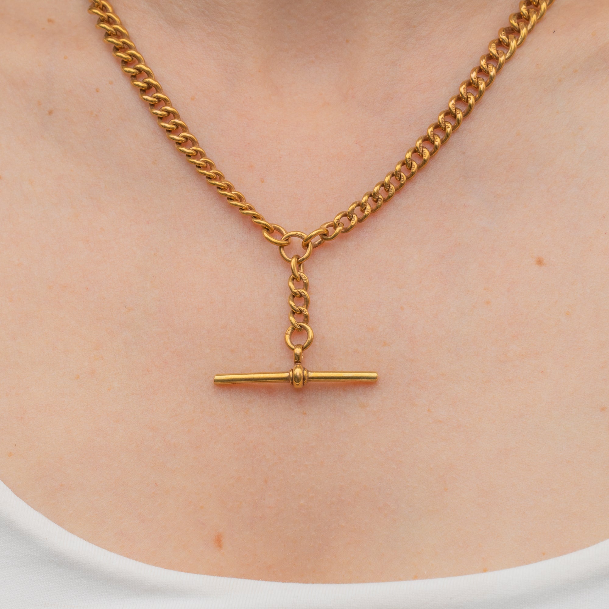 This 16.5" Victorian 9ct Gold graduating Albert chain is a versatile piece of antique jewellery you will want to wear on every occasion! This Victorian chain is crafted from 33g of solid 9ct Gold, with a suspended T-bar and two matching dog-clips.