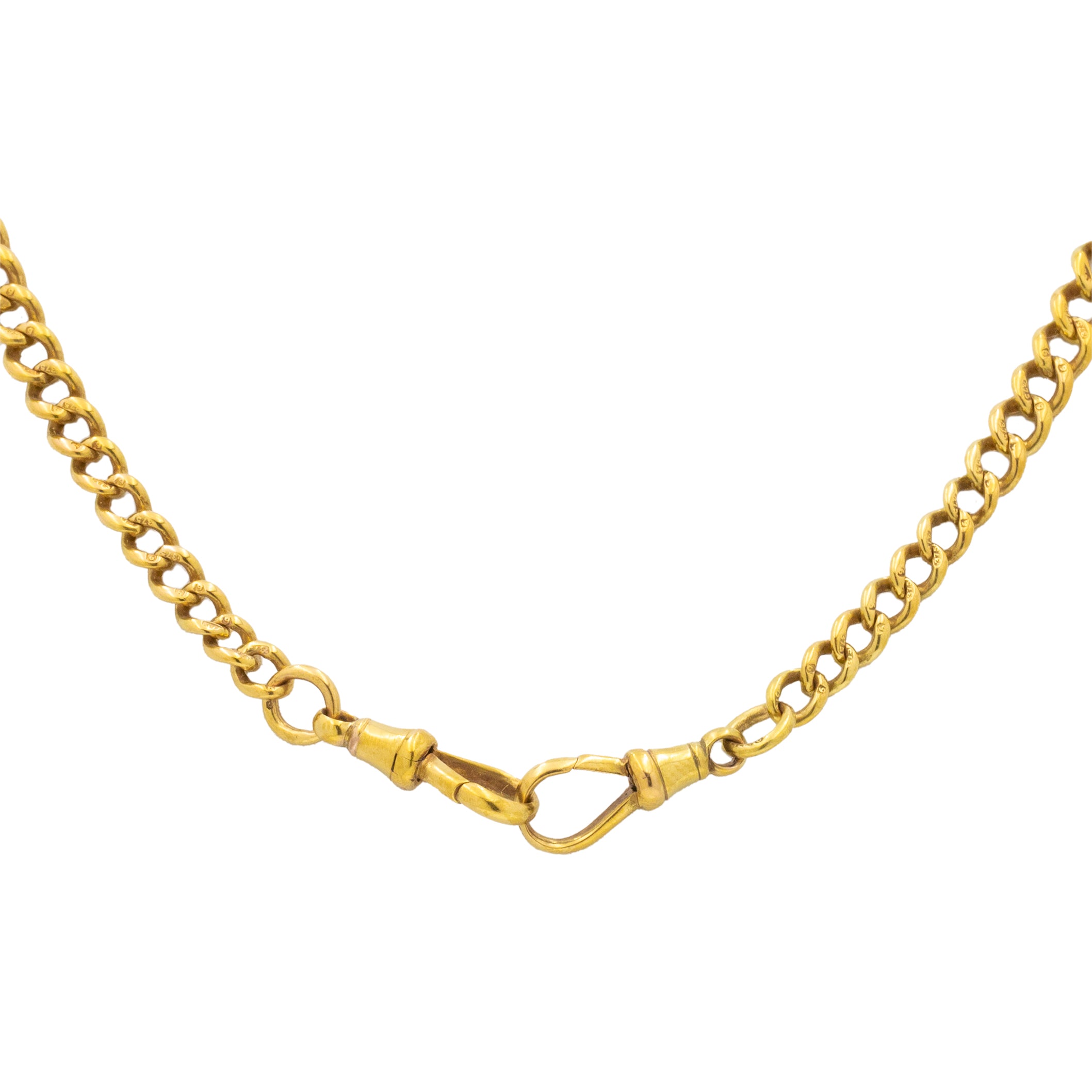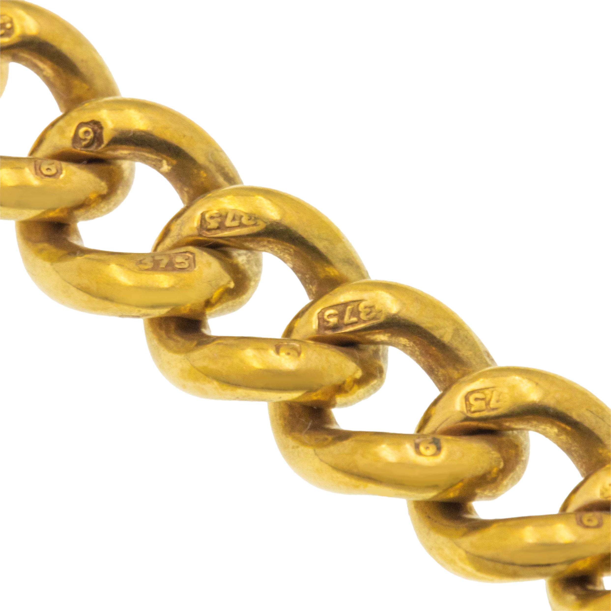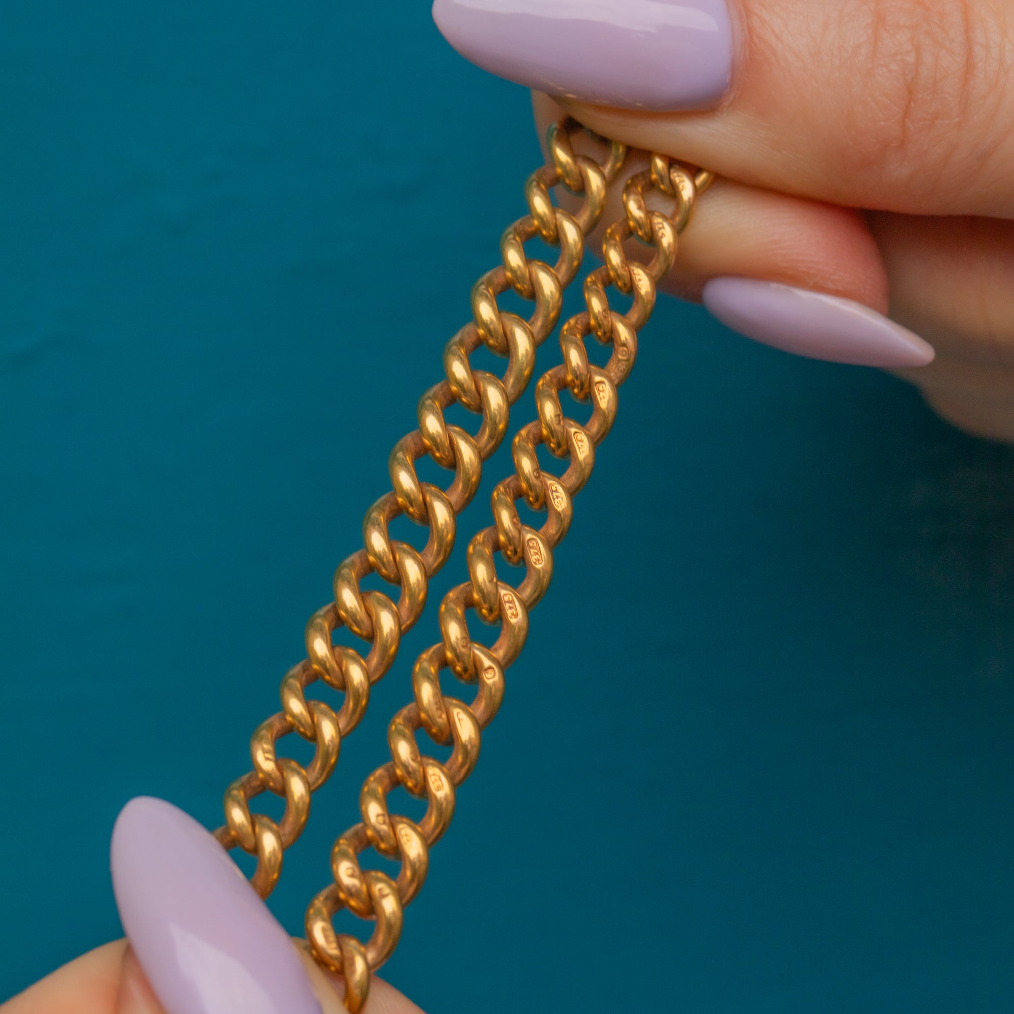 EXCELLENT. This 16.5" Victorian 9ct Gold graduating Albert chain is in fantastic antique condition. The chunky curb links are secure, and both of the dog clips work perfectly. The 9ct Gold is bright and possesses great reflective qualities. With bundles of grandeur, this antique Albert chain will set your collection apart from the rest!