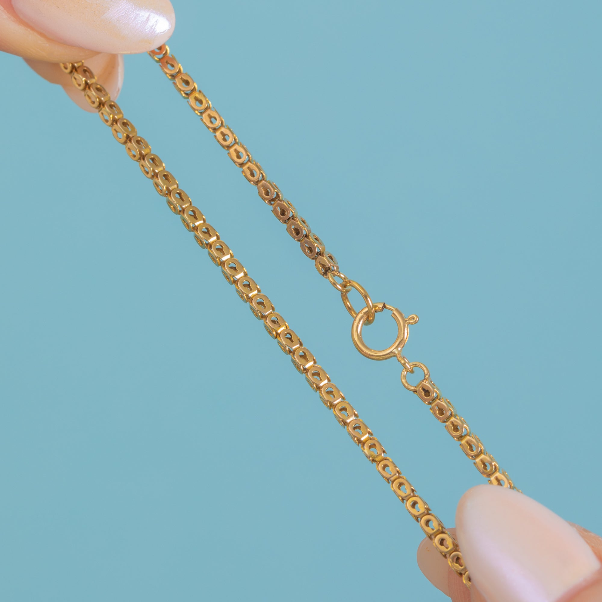 At 16.5 inches long, this Victorian Gold chain will rest elegantly across your collarbones, bringing texture and luxury to your attire. We don't often come across antique pierced box chains in such wonderful condition, so don't hesitate to make this coveted piece of Victorian jewellery yours!