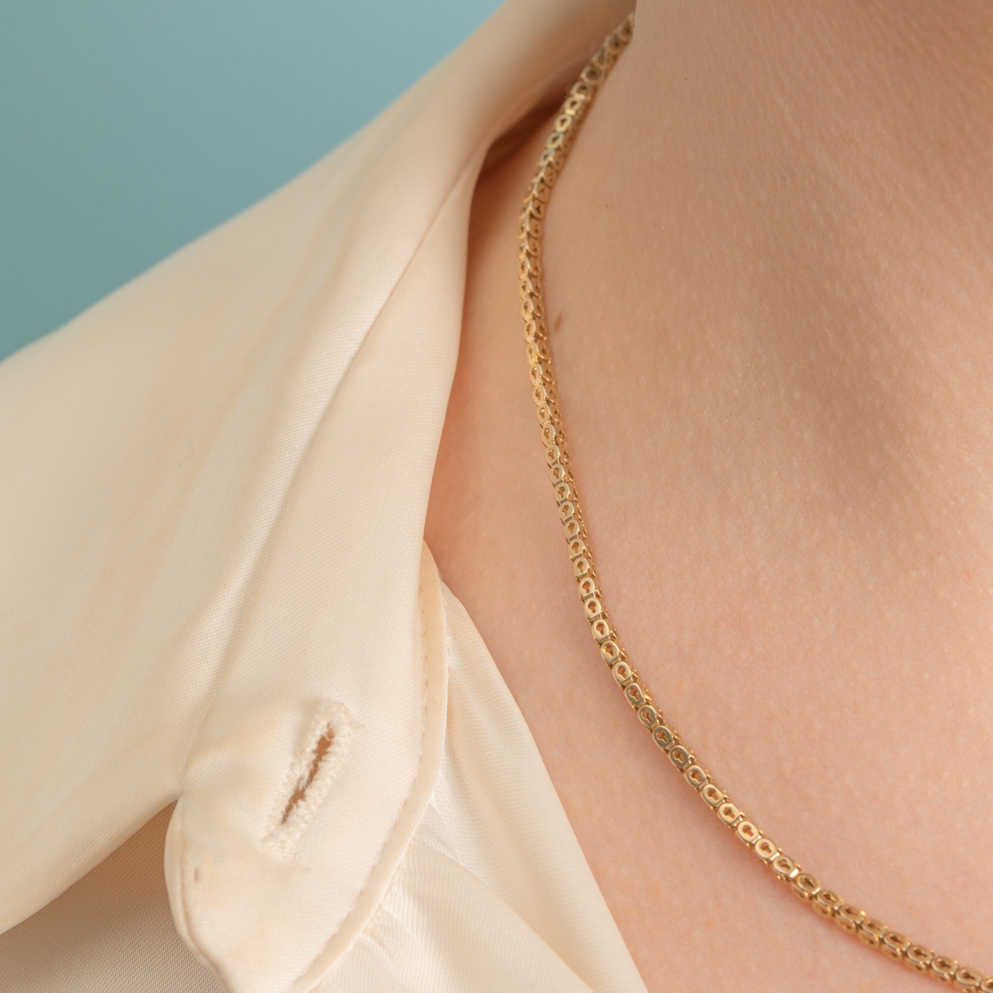 Add a unique flare to your necklace stack with this striking antique 9ct Gold pierced link chain! Crafted from buttery 9ct Gold, each box link chain has hand-pierced details on each side, a style popularised during the Victorian era.