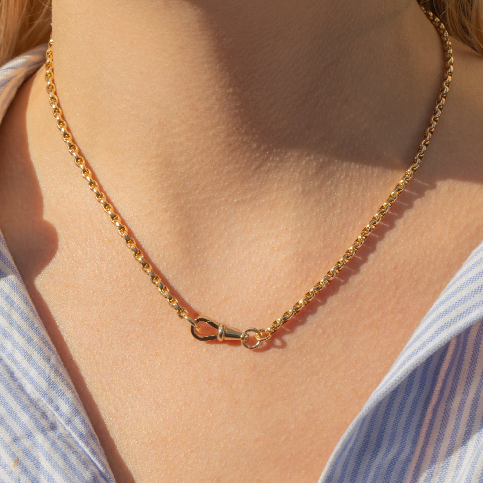 Victorian Gold chains are known for their versatility - and she is no exception. Featuring a highly sought-after dog-clip, this chunky Gold belcher chain is perfect for suspending pendants, layering with other chains, or simply worn as a standalone piece for a flash of Gold.