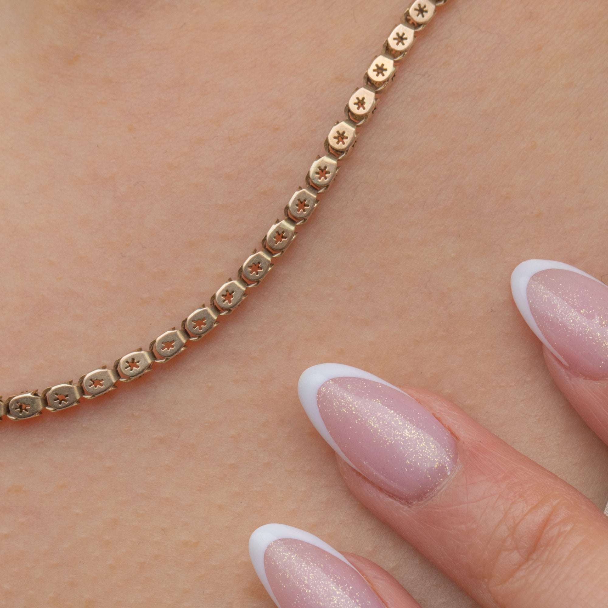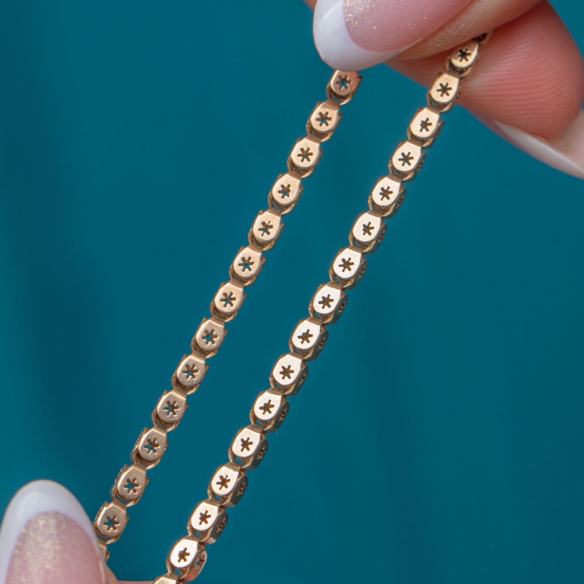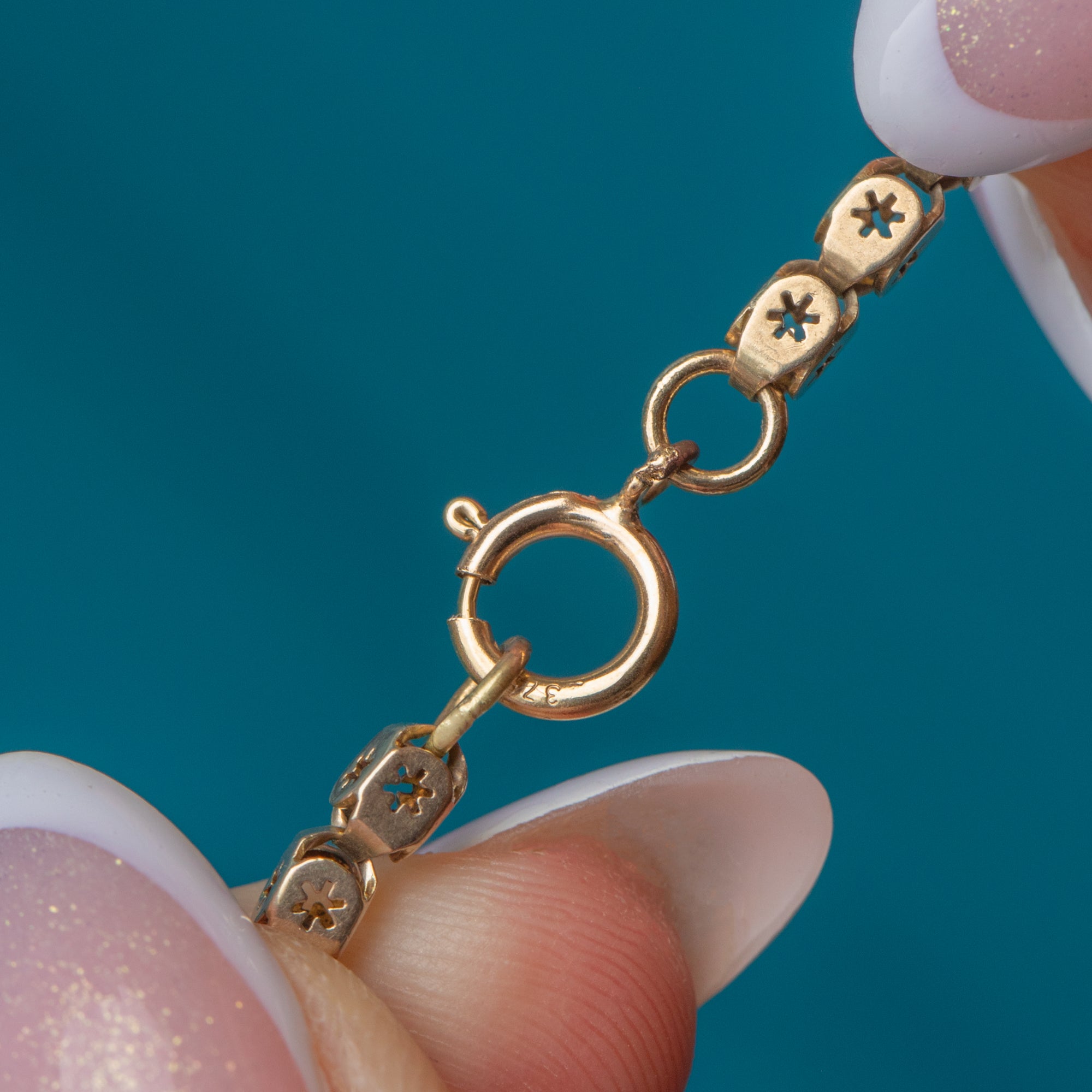 This luxurious antique 9ct Gold pierced star link chain will instantly add a touch of celestial charm to your neckline! Crafted from luscious 9ct Gold, the 16-inch length is made up of smooth box links, boasting a meticulously hand-pierced star on each side.