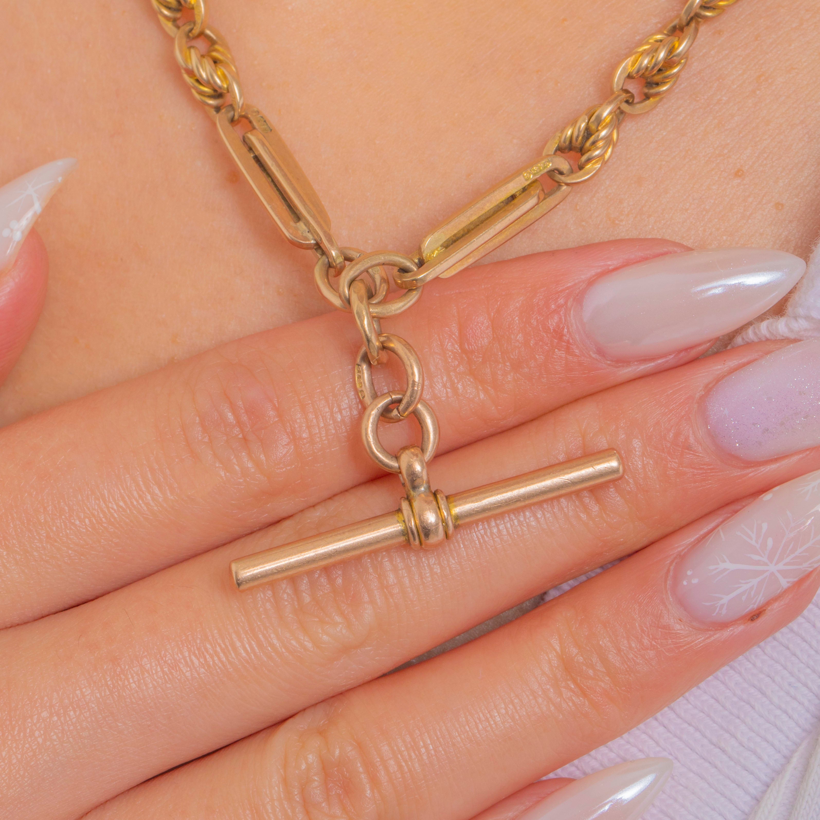 EXCELLENT: Light, even surface wear to the Gold consistent with age, with a rich antique patina and crisp links. The bolt‑ring, dog‑clip and T‑bar are secure and operate smoothly. No visible dents, repairs or distortions; this piece has been very well cared for.