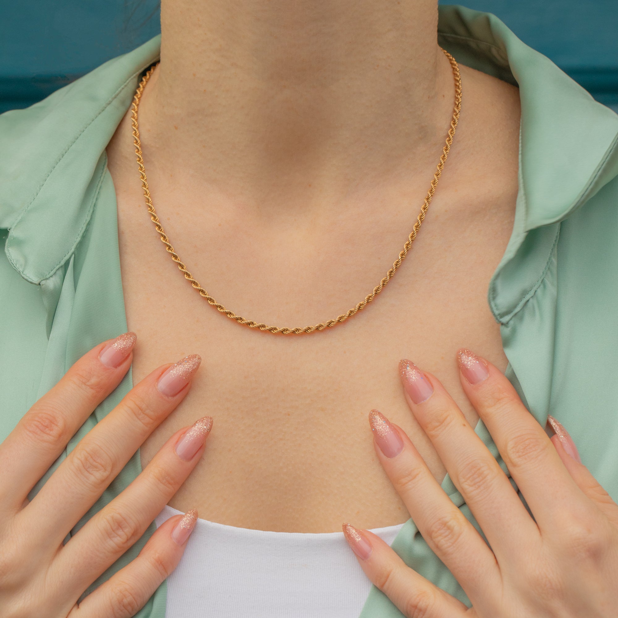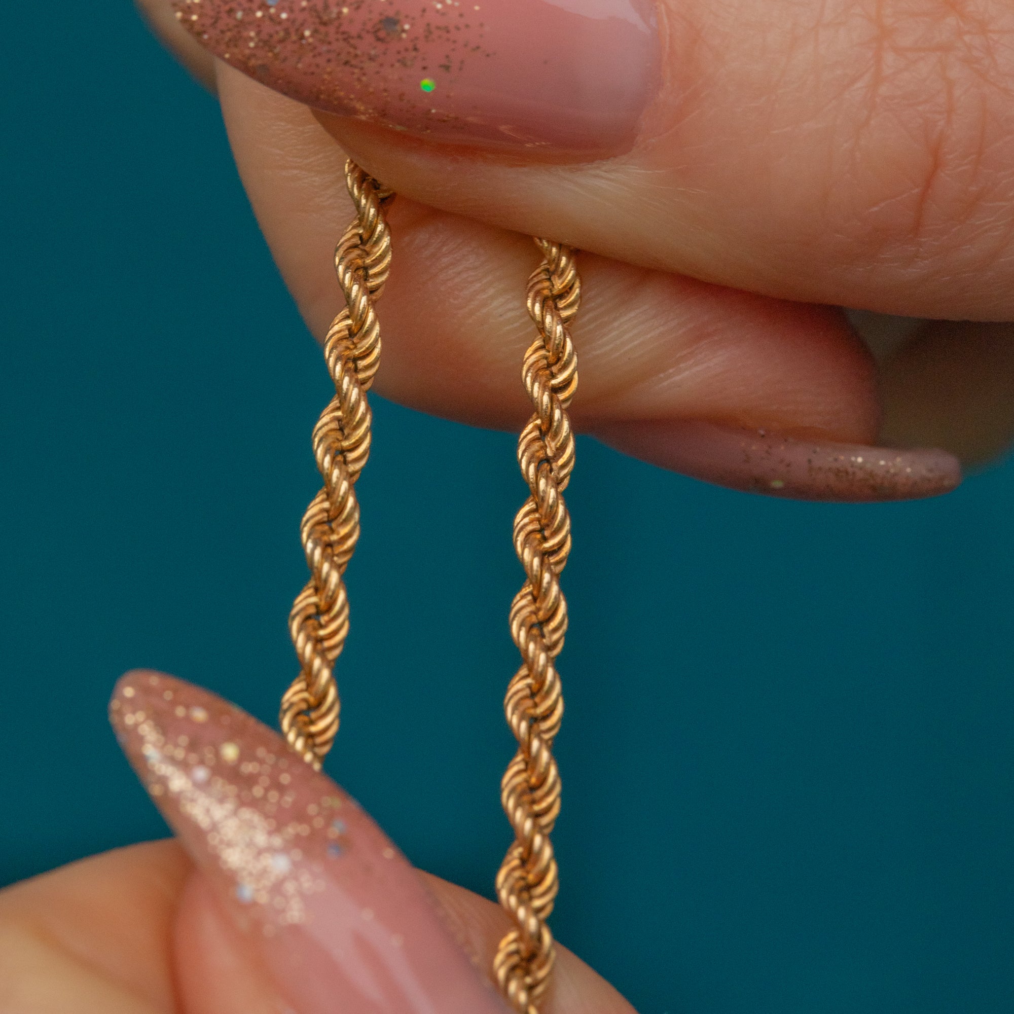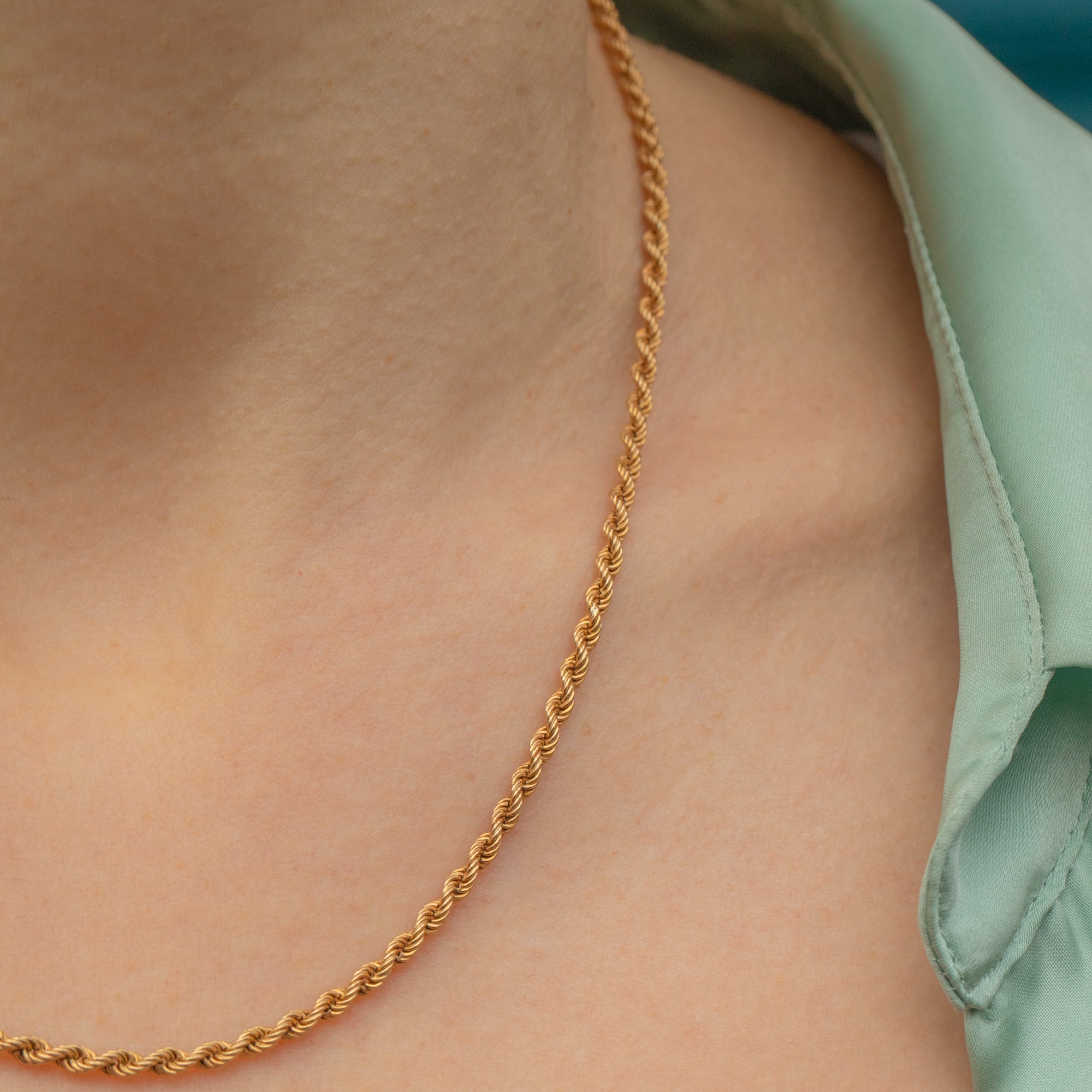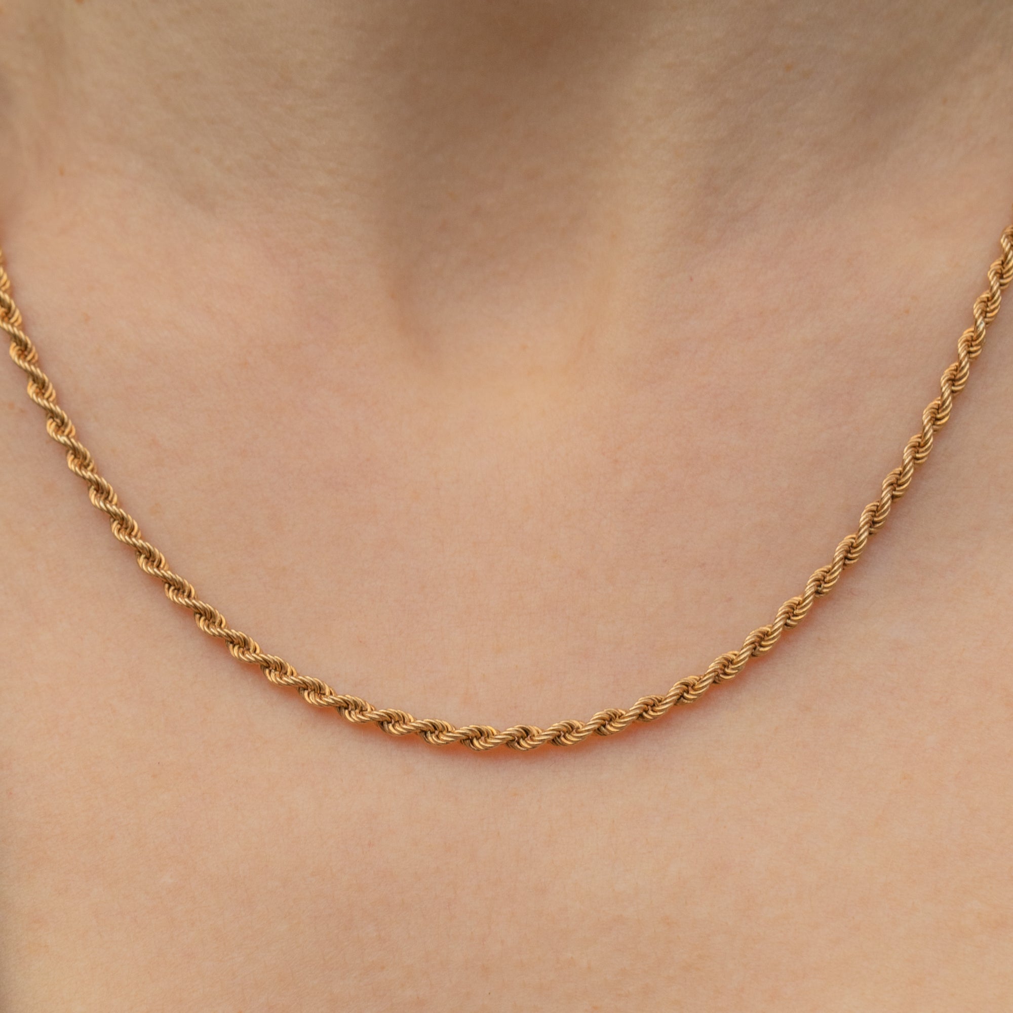 This 17.5" 9ct Gold twisted rope chain is a gorgeous piece that will become your new staple. Crafted from saturated, buttery 9ct Gold, she is a sumptuous delight to adorn your décolletage!