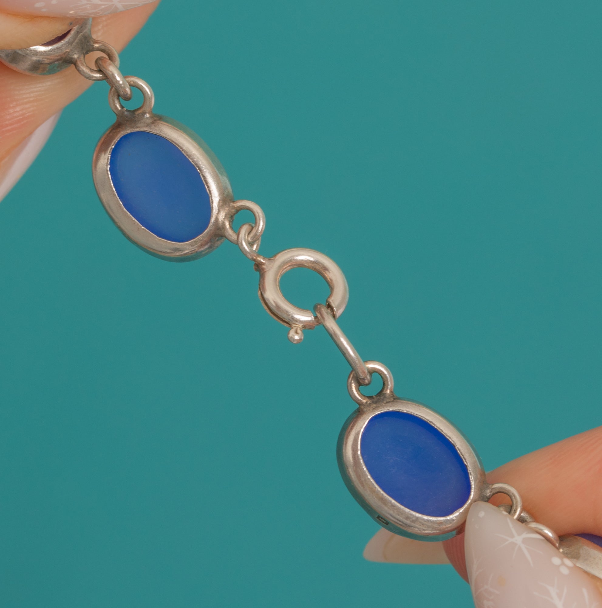 EXCELLENT: The Blue Chalcedony cabochons are smooth and glossy with no chips, scuffs or wear. The Sterling Silver rubover settings and articulated links are secure and neatly finished, with a bolt-ring clasp that closes firmly. Hallmarks are crisp and legible.