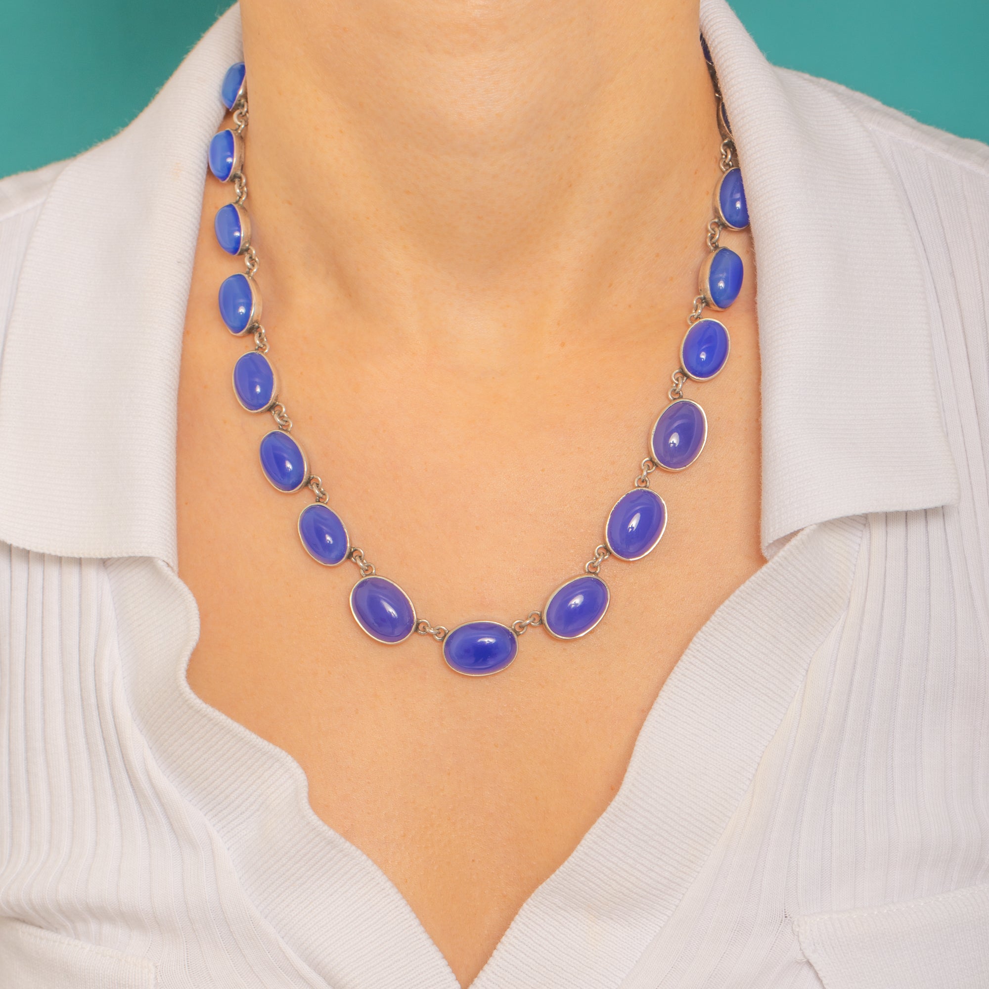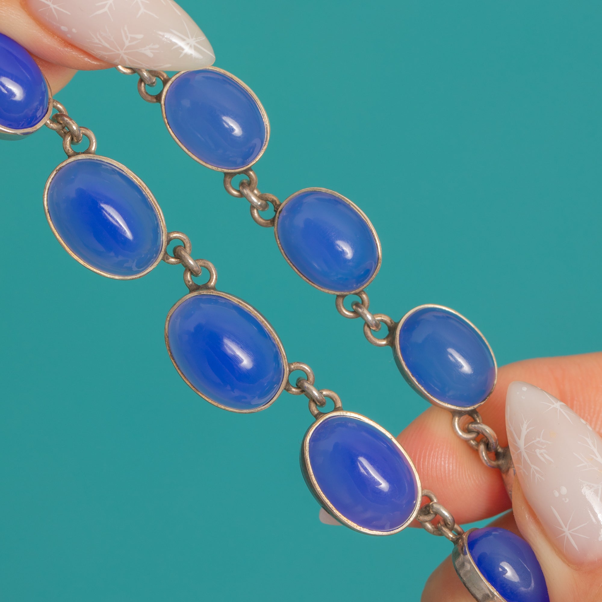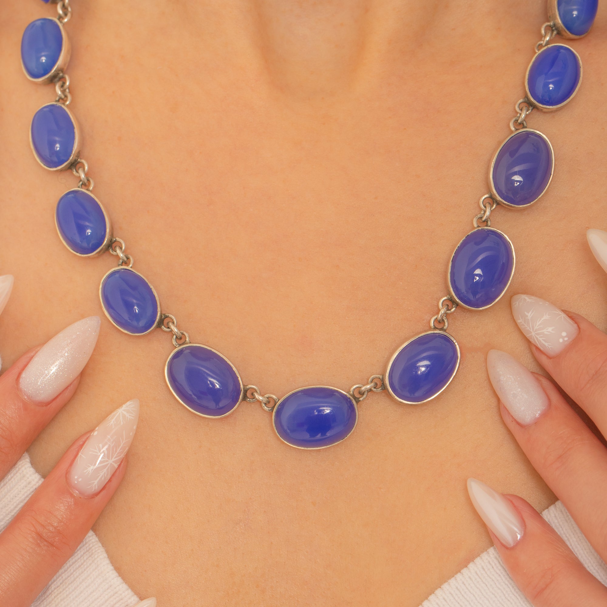 A vivid Blue Chalcedony rivière from the mid-century, this articulated line necklace lies in a seamless sweep of oval cabochons, each held in smooth rubover Sterling Silver bezels. Elegantly graduated and linked for fluid movement, the saturated cobalt-blue stones create a clean, minimalist silhouette that sits beautifully at the collarbone.