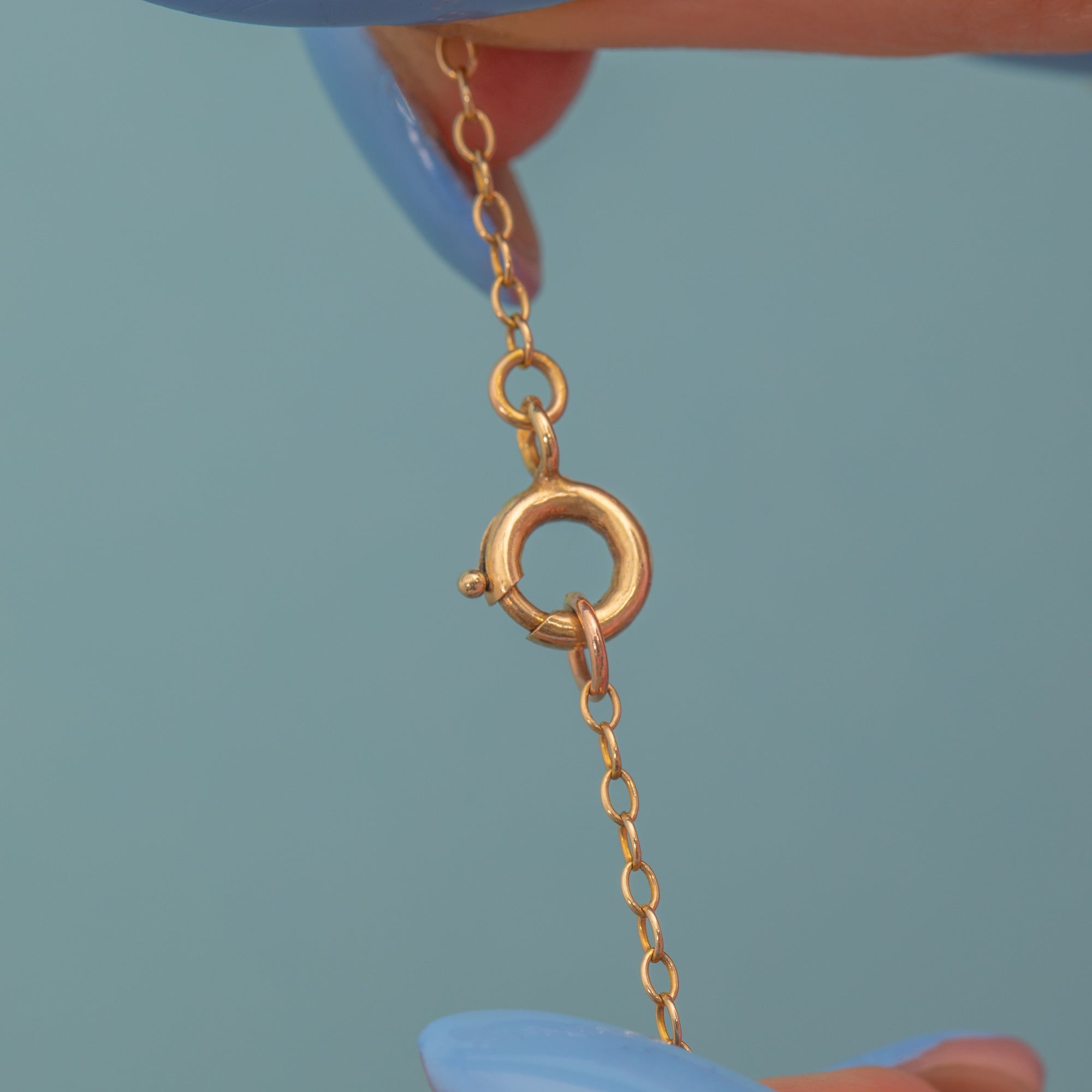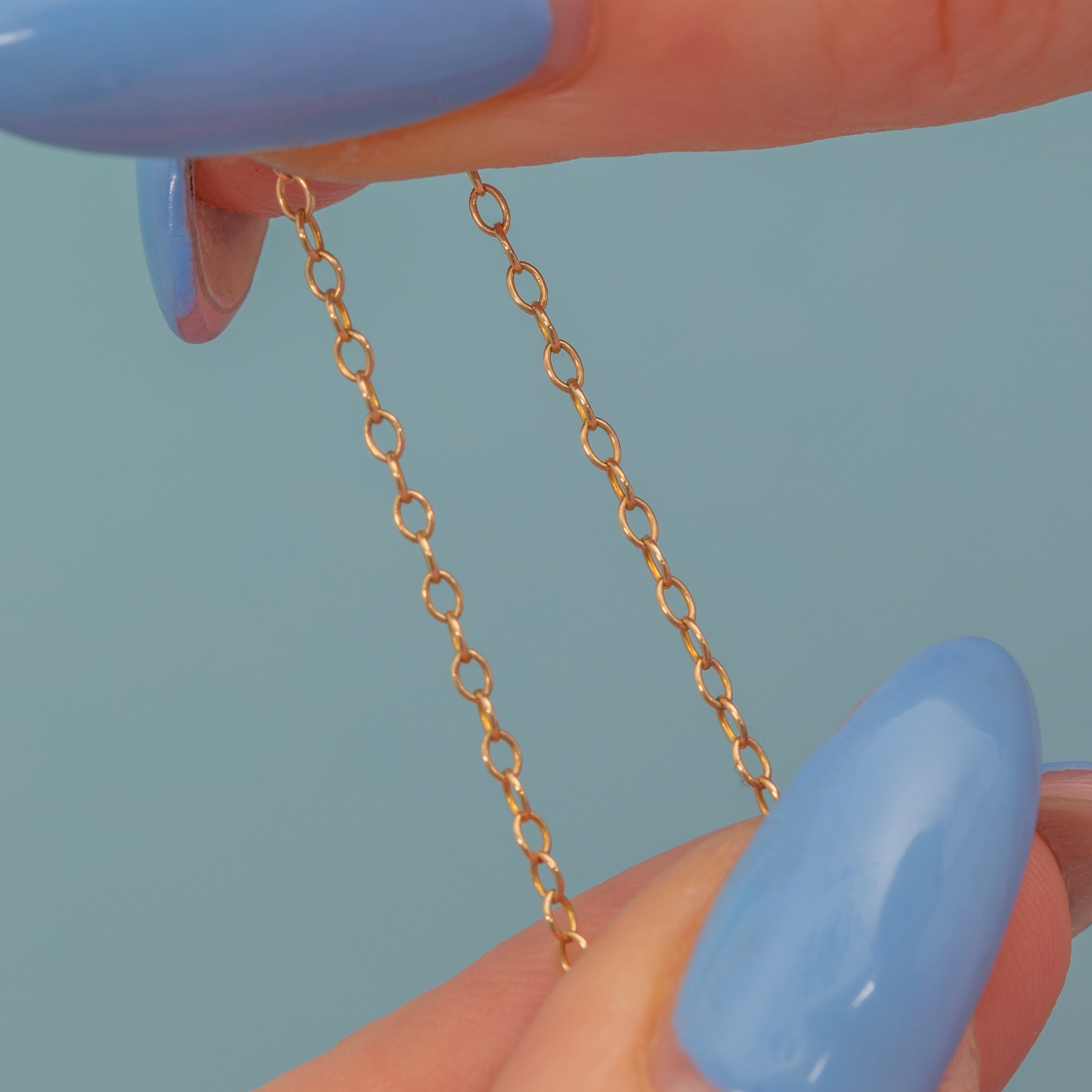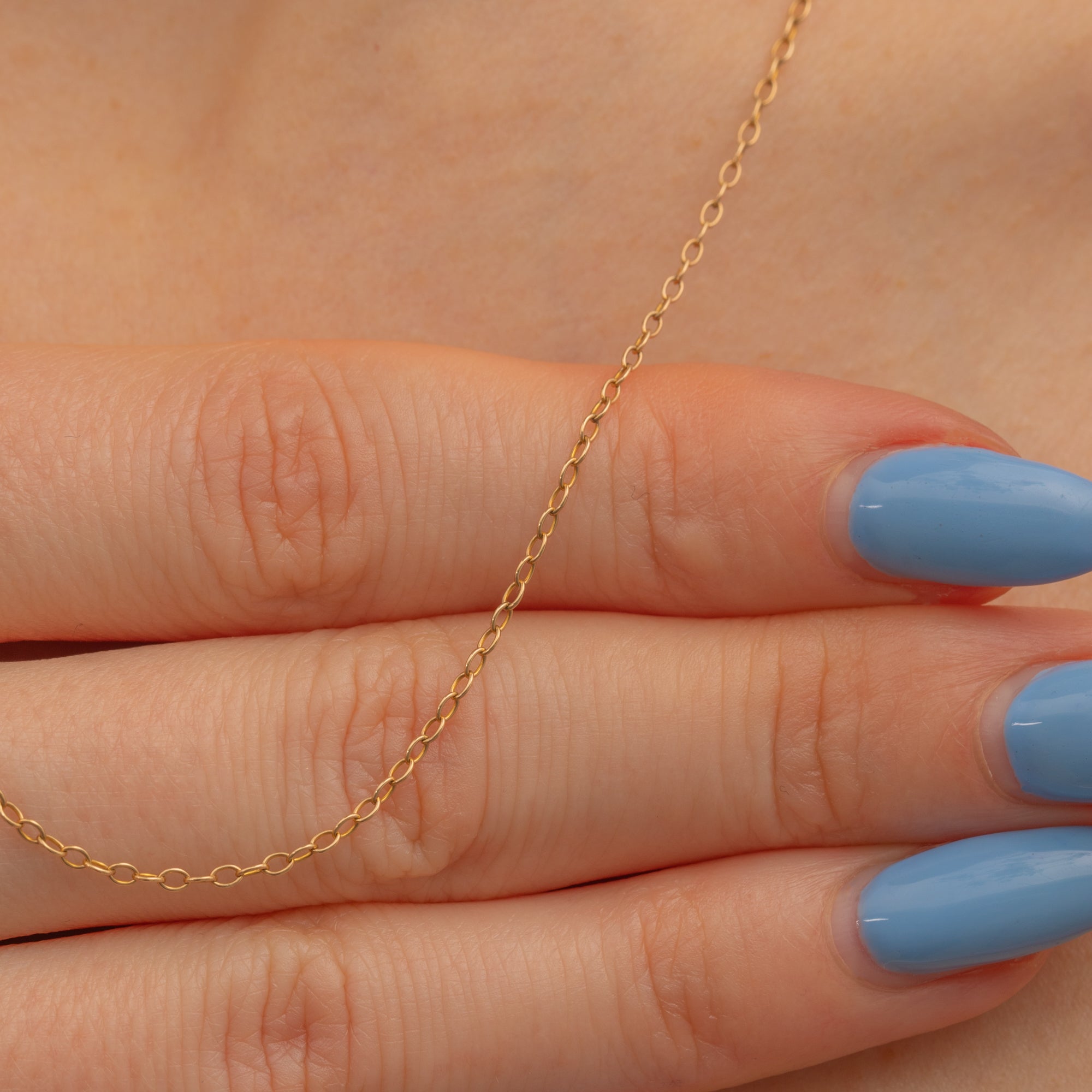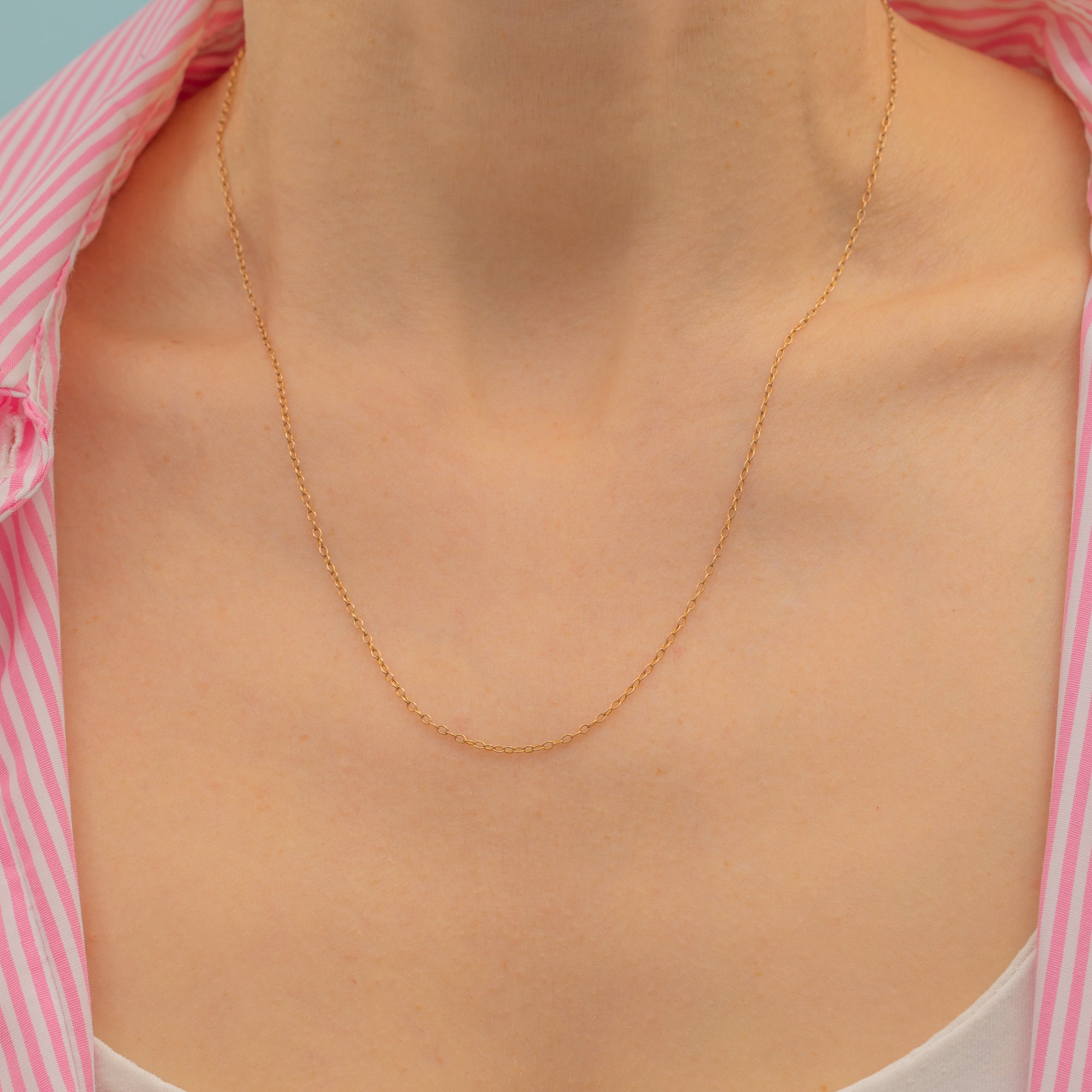 This 9ct Gold oval skinny pendant chain is a versatile piece with timeless appeal! The 18.5-inch length is made up of dainty trace links that fall elegantly across the collarbones and is crafted from solid 9ct Gold throughout.
