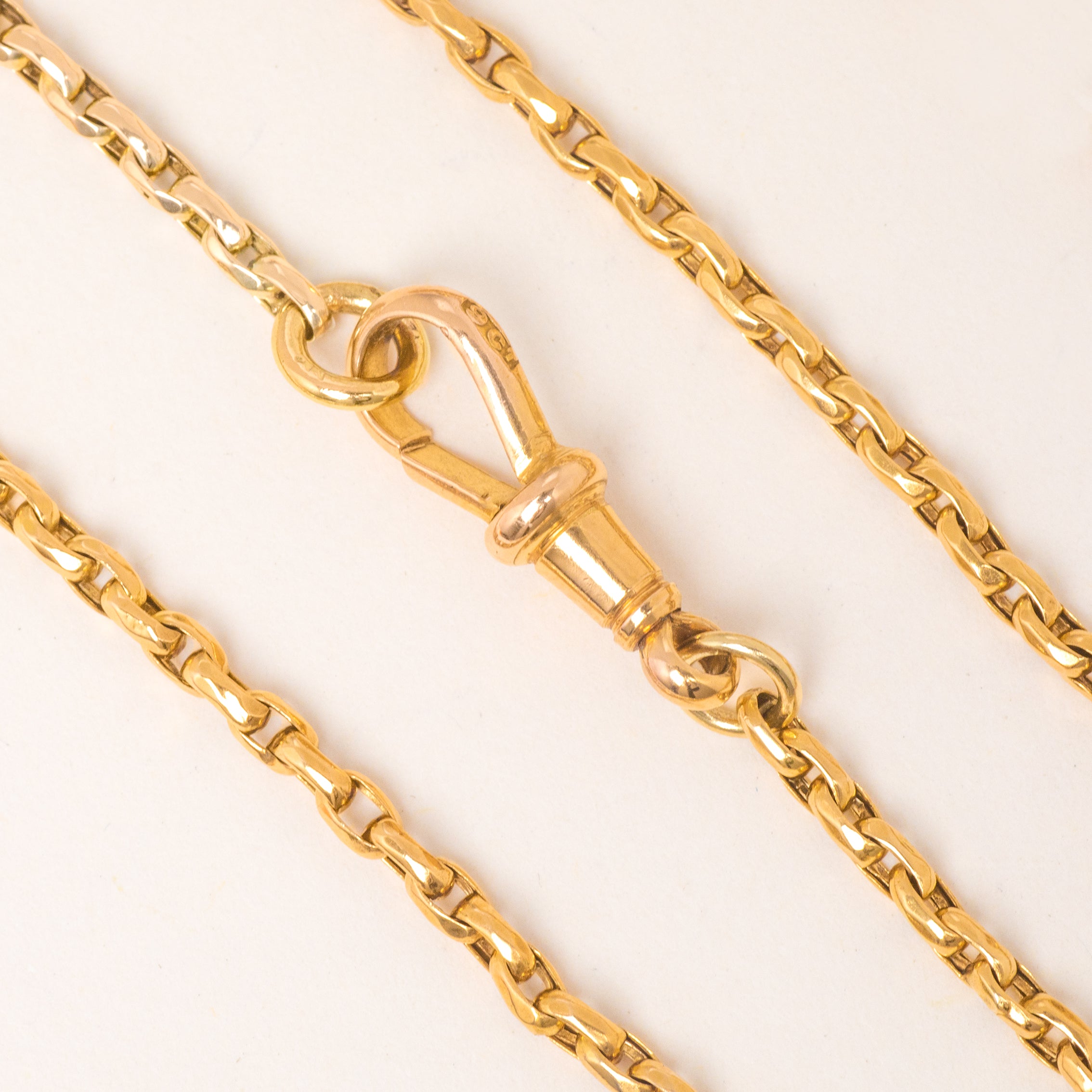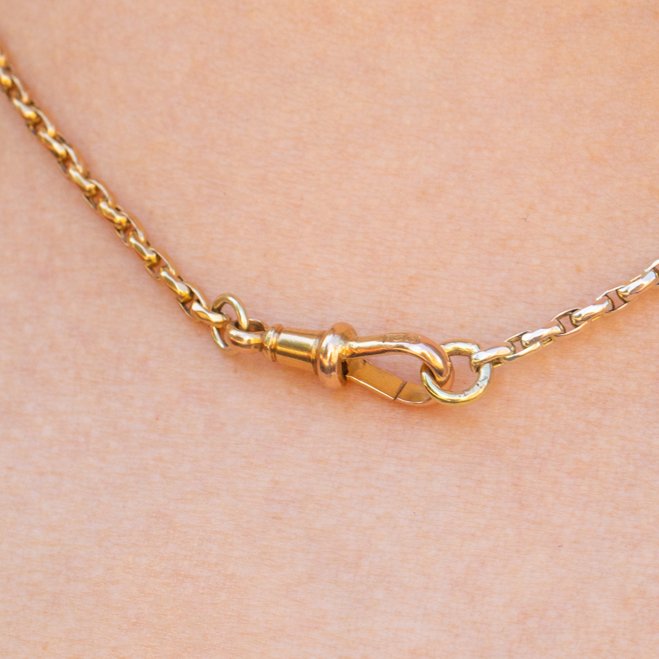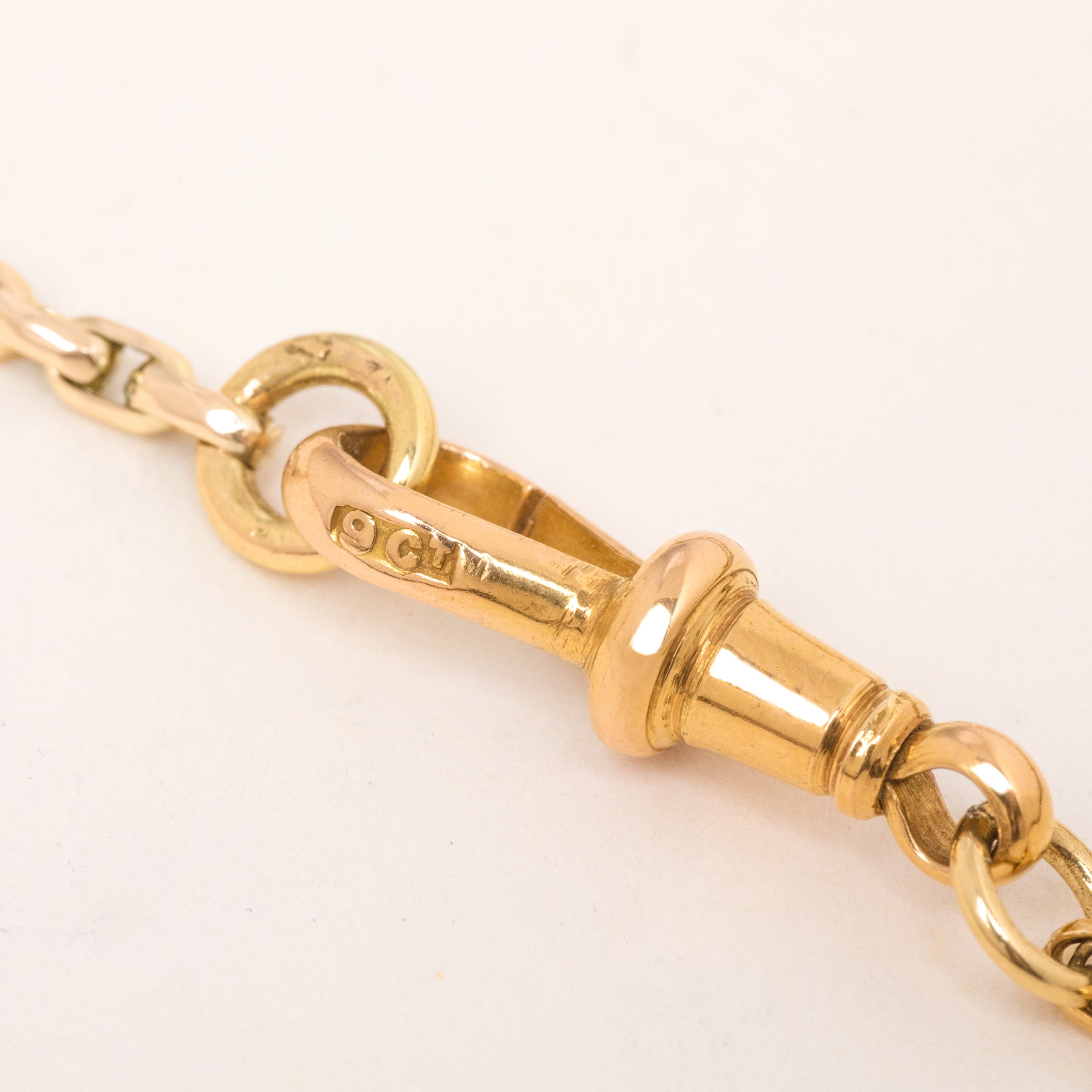 EXCELLENT. This 18" antique 9ct Gold skinny belcher chain is in excellent condition. This gorgeous chain is the perfect everyday essential for your collection, complete with smooth and secure links, as well as a dog-clip for secure wear. There are clear antique stamps on the dog-clip, making this a collectible piece of antique jewellery!
