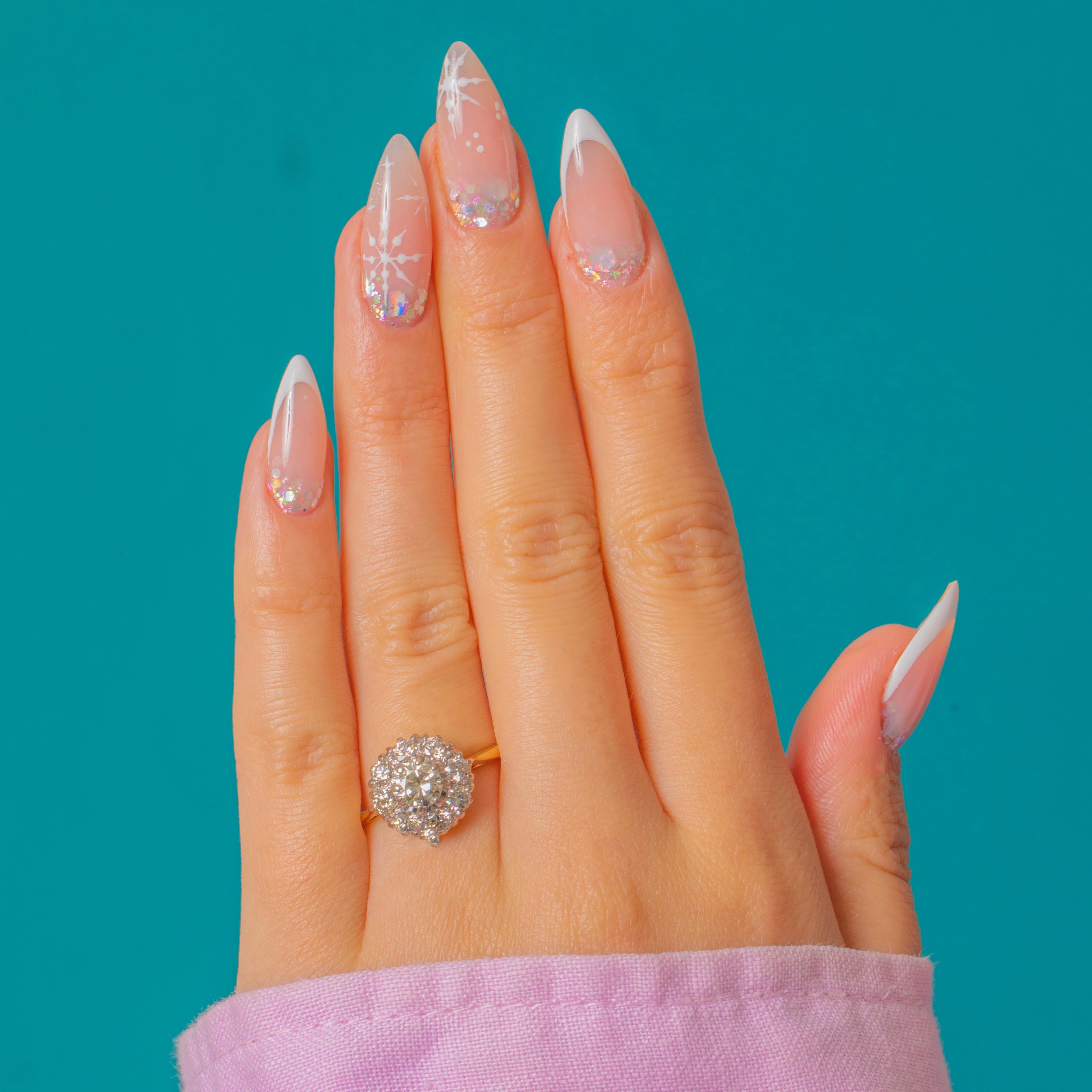 This breathtaking Mid-Century ring is set with a dazzling array of natural Diamonds totalling approximately 1.00ct. The central Diamond measures around 5mm, surrounded by a halo of 2.5mm stones in a radiant cluster formation that amplifies the sparkle and light from every angle.