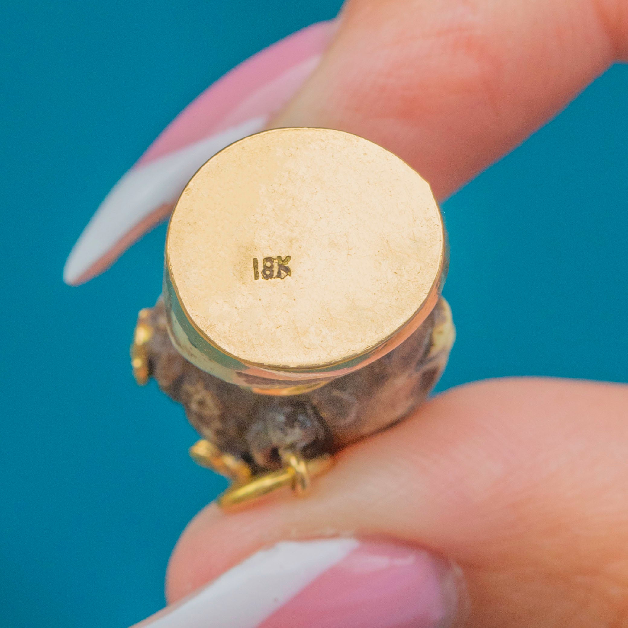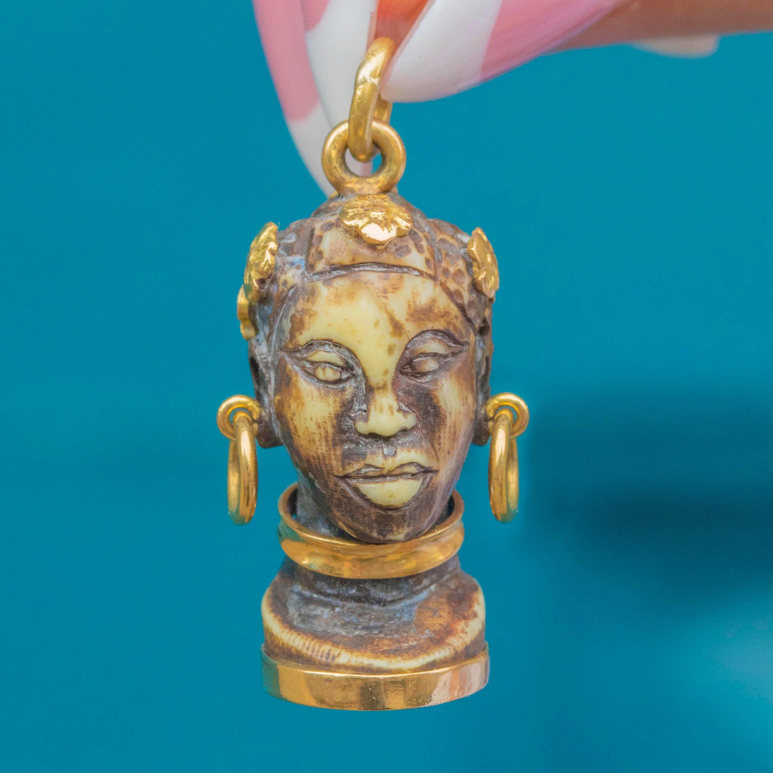 EXCELLENT: The carved woman’s head displays finely detailed features, with no visible chips, cracks, or damage to the carved material. The natural patina of the carving is well-preserved, enhancing the depth and character of the piece. The 18ct Gold elements—including the hoop earrings, floral hair accents, and collar rings—are intact and show minimal signs of wear consistent with gentle use.