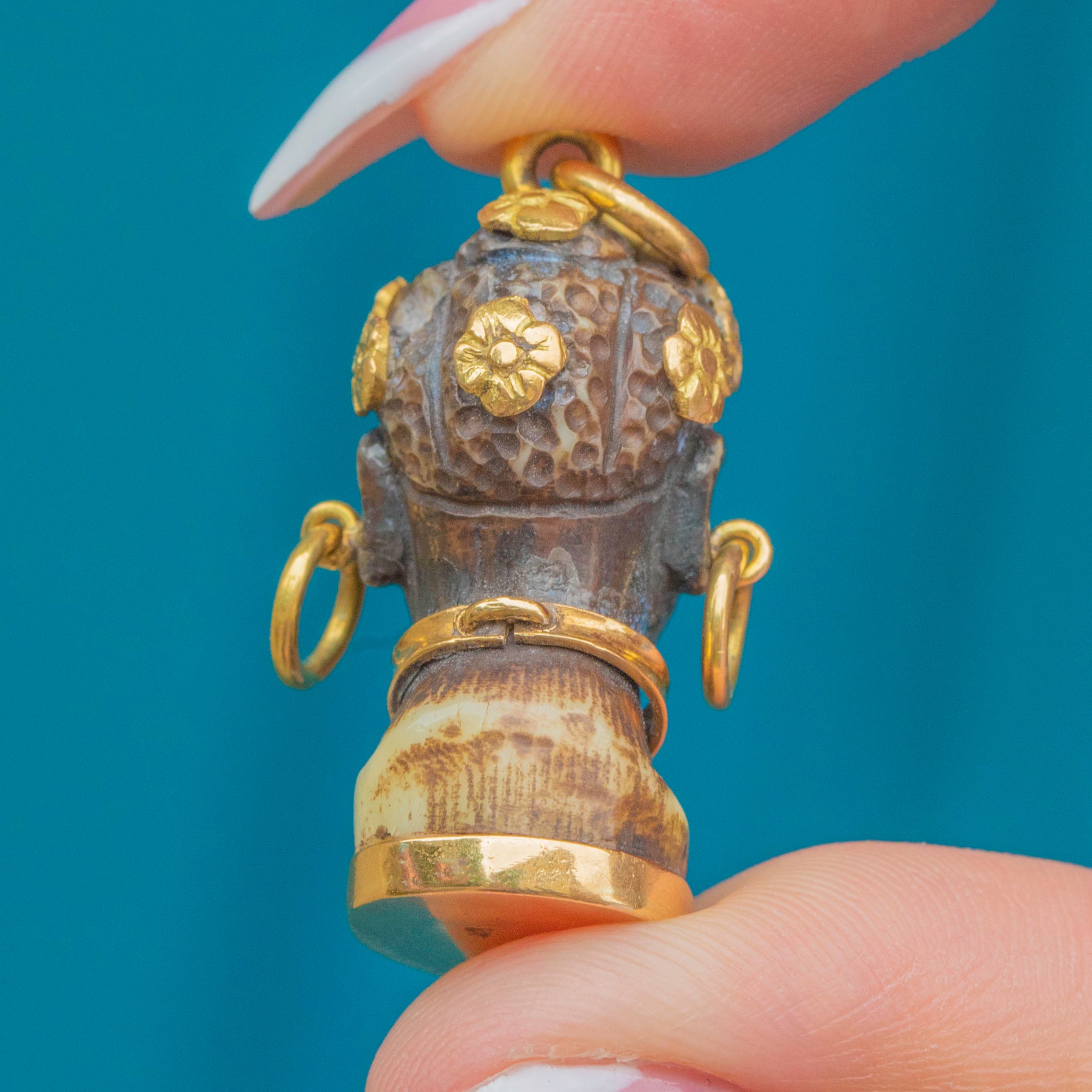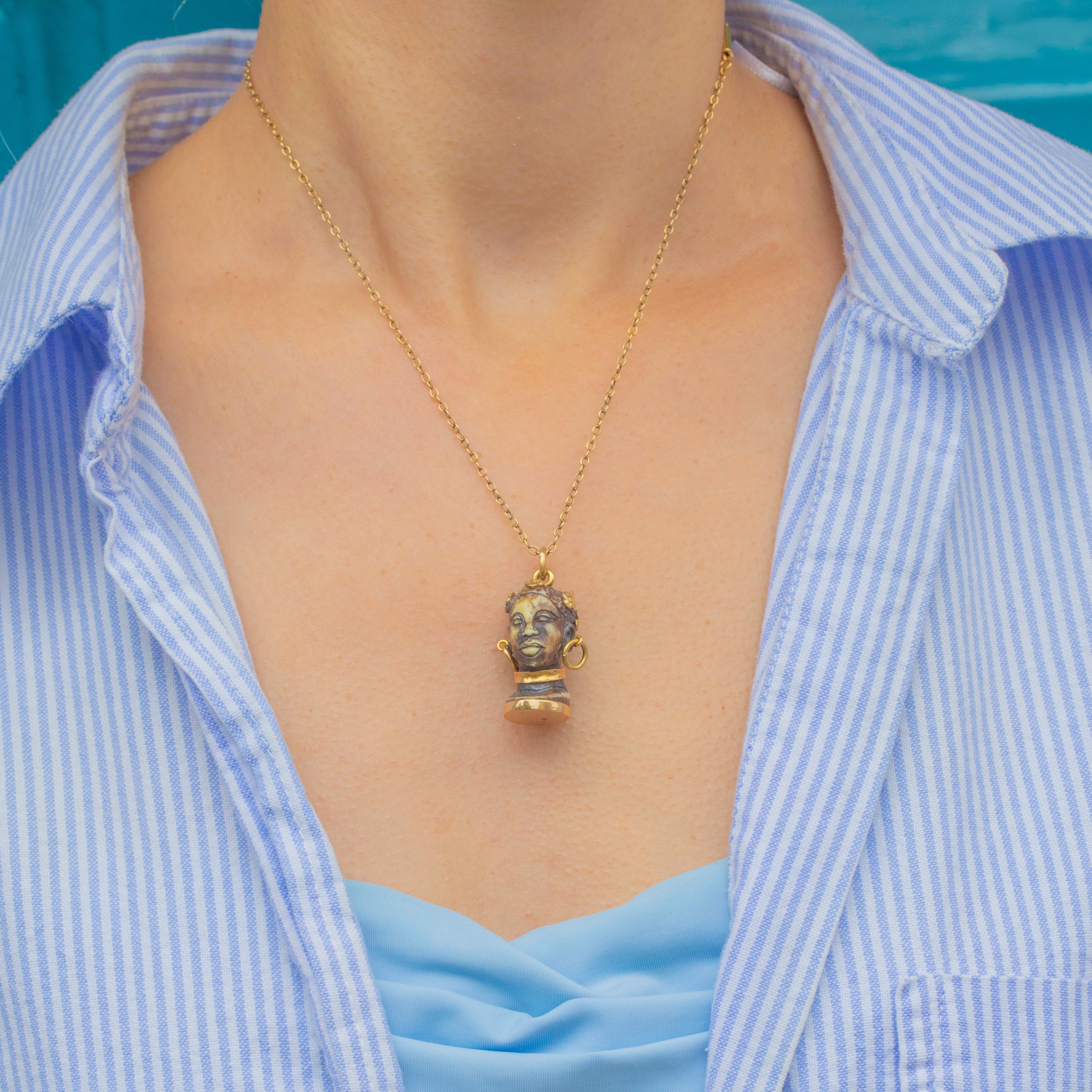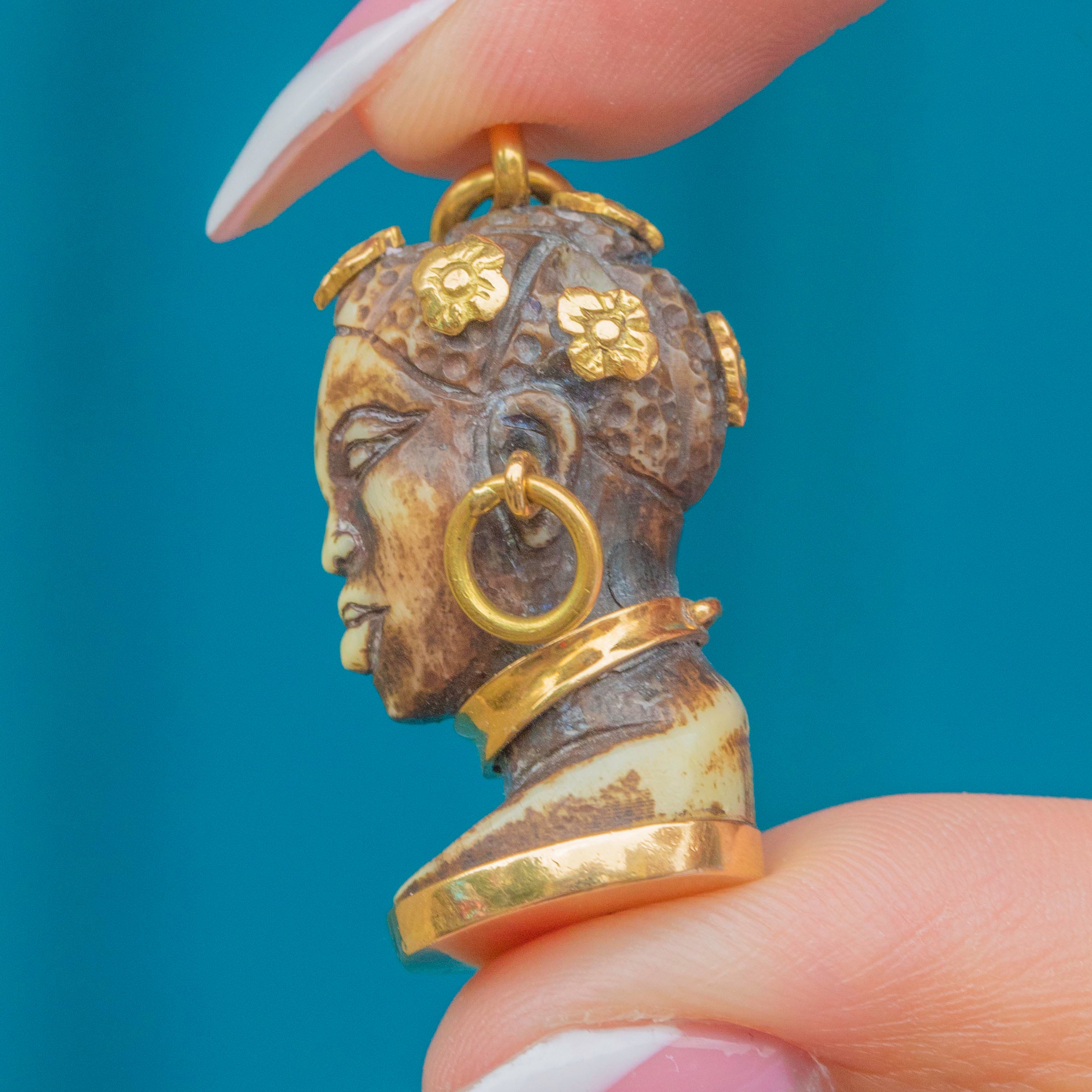 This striking Victorian-era pendant is crafted in 18ct Gold, displaying a woman’s head carved from Horn. The finely detailed bust is adorned with Gold hoop earrings and floral hair accents, all bringing rich contrast to the natural patina of the carved horn.