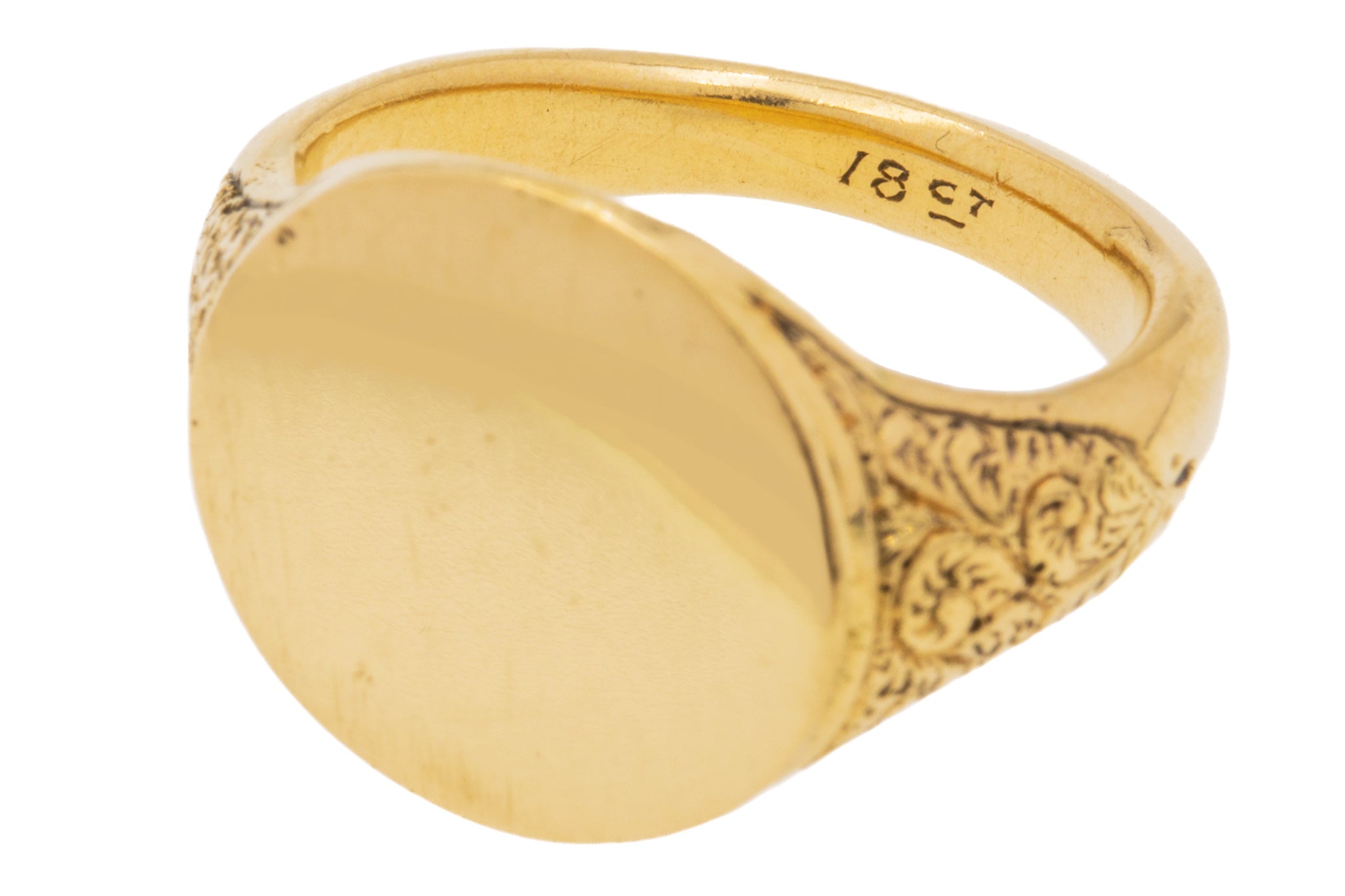 VERY GOOD. We absolutely adore this 18ct Gold engraved signet ring. This piece is a Victorian beauty, ripe with splendour and beautifully crafted. The Gold is absolutely divine and striking to the eye. The inside of the band has an '18CT' hallmark and the piece is smooth and comfortable to wear. This is a gorgeous piece with minimal wear to note, only to the inside of the band behind the signet face with a little porosity.