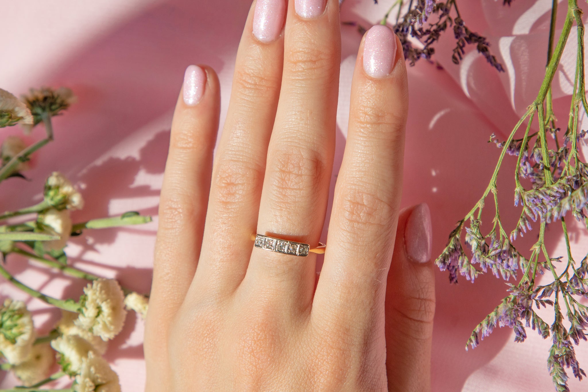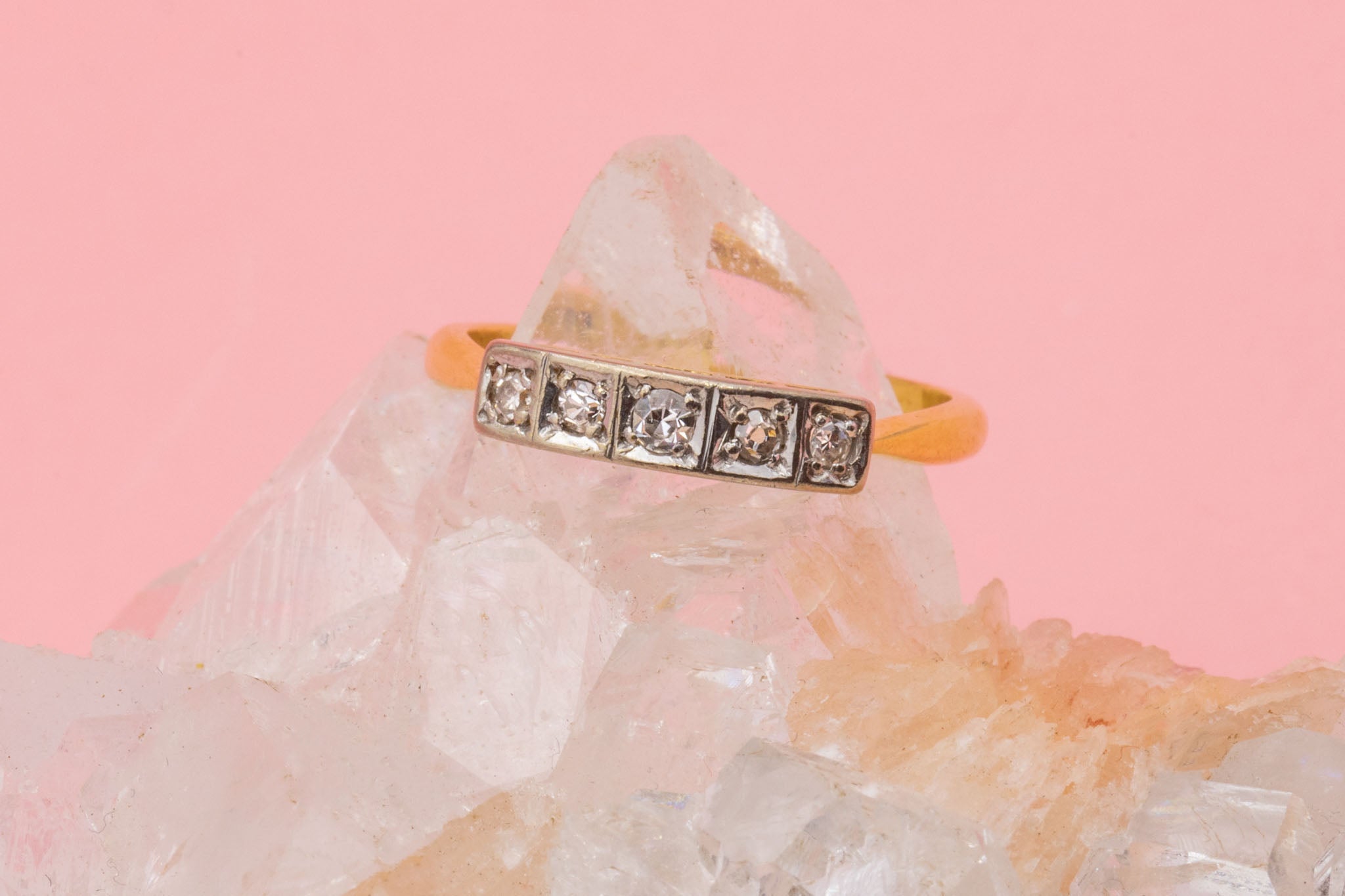 EXCELLENT. This 18ct Gold five stone Diamond ring is in excellent condition. Her Gold is glossy and bright, settings are intact, and she is free from any damage to note. Each Diamond is securely nestled into its settings completely free from any chips or fleabites, so you can wear her with confidence! A divine vintage Gold ring to add to your collection.