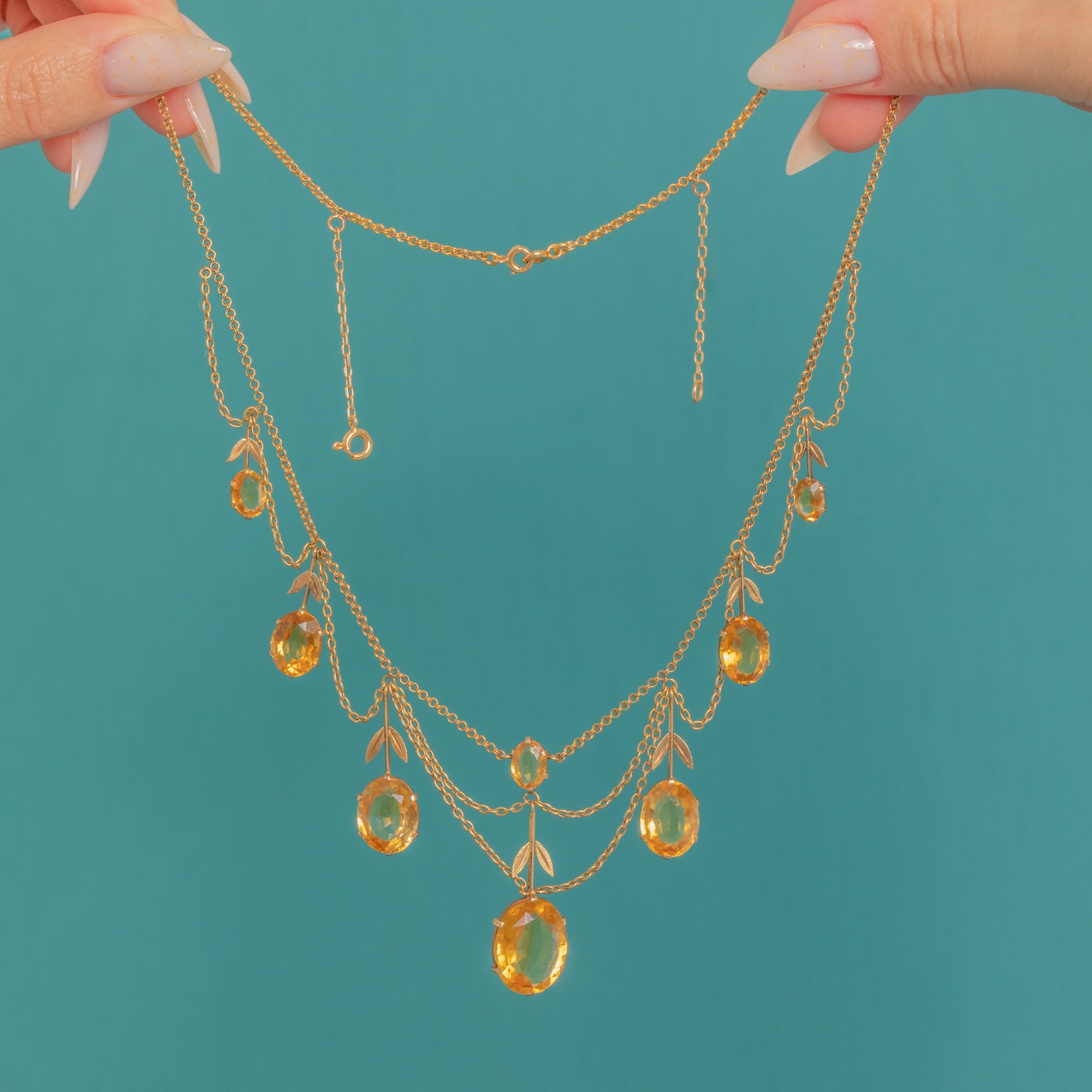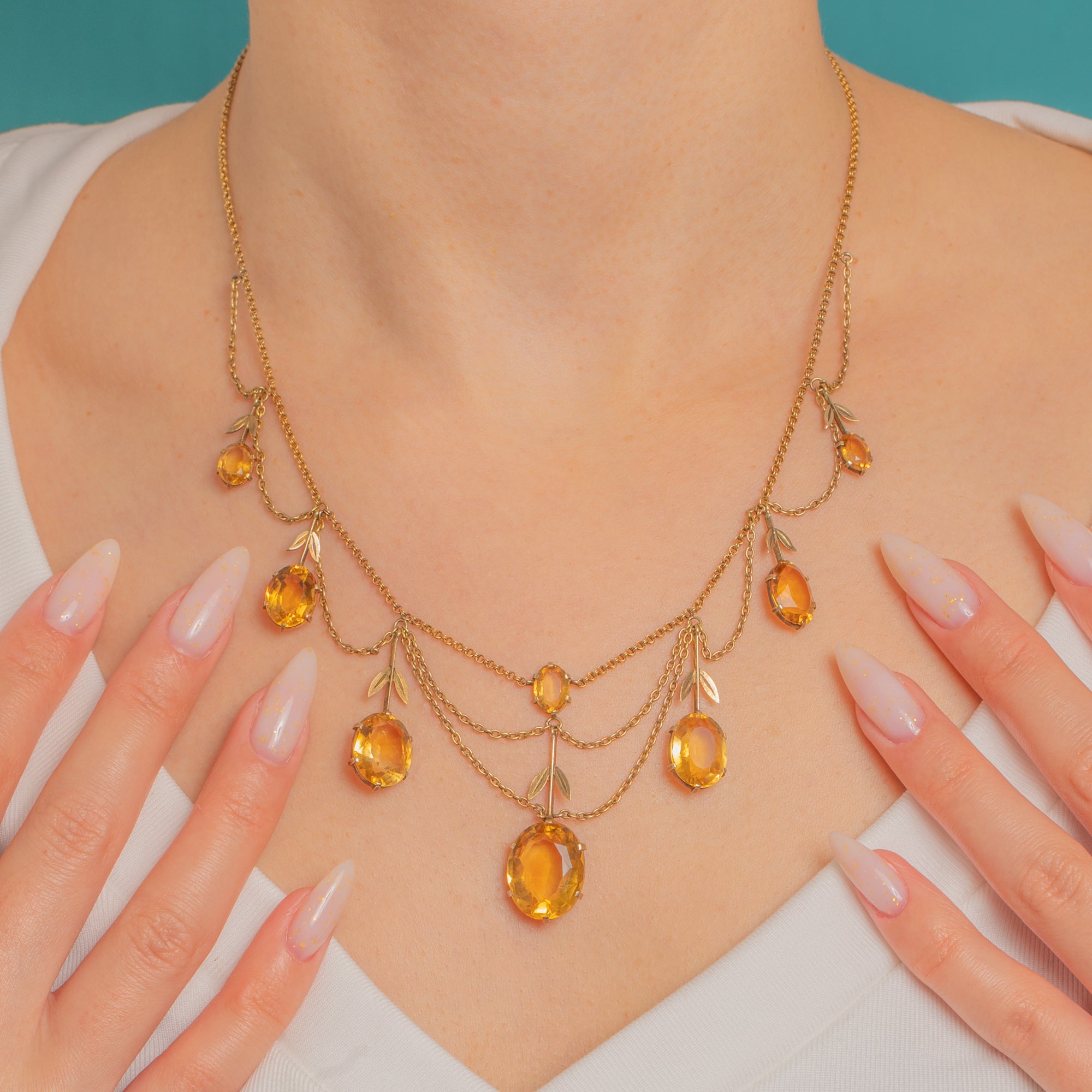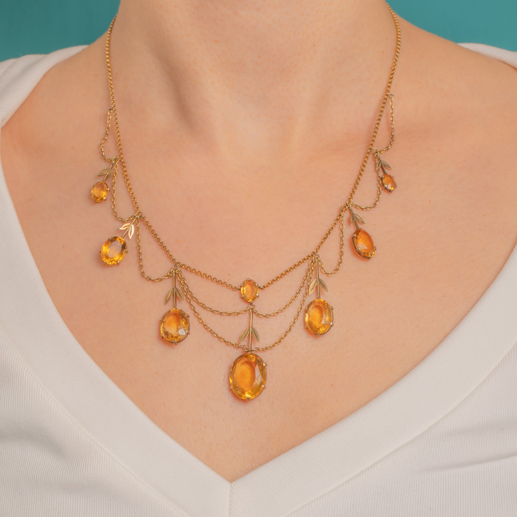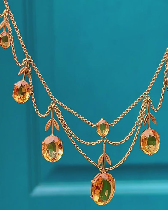 A graceful French Victorian festoon, this 18ct Gold necklace drapes in seven refined swags punctuated by articulated drops, slender bars and delicate foliate sprigs. The open, airy garland silhouette flatters the neckline while honey-yellow Citrines glow with sunshine warmth.
