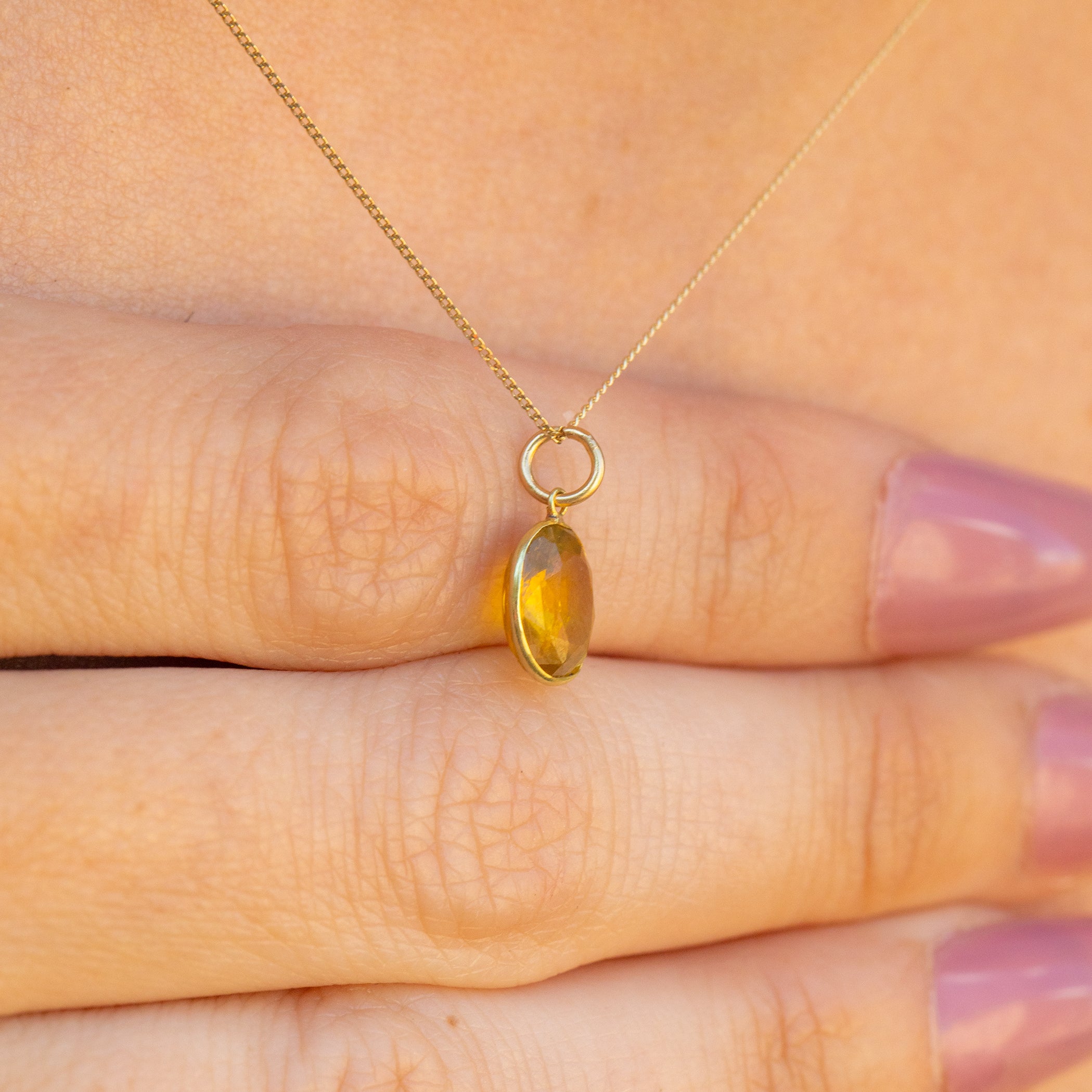 EXCELLENT. This 18ct Gold Garnet bezel-set charm is in excellent condition. The Garnet is secure within the bezel setting and bears no damage to note. The inclusions provide gorgeous refractions and a multitude of different tones. The 18ct Gold is in top condition and perfectly accompanies the Garnet. You'll turn your friends green with envy with this green Garnet pendant!