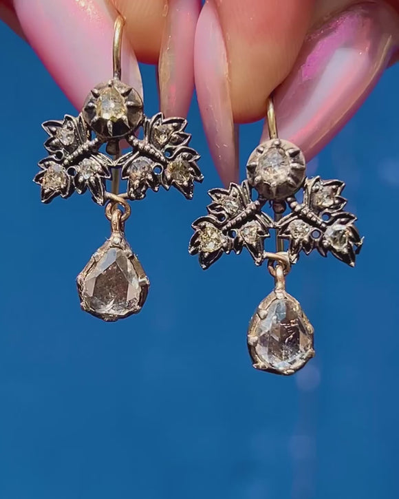 Complete with Silver settings, 18ct Gold hooks and rare Georgian rose-cut Diamonds, these antique earrings are certainly show stoppers!