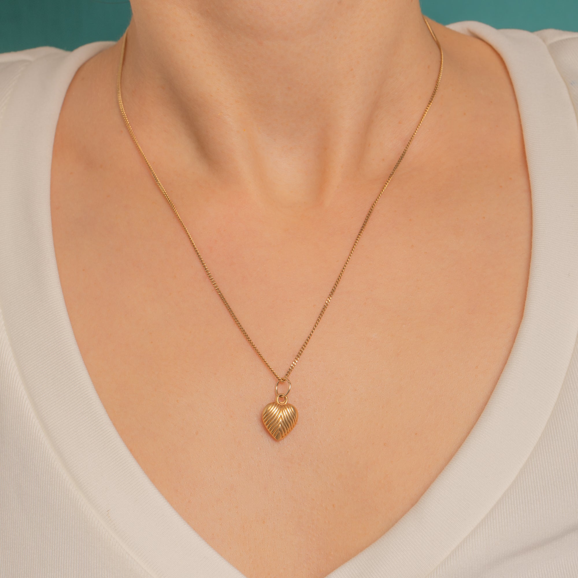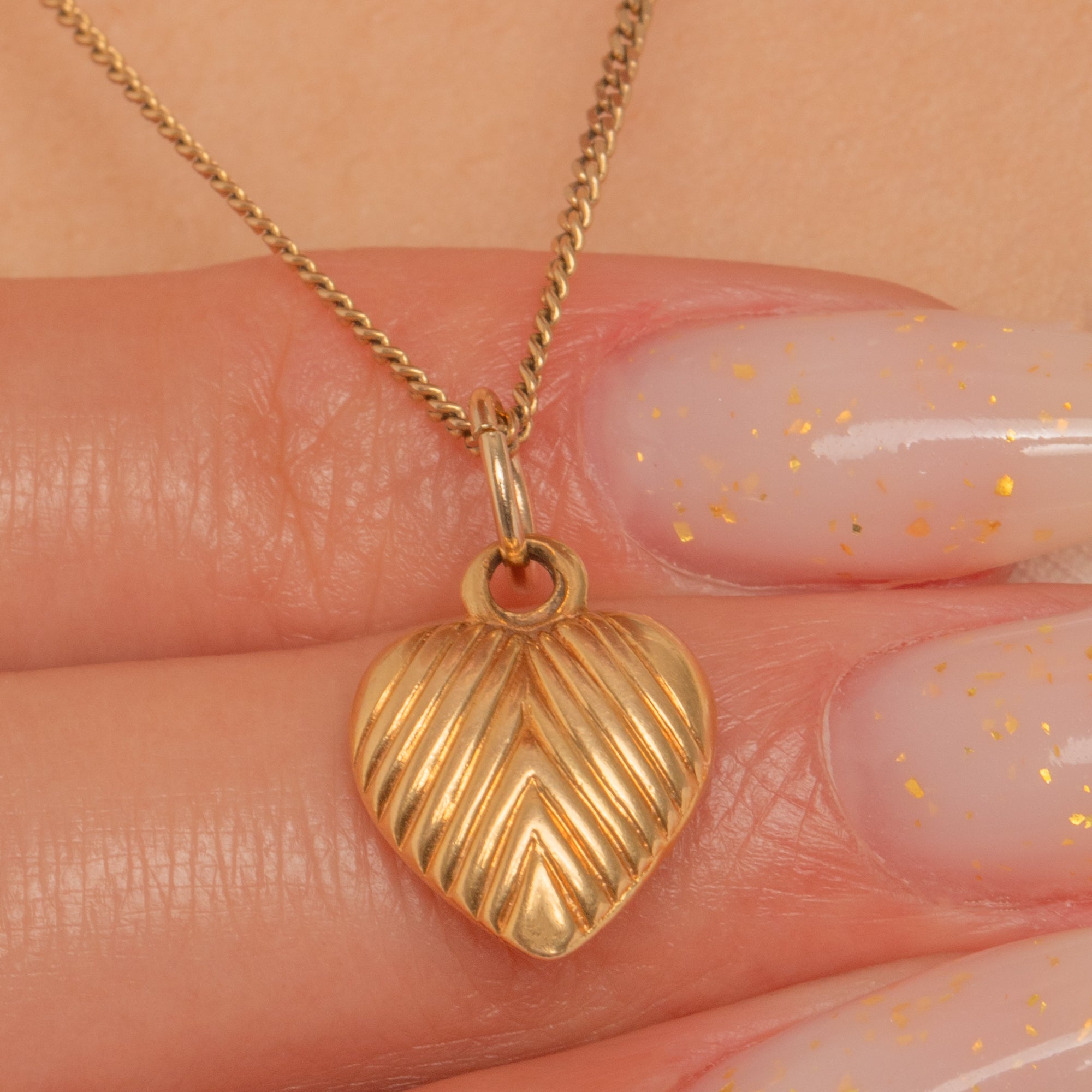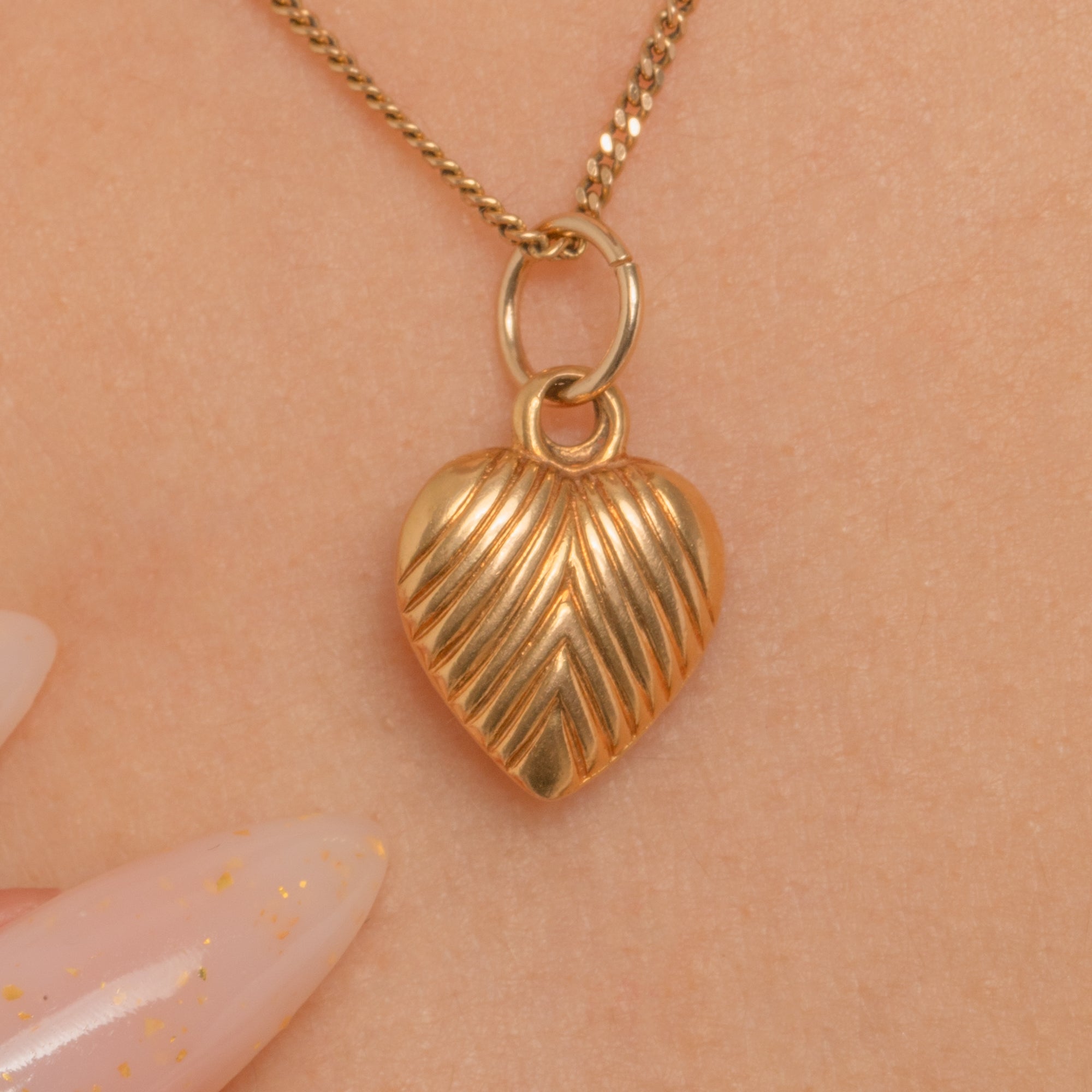 Sweet and timeless, this Victorian 18ct Gold heart pendant is adorned with crisp chevron ribbing and a softly puffed profile that catches the light beautifully. Its bright polished finish enhances the texture, creating a refined yet playful glow.