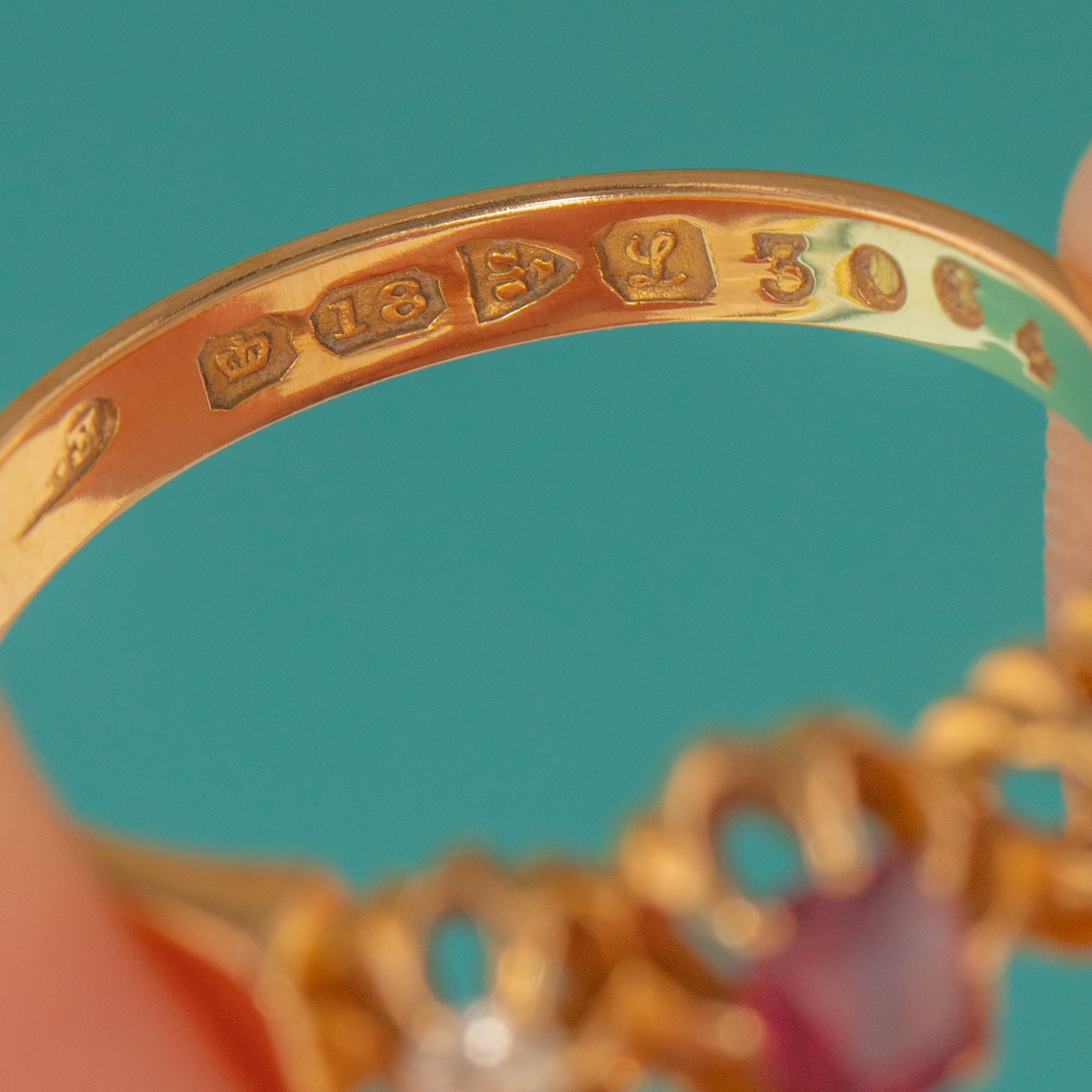 MATERIALS: Tests as 18ct Gold, Natural Ruby (0.25ct), Old Mine Cut-Diamonds (0.06ct).