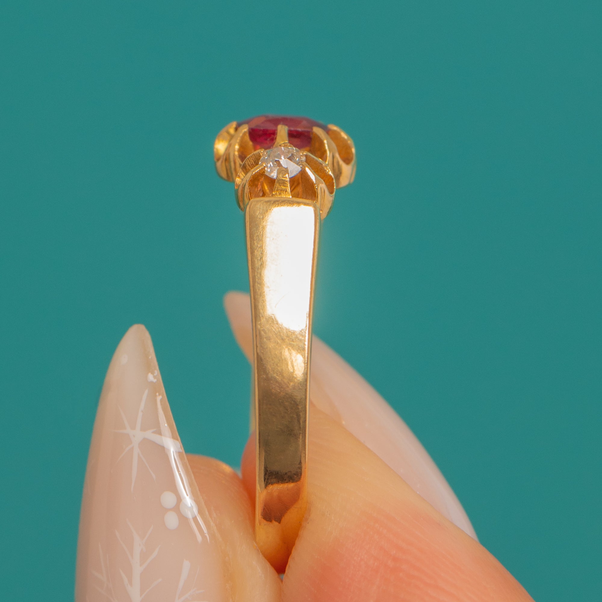 A romantic Belle Époque trilogy ring in rich 18ct Gold, set with a deep pink-red Natural Ruby in old cushion cut between two sparkling old mine cut Diamonds. The stones sit in characterful buttercup settings, with subtly scrolled, tapered shoulders flowing into a polished shank.