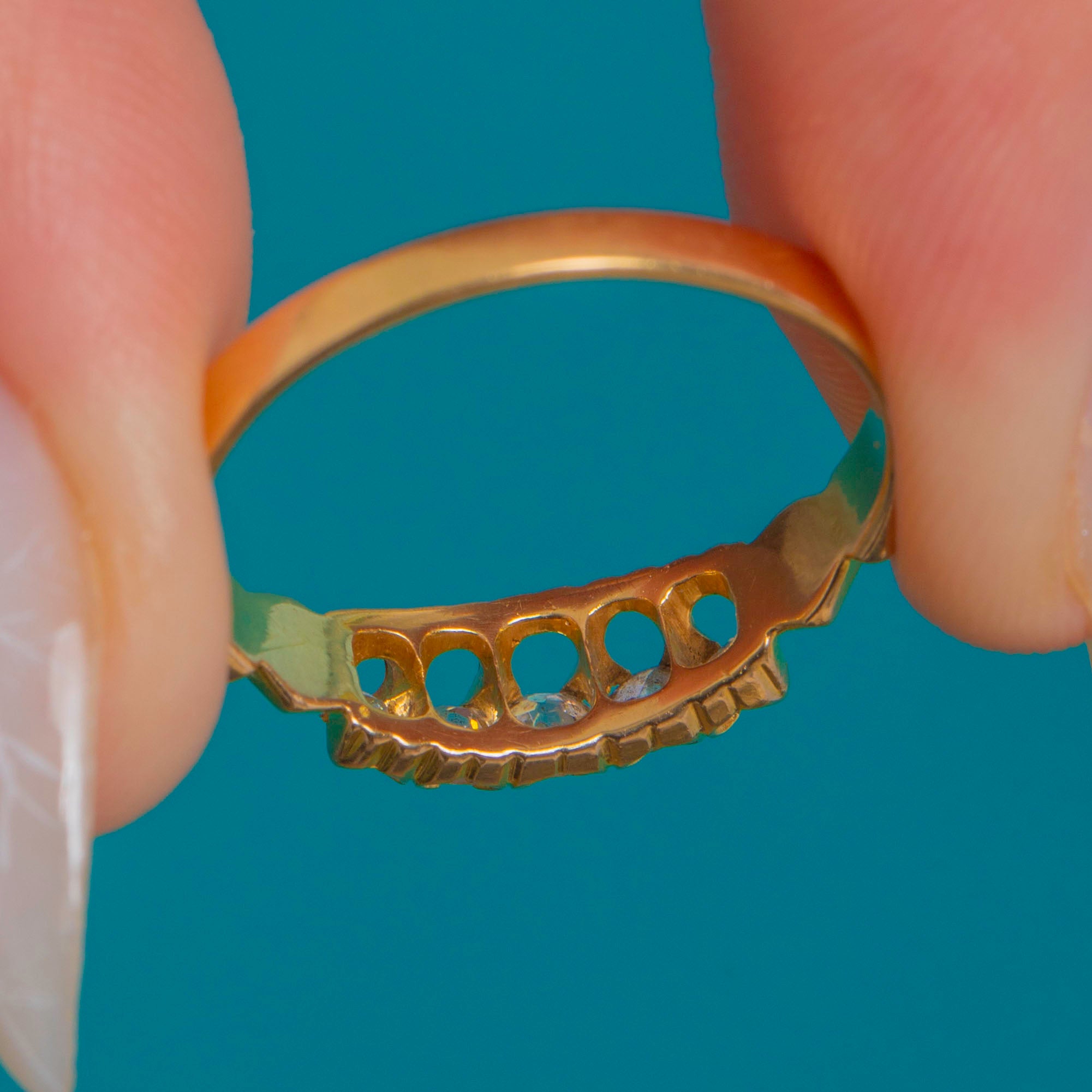 A timeless five-stone ring set with a beautifully graduated line of Old Mine Cut Diamonds in rich 18ct Gold. The low, finger-hugging “boat” head is crafted with scalloped claws and open backs, allowing the old cuts to glow with their distinctive broad flashes and charming open culets.