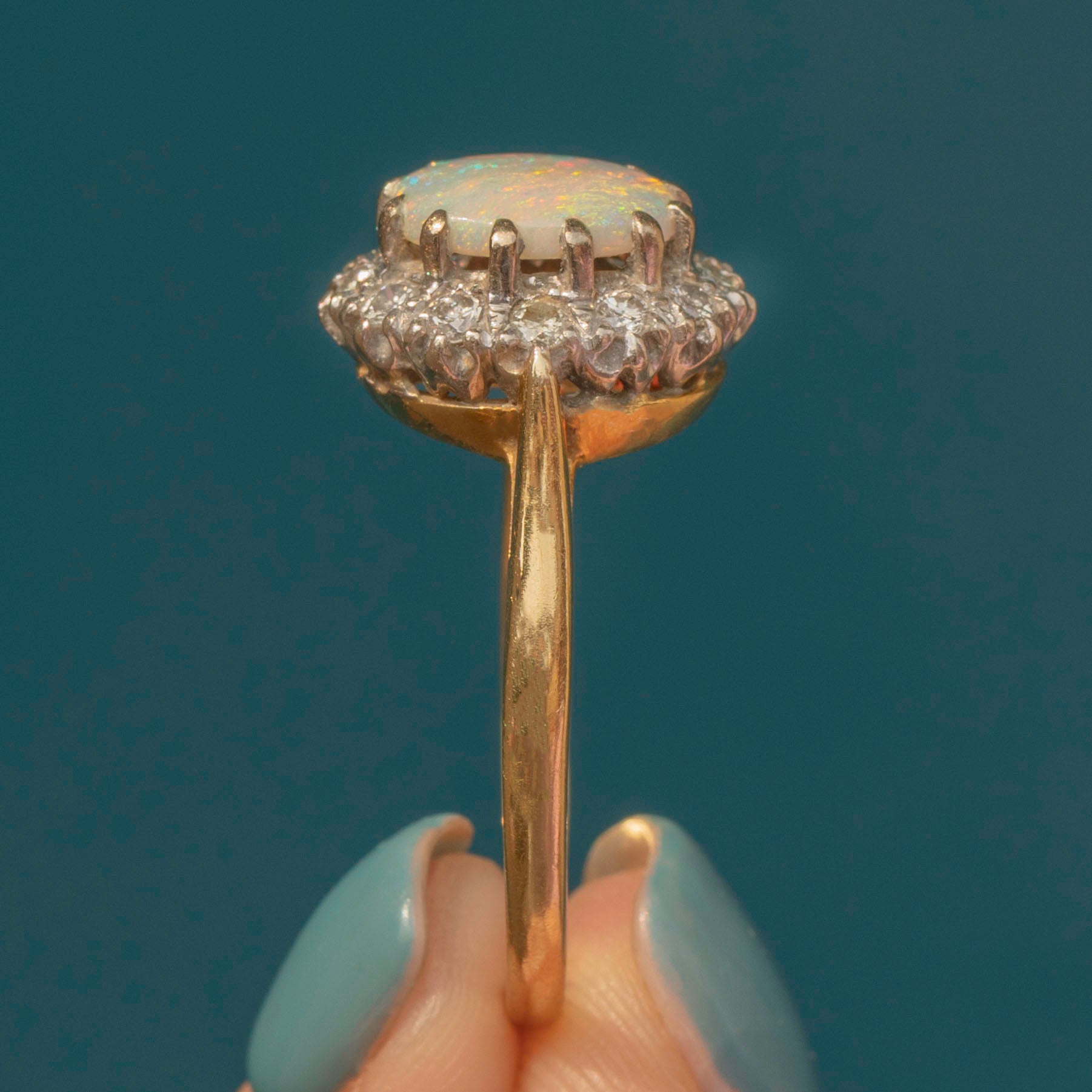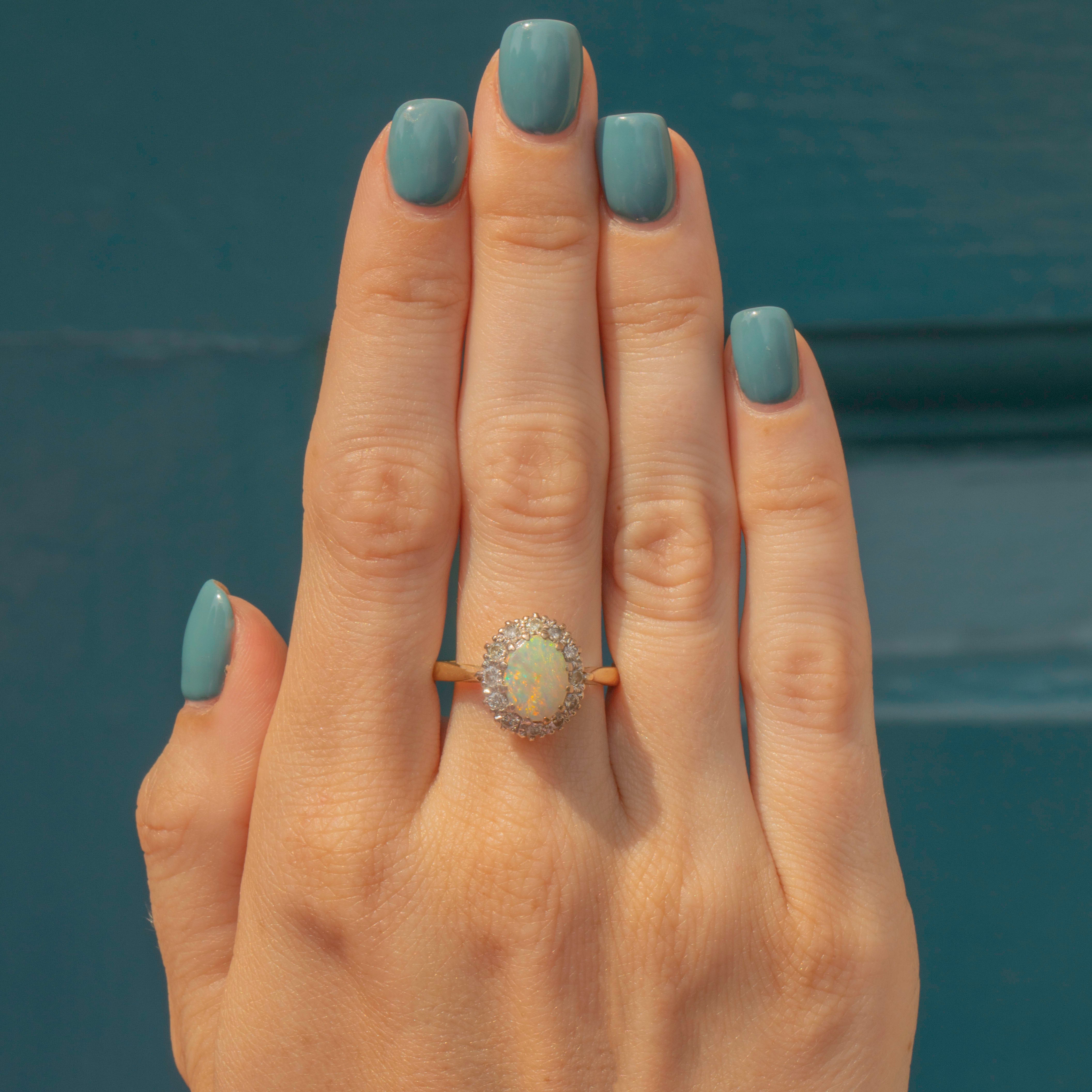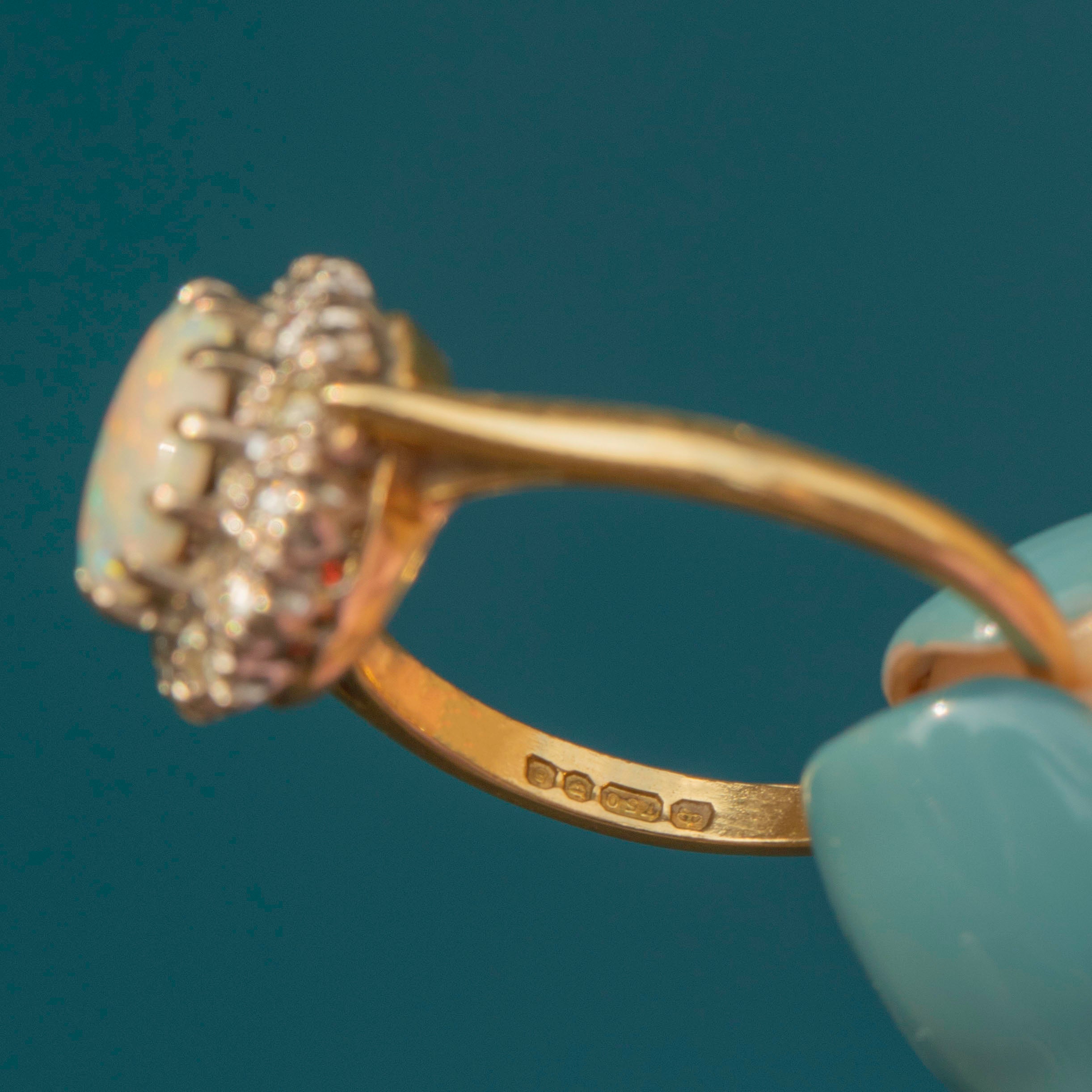 EXCELLENT. This 18ct Gold Opal Diamond cluster ring is in excellent condition. Her milky Opal is set securely in her claw settings, without any scuffs or dings to the surface. Her twelve haloing Diamonds are all present, securely set and free from chips or fleabites. The rich 18ct Gold band is in wonderful condition and has kept her saturated tone well over the years. This vintage treasure will become your newest obsession!