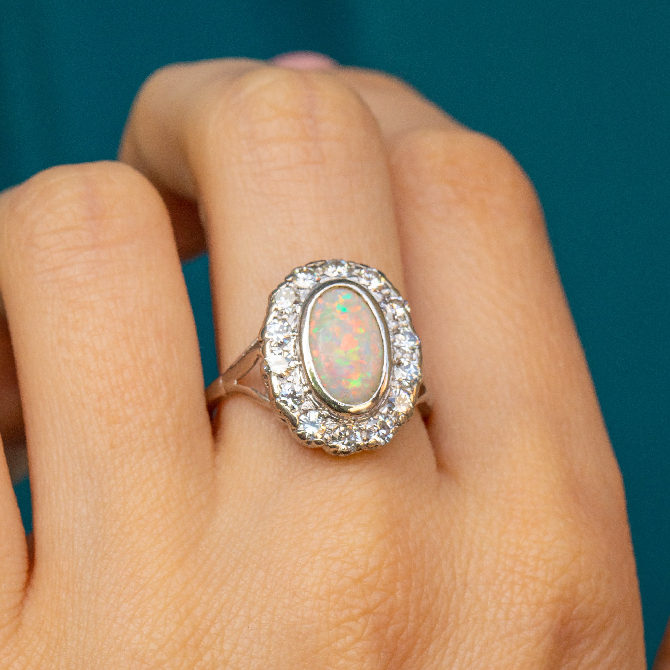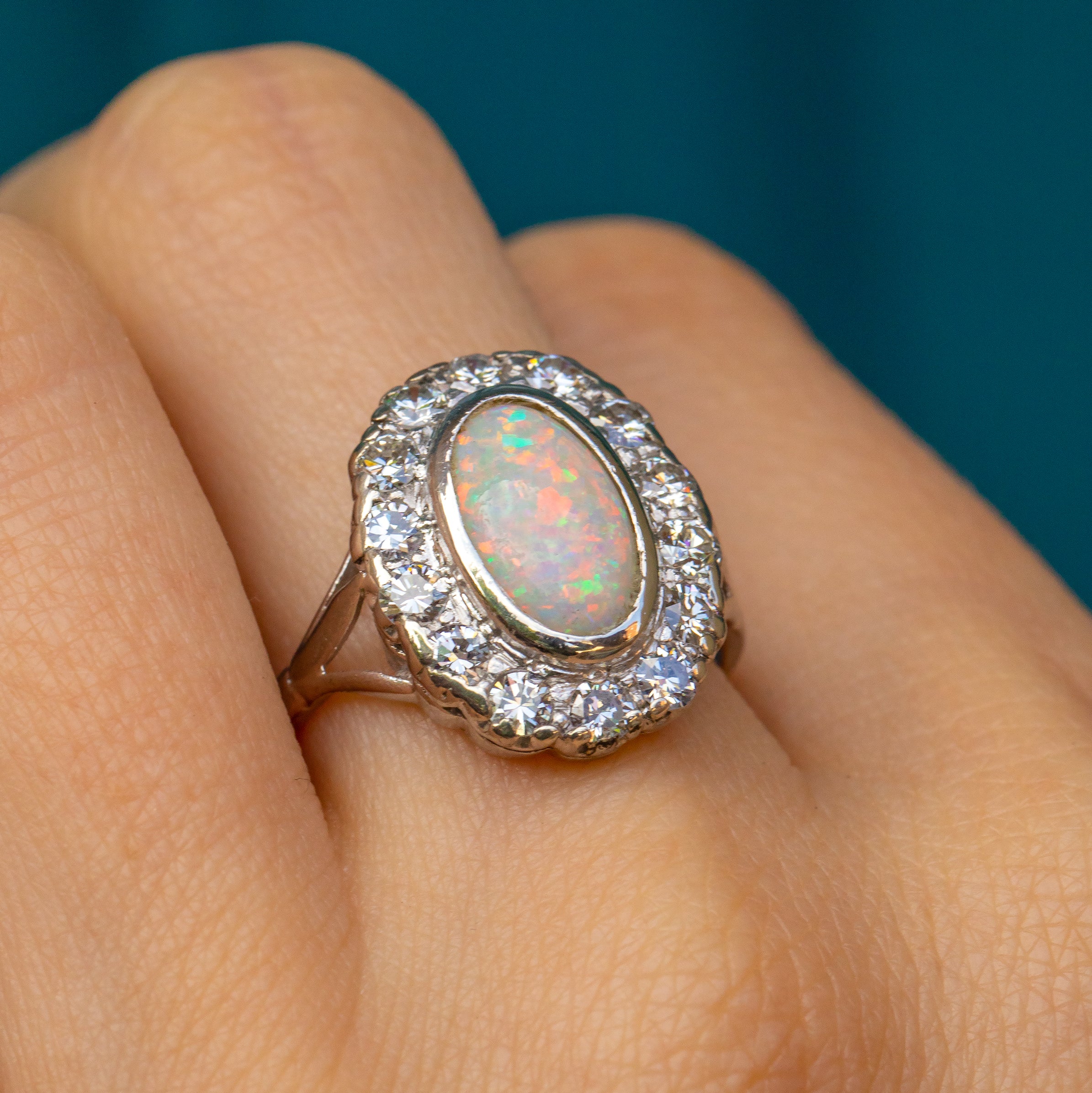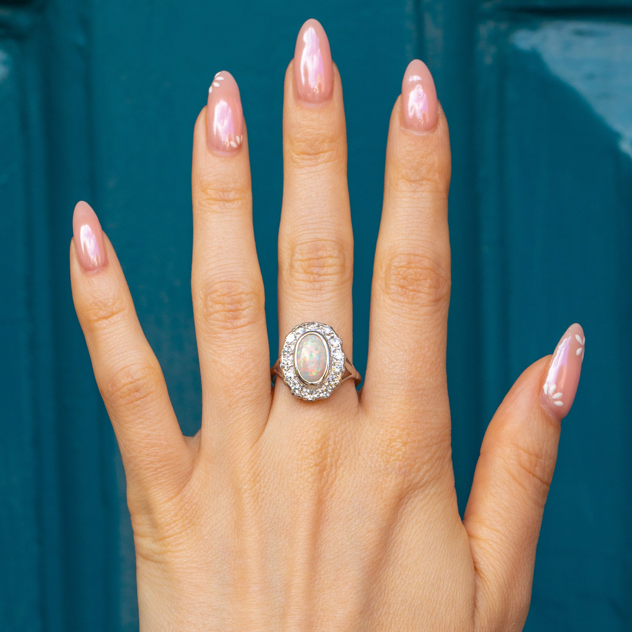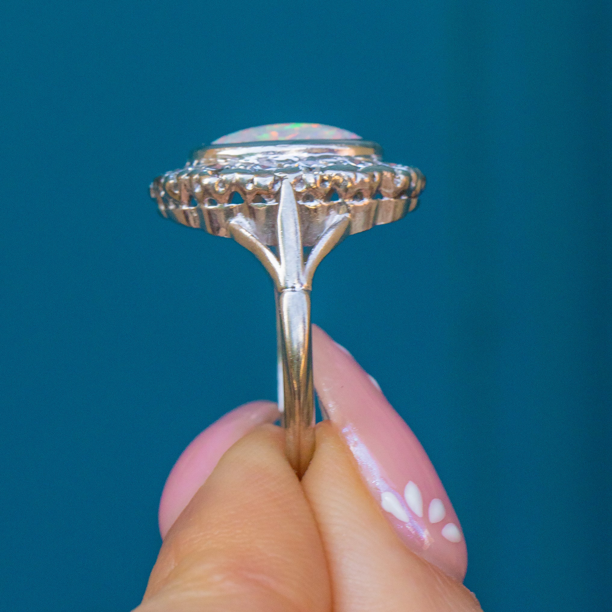 Haloing the already impressive Opal are 14 scintillating Diamonds, creating an altogether show-stopping piece that looks incredible on the finger. We adore the amount of finger coverage that this Edwardian ring provides, speaking entirely for itself with its captivating presence!
