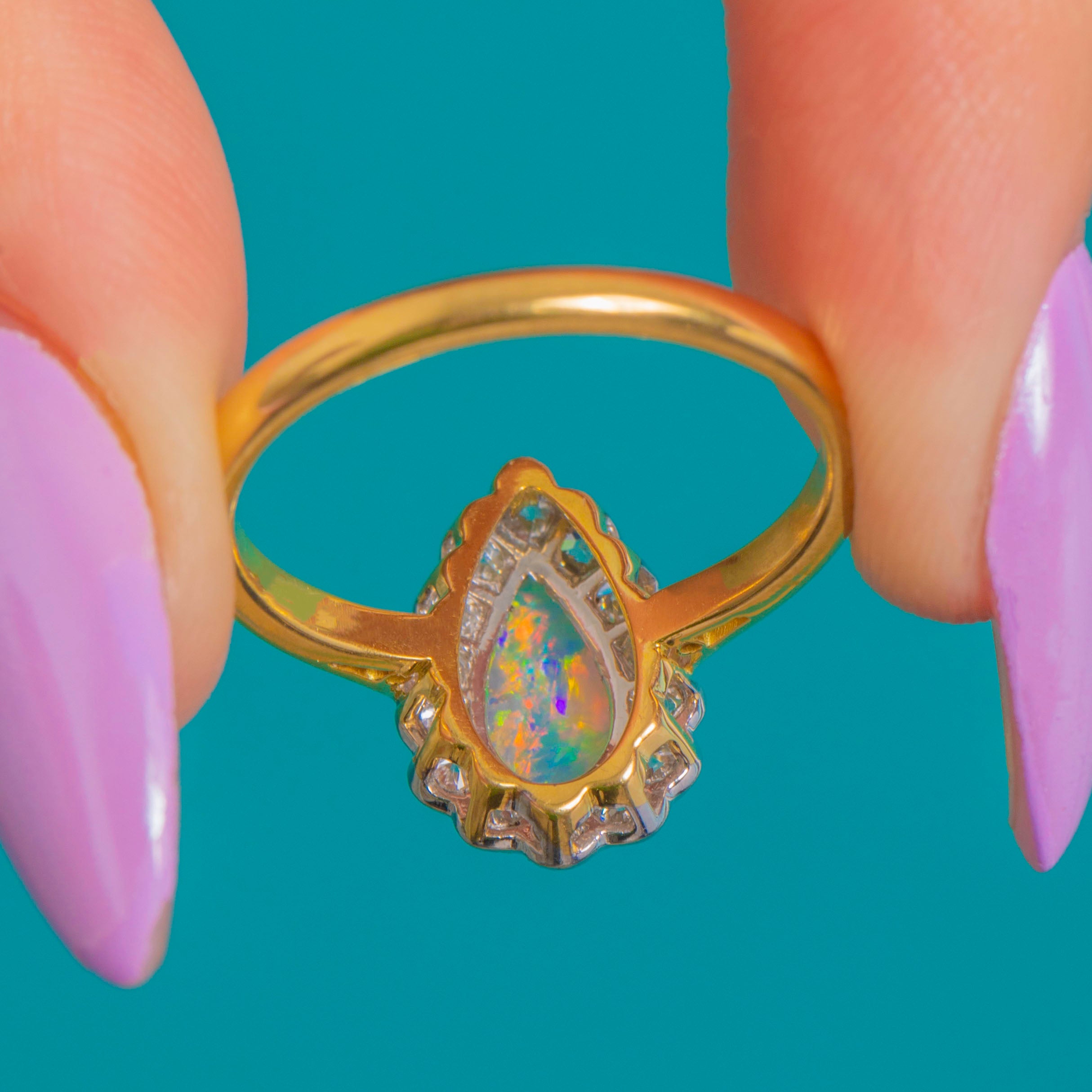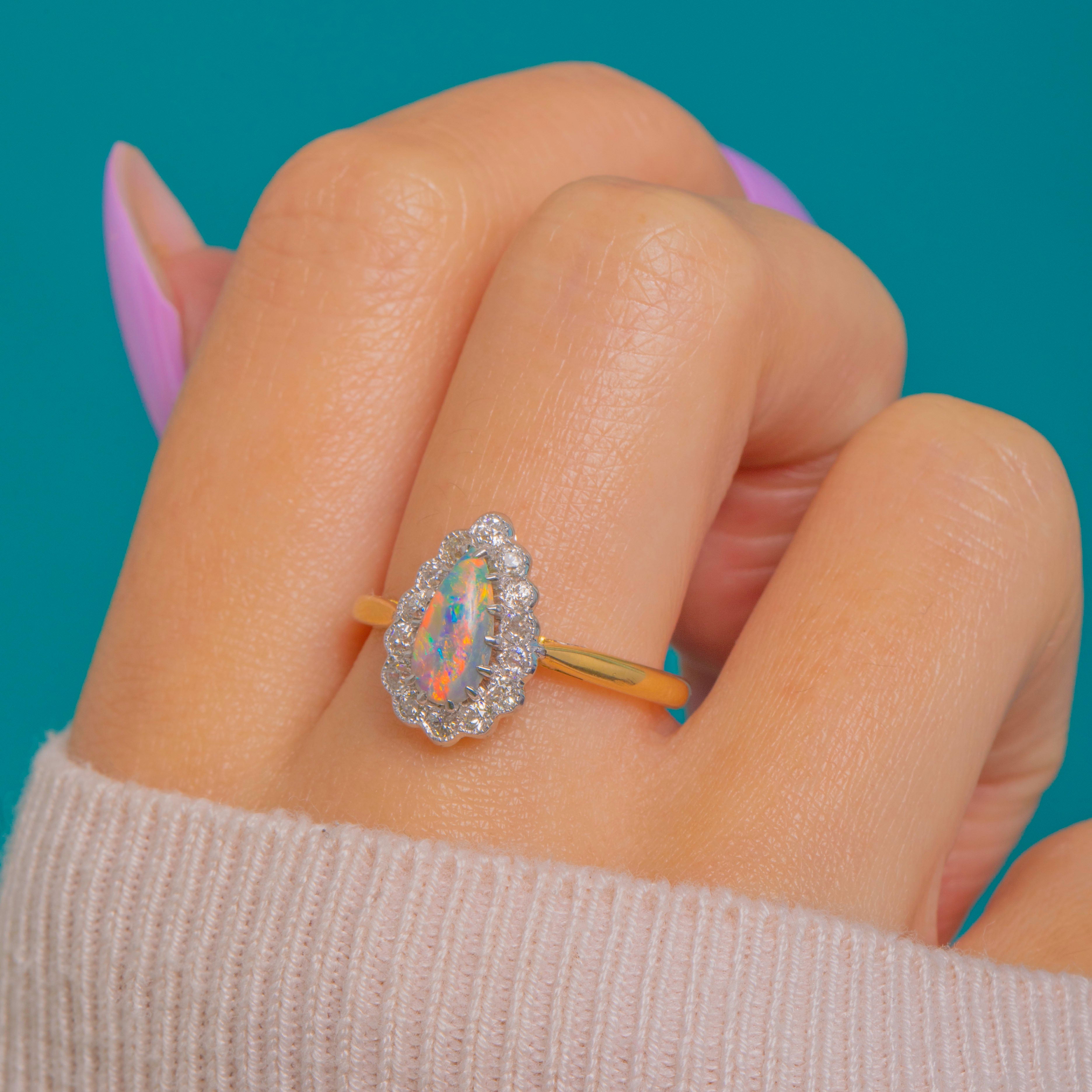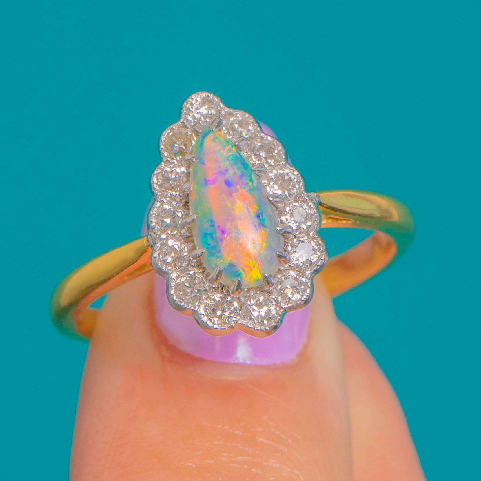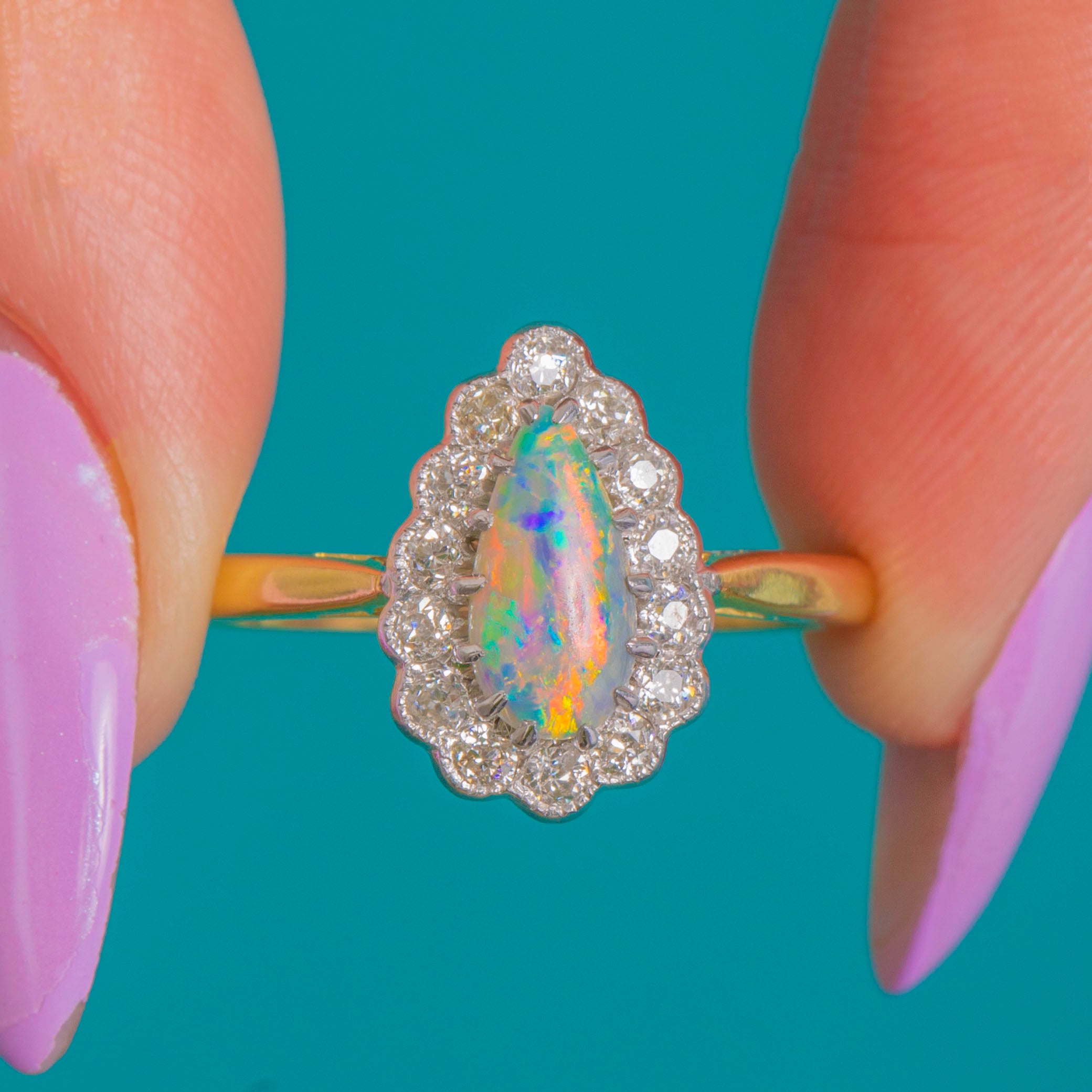 This beautiful Art Deco cluster ring is a wonderfully elegant design, dating to c.1940. Crafted in 18ct Gold with a Platinum-topped setting, it centres on a vivid pear-shaped Opal alive with flashes of green, blue, orange and pink, all framed by a sparkling surround of Diamonds.