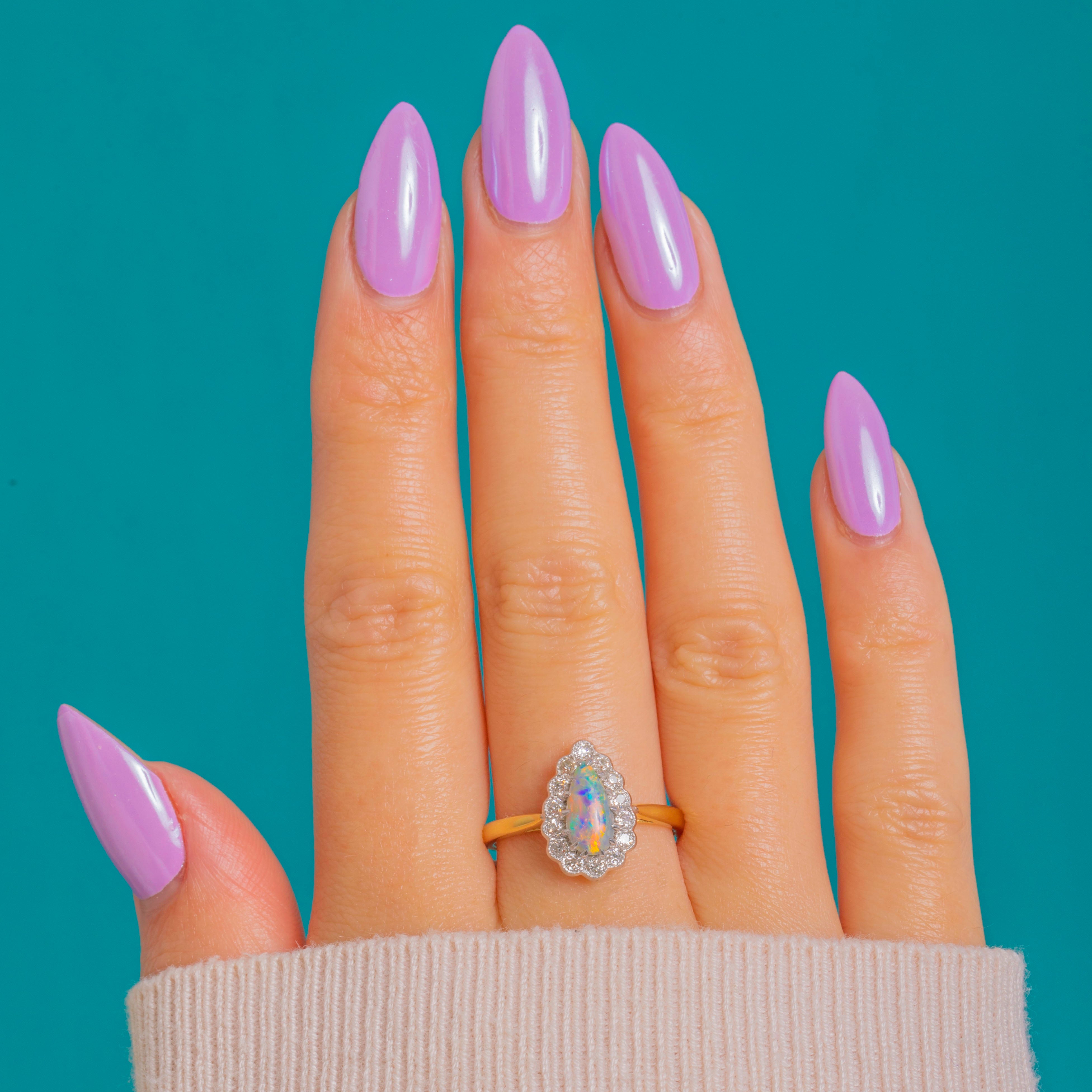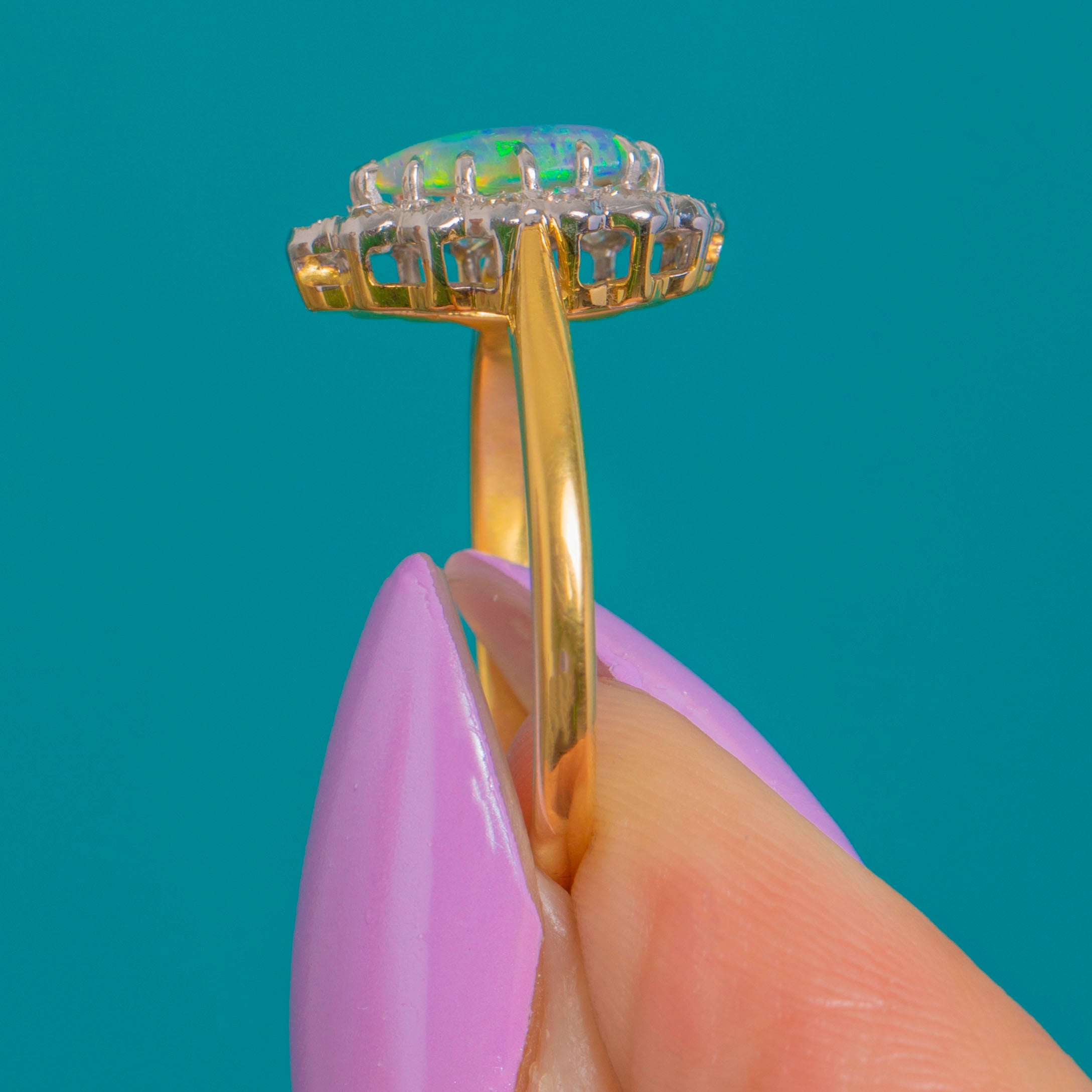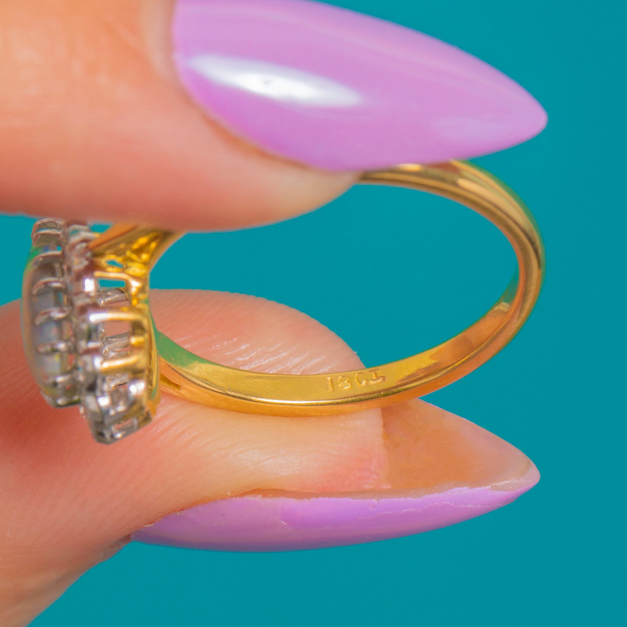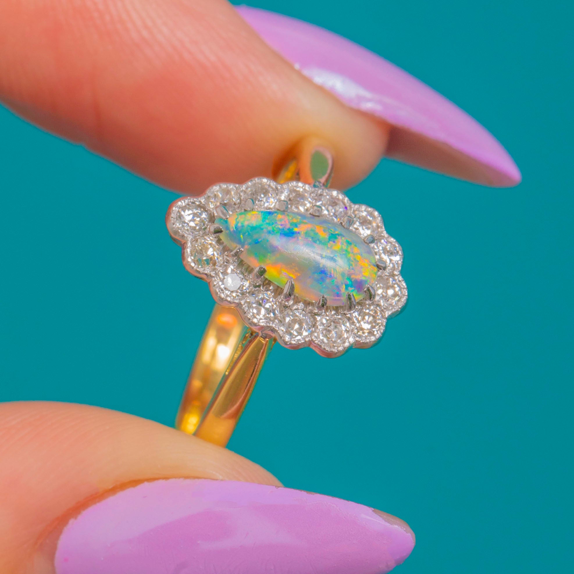 The delicate cluster shape gives the ring a refined, timeless look, while the contrast between the glowing Opal and bright Diamonds is especially striking. With approximately 0.70cts of Opal and 0.30cts of Diamonds combined, it is a lovely antique ring with plenty of presence yet an easy, wearable scale.