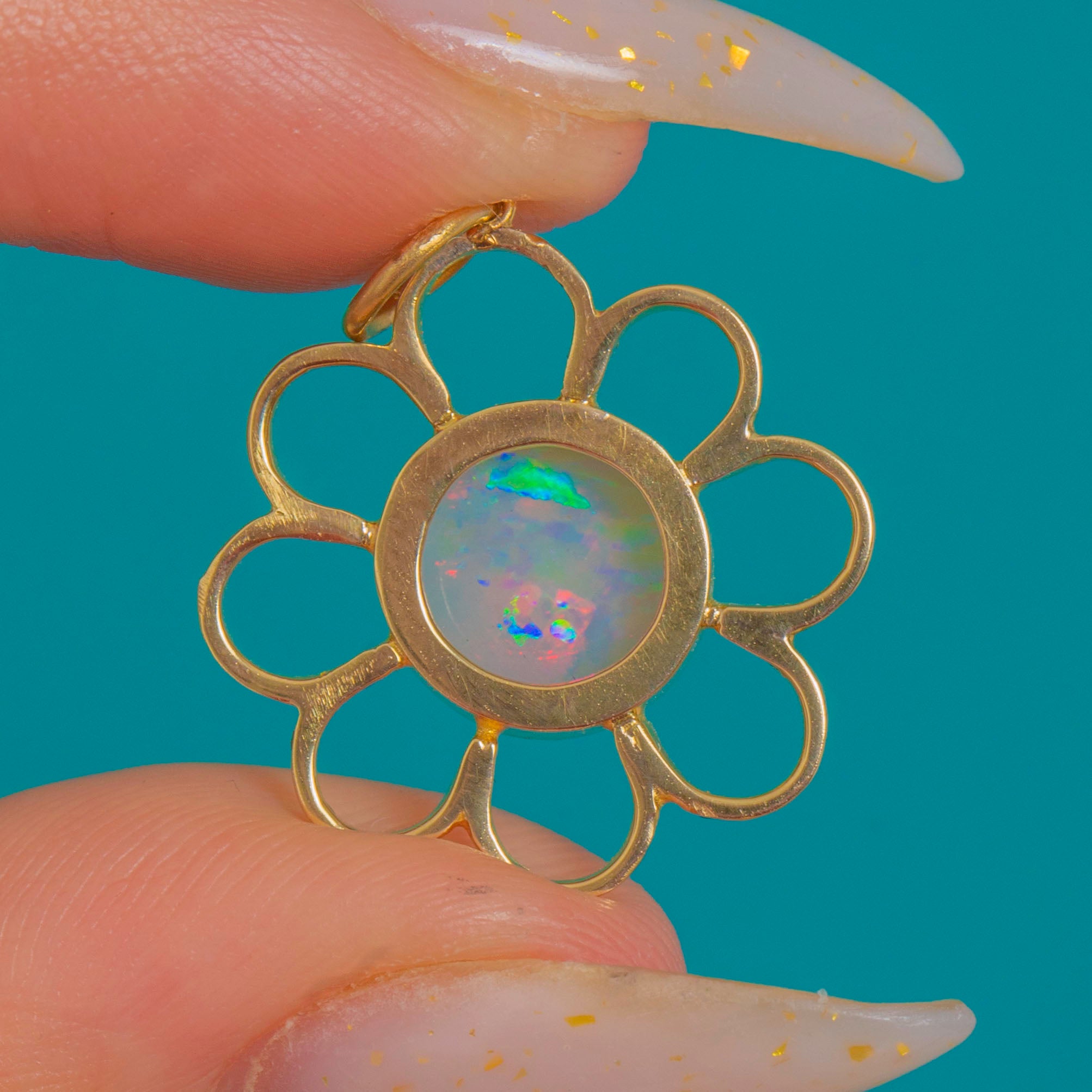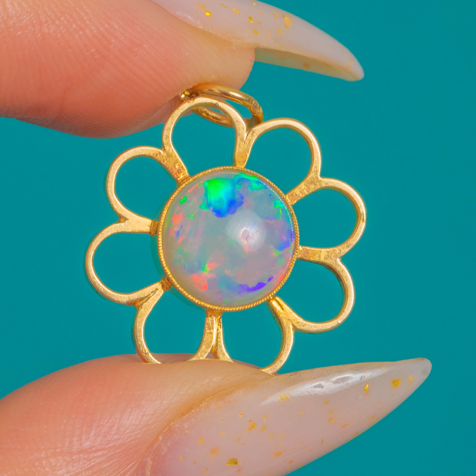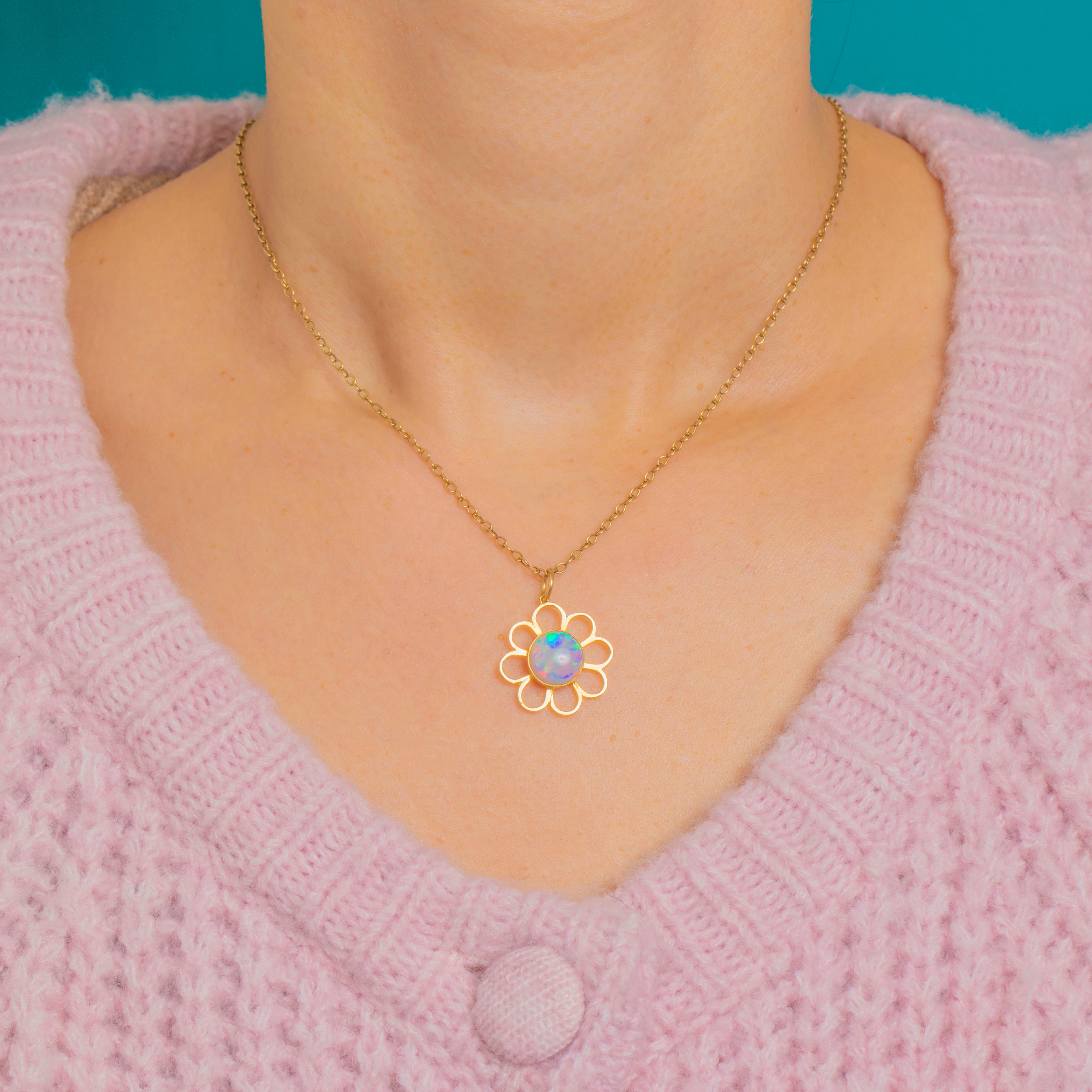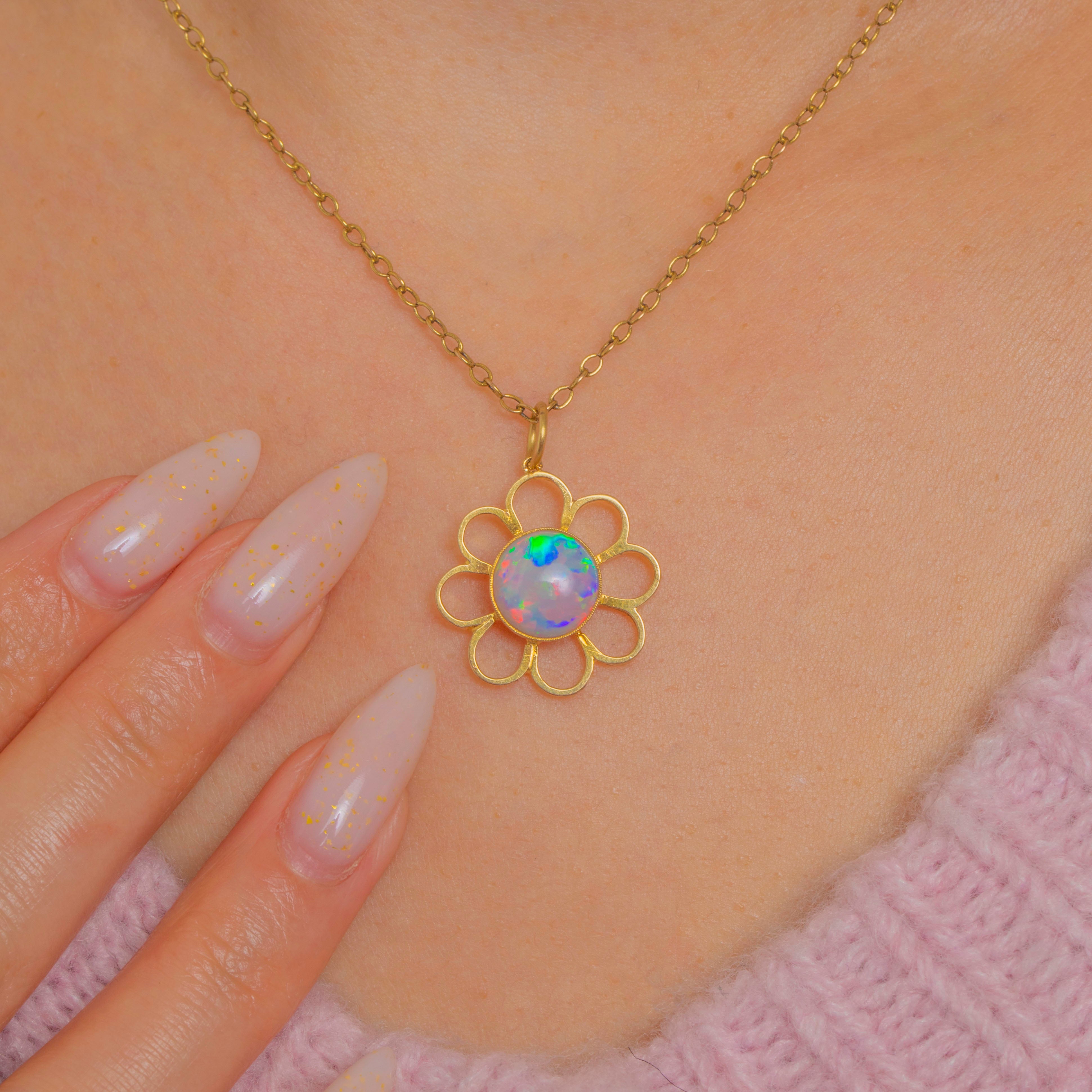 A sweet bloom in Gold, this Vintage Opal flower pendant captures the joy of a daisy in full sunshine. Eight openwork petals frame a luminous round Opal cabochon, its surface alive with playful flashes of pink, green and blue. The bezel is finished with a delicate beaded rim, adding a refined touch to the pendant’s graphic, airy silhouette.