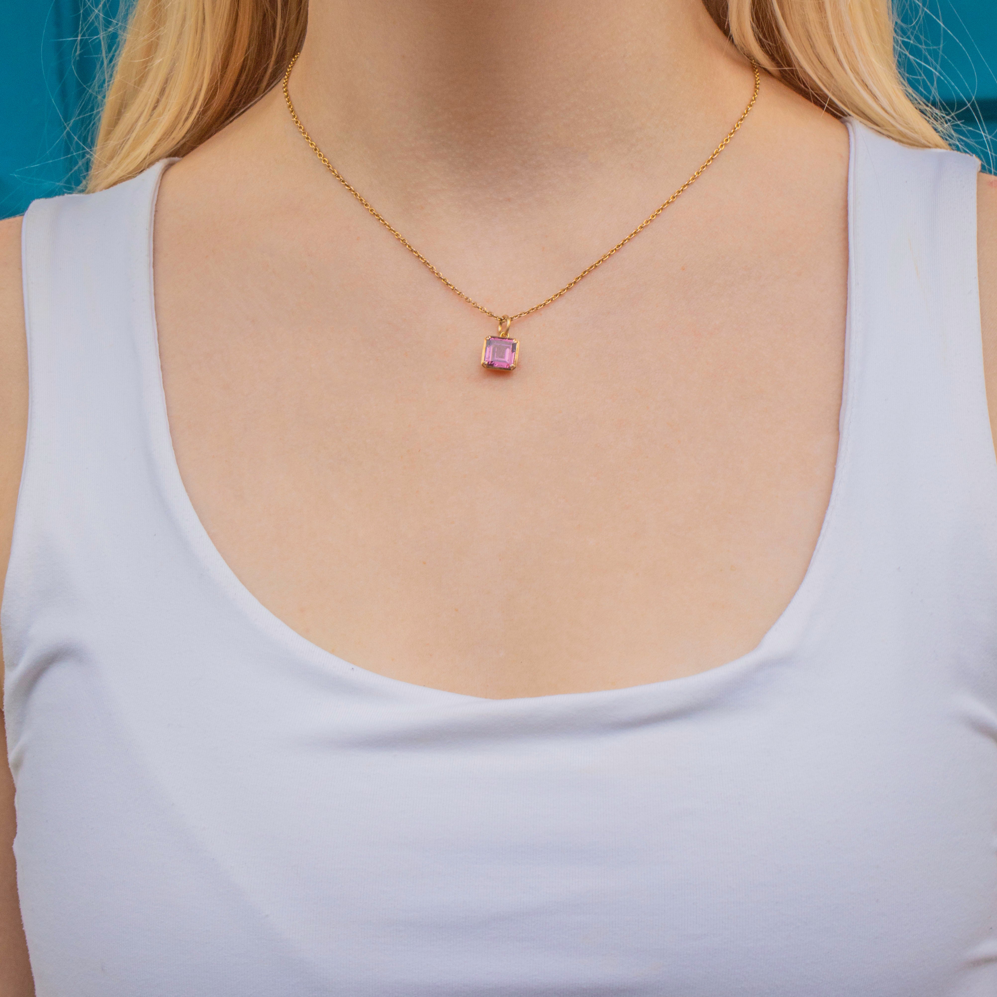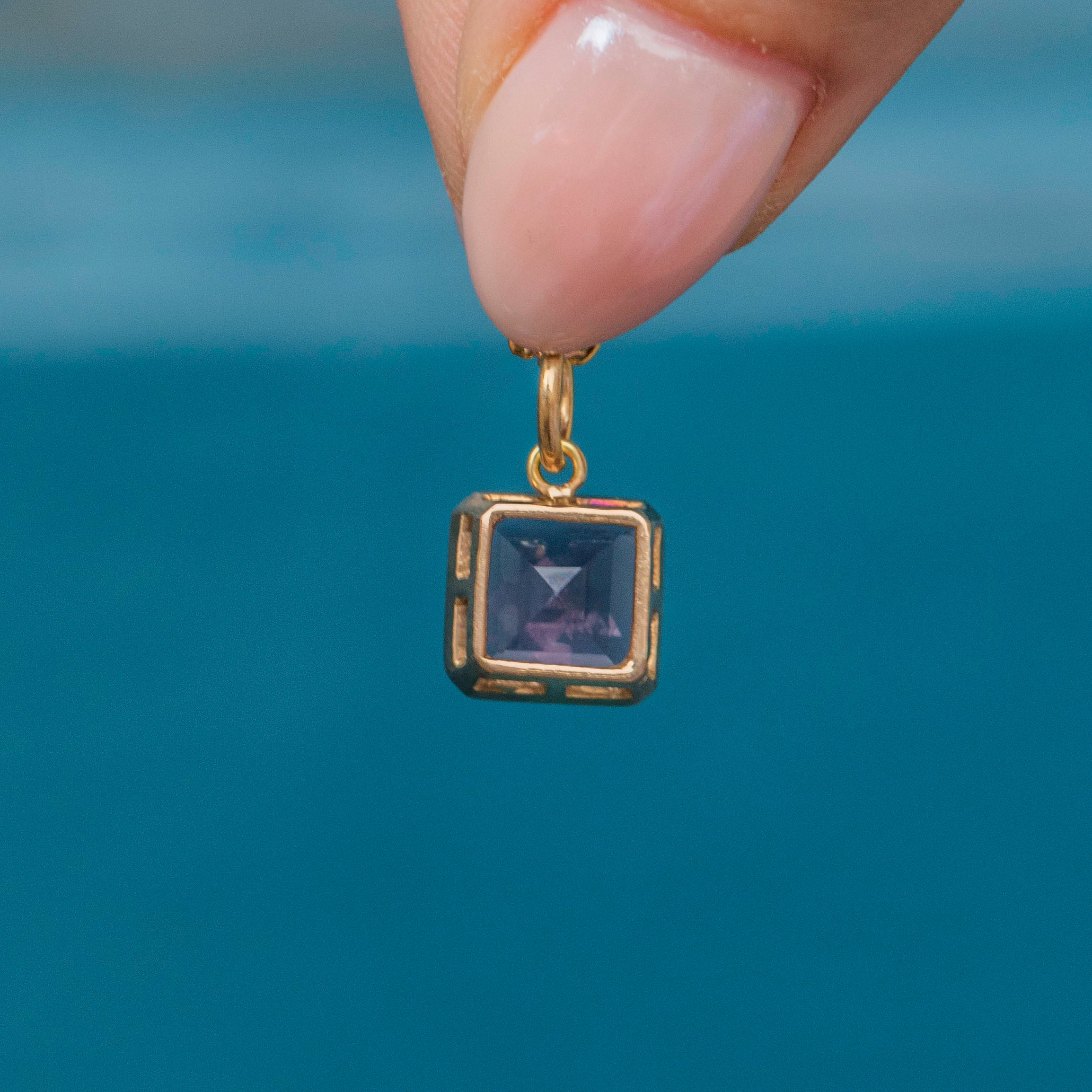 Add a pop of colour to your décolletage with this Art Deco 18ct Gold purple synthetic Spinel charm! Boasting gorgeous geometric facets, this Art Deco charm is crafted from richly saturated 18ct Gold and homes a violet hued Synthetic Spinel.