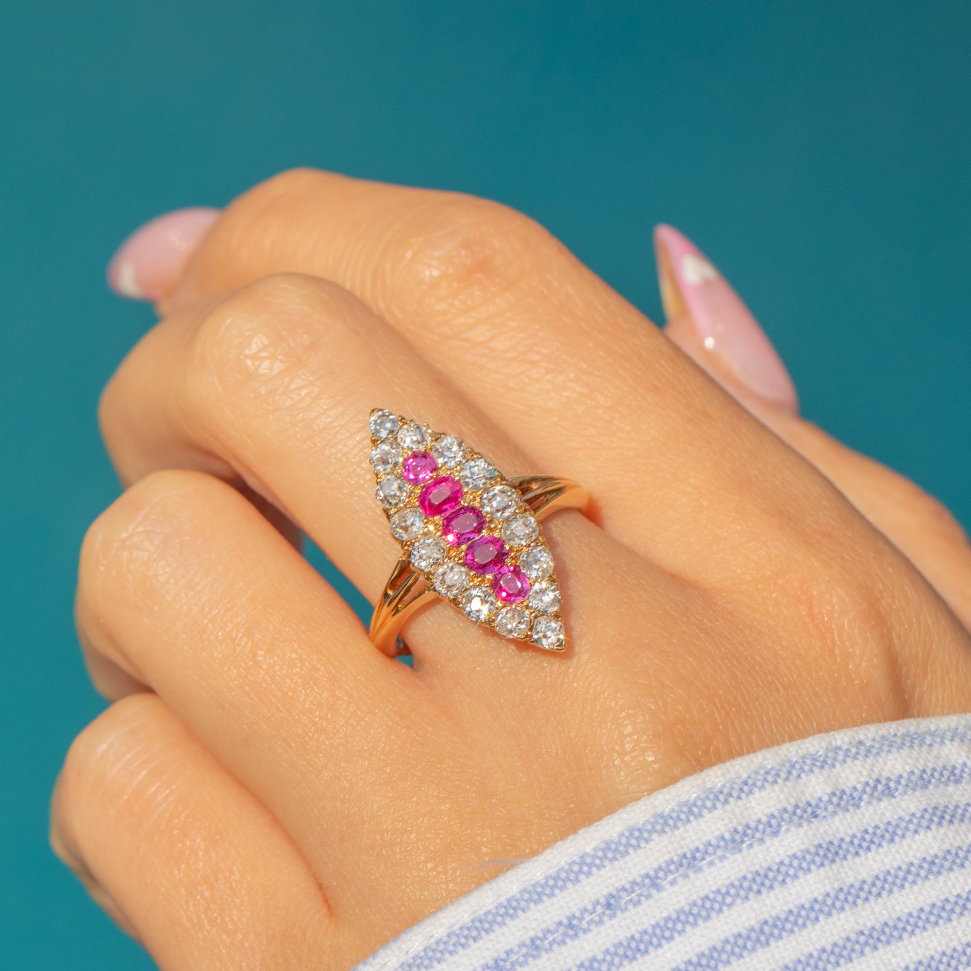 This magnificent Victorian navette ring, hallmarked Chester 1893, is crafted in rich 18ct Gold and set with a striking arrangement of Rubies and Old Mine Cut Diamonds. The vivid pink-red Rubies, totalling approximately 0.50cts, contrast beautifully against the 0.75cts of twinkling antique Diamonds, arranged in a classic elongated cluster formation.