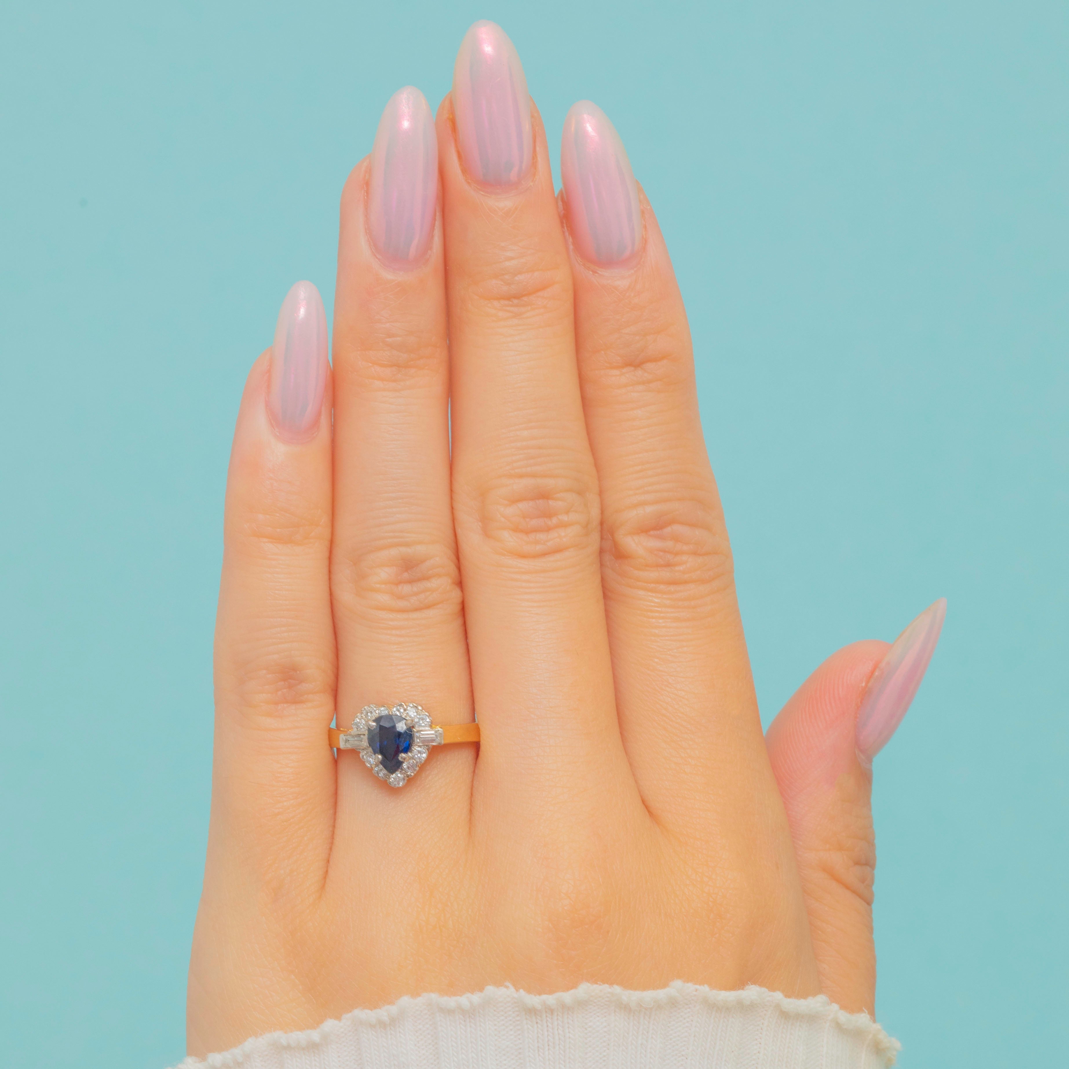 The royal blue Sapphire has been faceted wonderfully, hugged by Platinum claws and resting elegantly on a buttery 18ct Gold band. Crafted into an adorable romantic heart shape, this vintage Sapphire and Diamond ring would make the perfect choice for a unique engagement ring!
