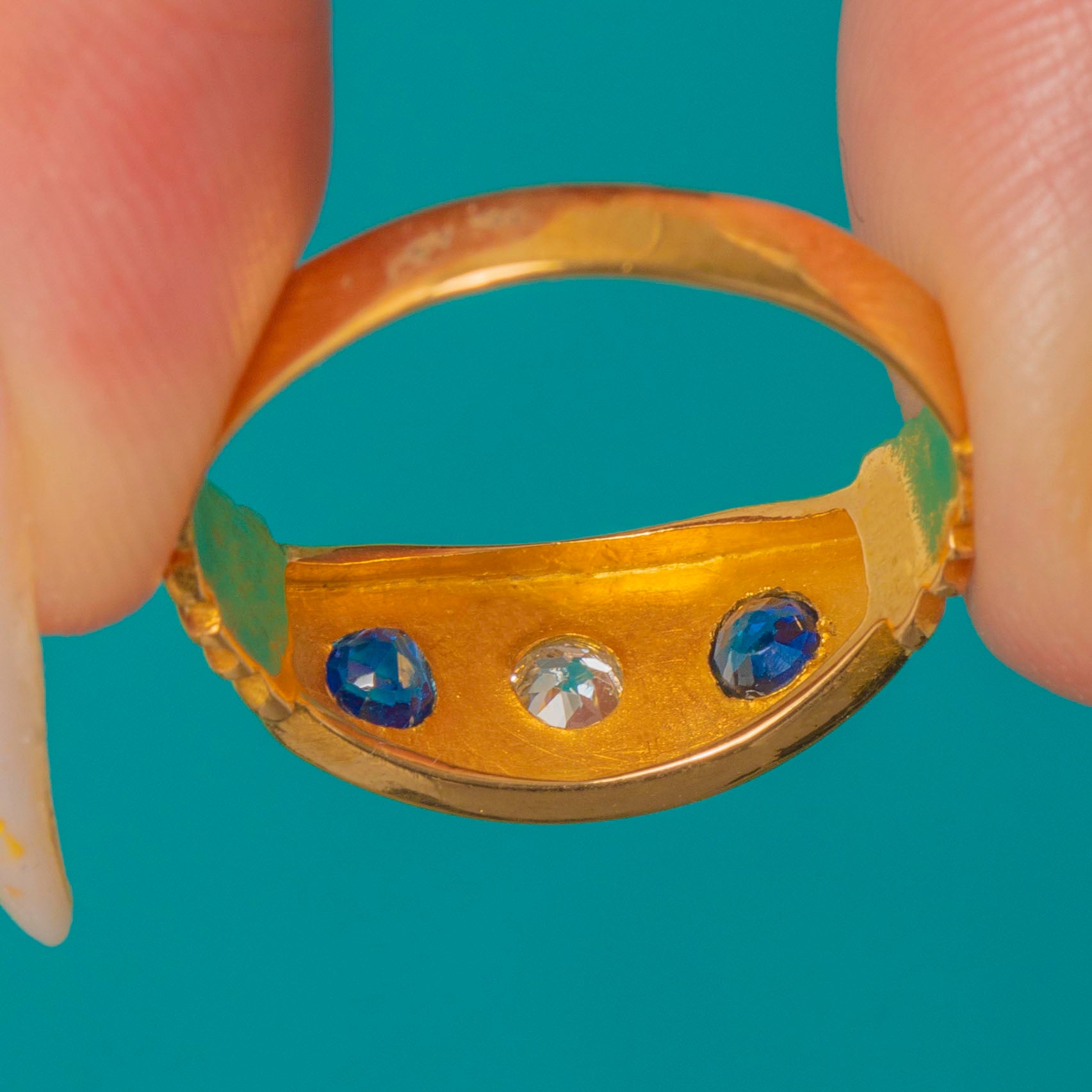 18ct Gold Sapphire Diamond Three Stone Gypsy Ring c.1889 Item added