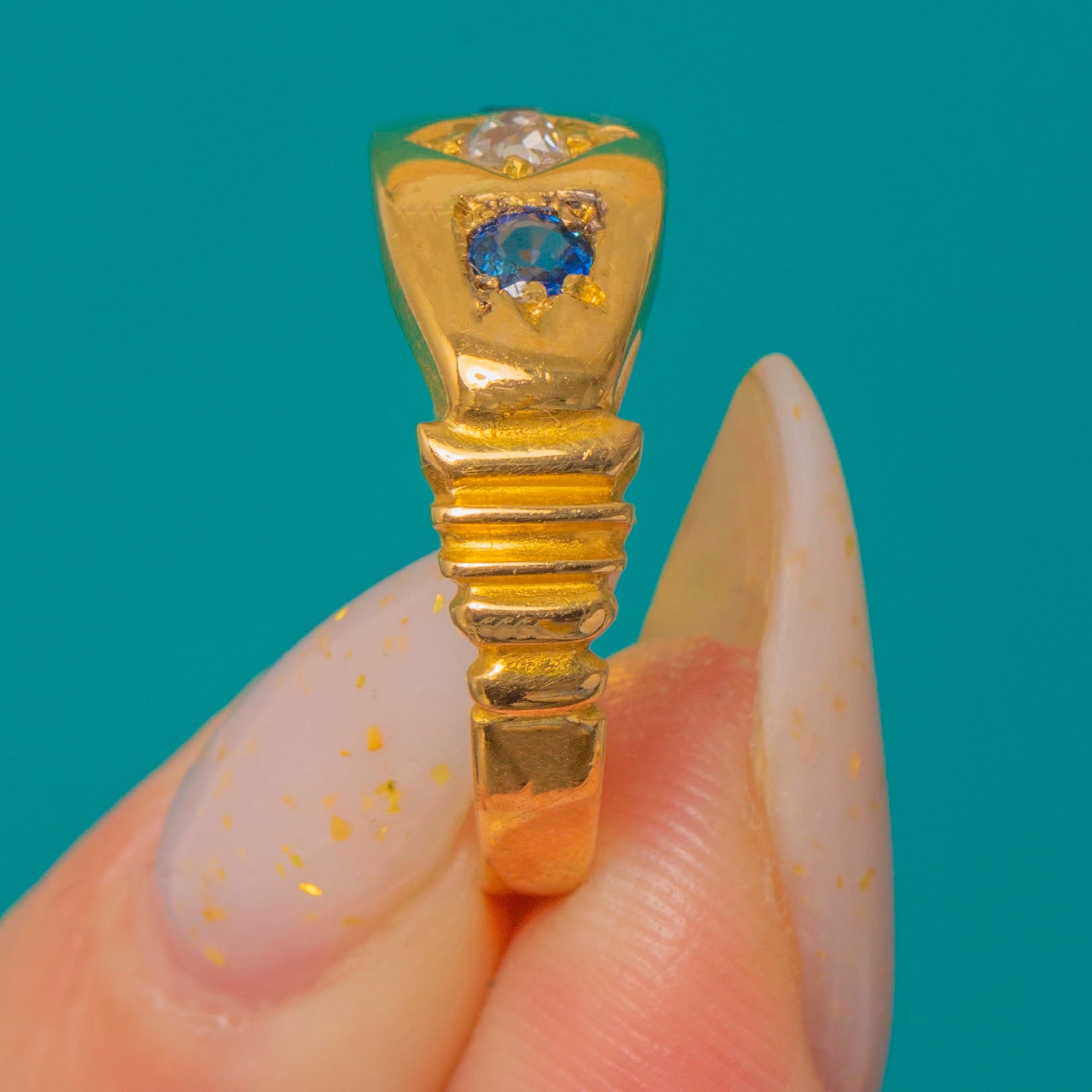 A classic Victorian three-stone gypsy ring in rich 18ct Gold, set with a lively Old Mine Cut Diamond flanked by two vivid Natural Sapphires. The low-profile, smooth gypsy setting offers effortless comfort while the trio of gems brings a refined pop of blue and antique sparkle.