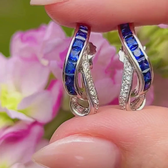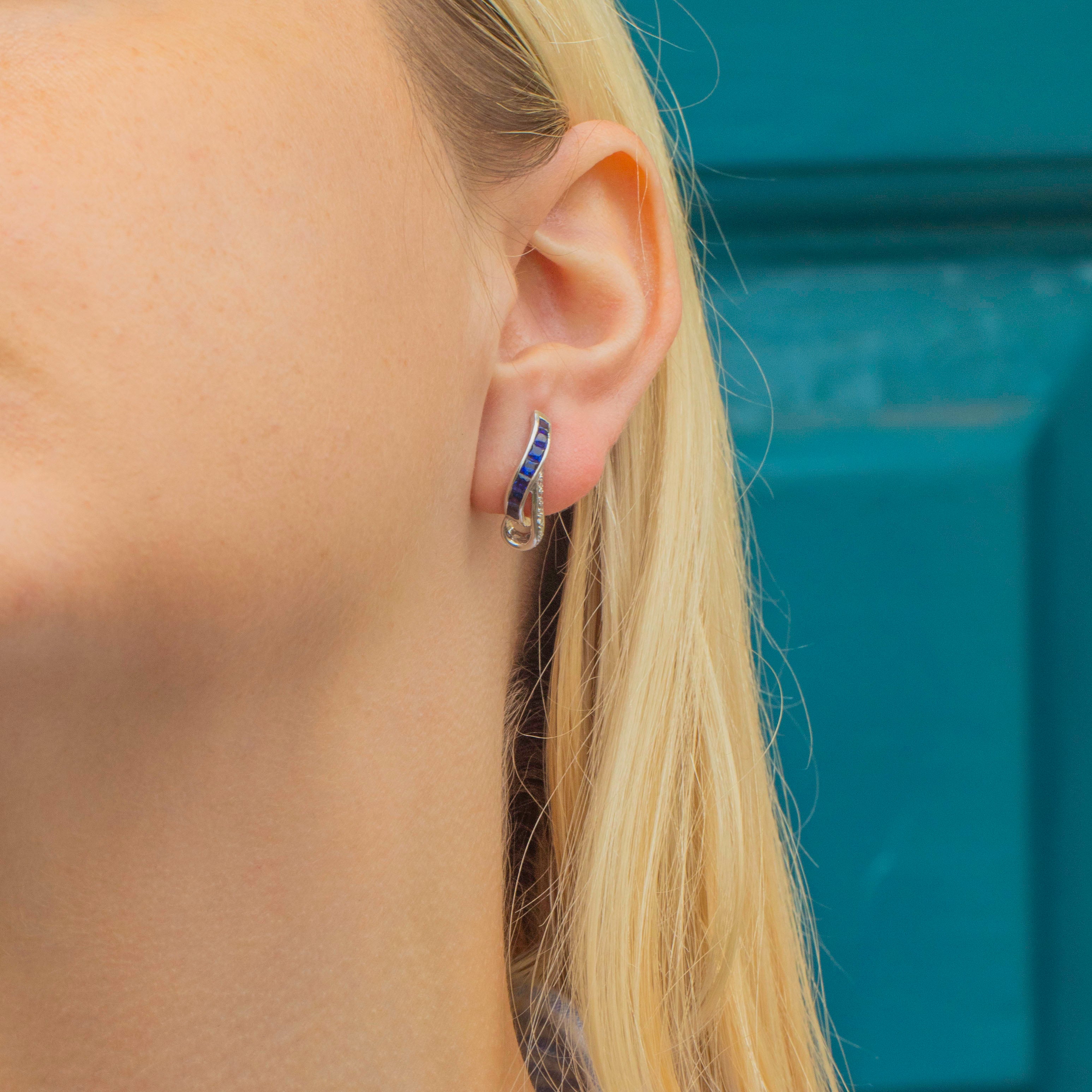 Pop these 18ct white Gold Sapphire Diamond twist earrings into your ears and embrace their elegant charm! Akin to two strands of ribbon, these Vintage earrings effortlessly caress the shape of your lobe, inlaid with a row of midnight blue Sapphires and crisp white Diamonds that catch the light beautifully.